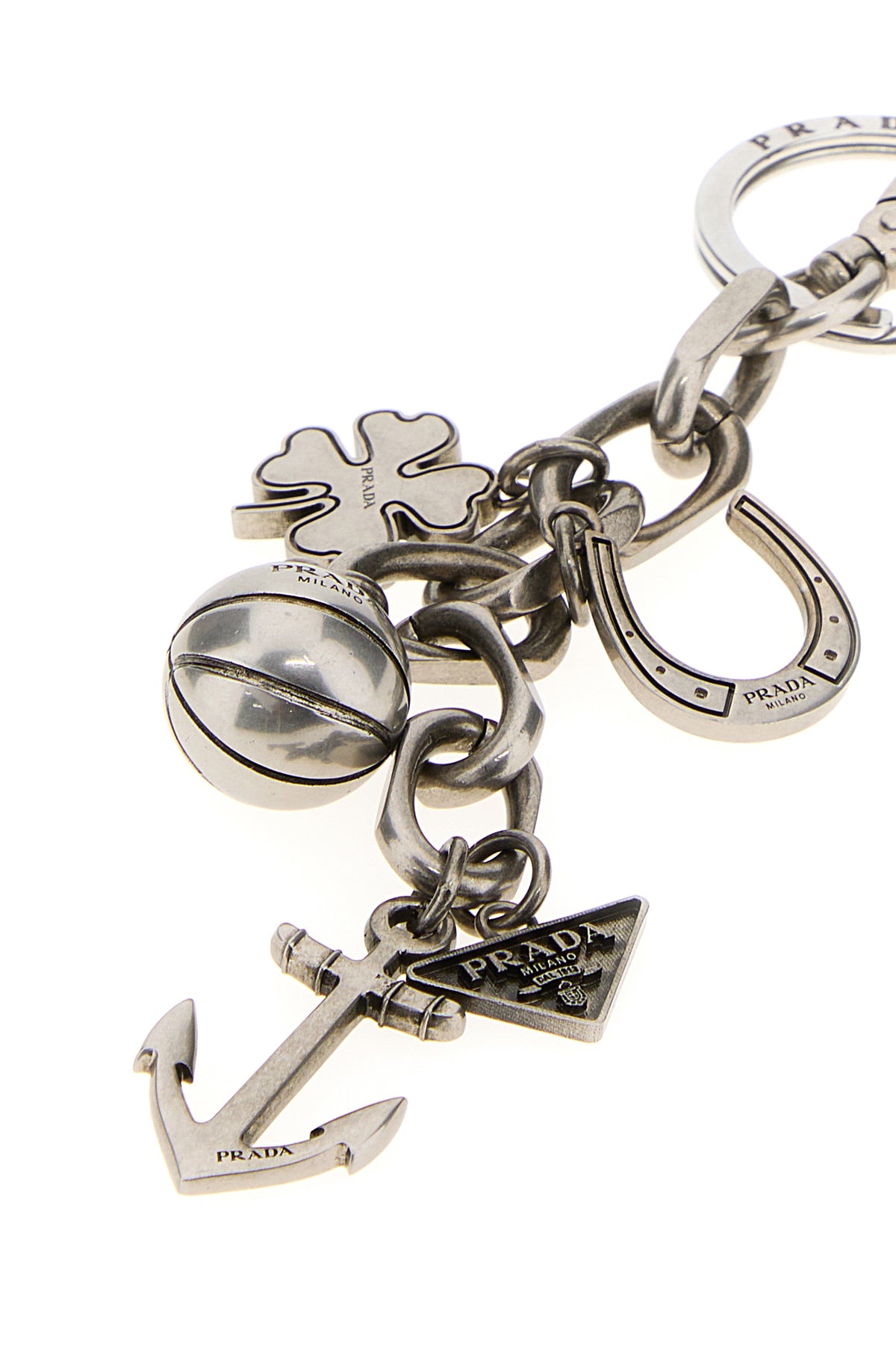 Key ring realized in silver-tone pleated metal.