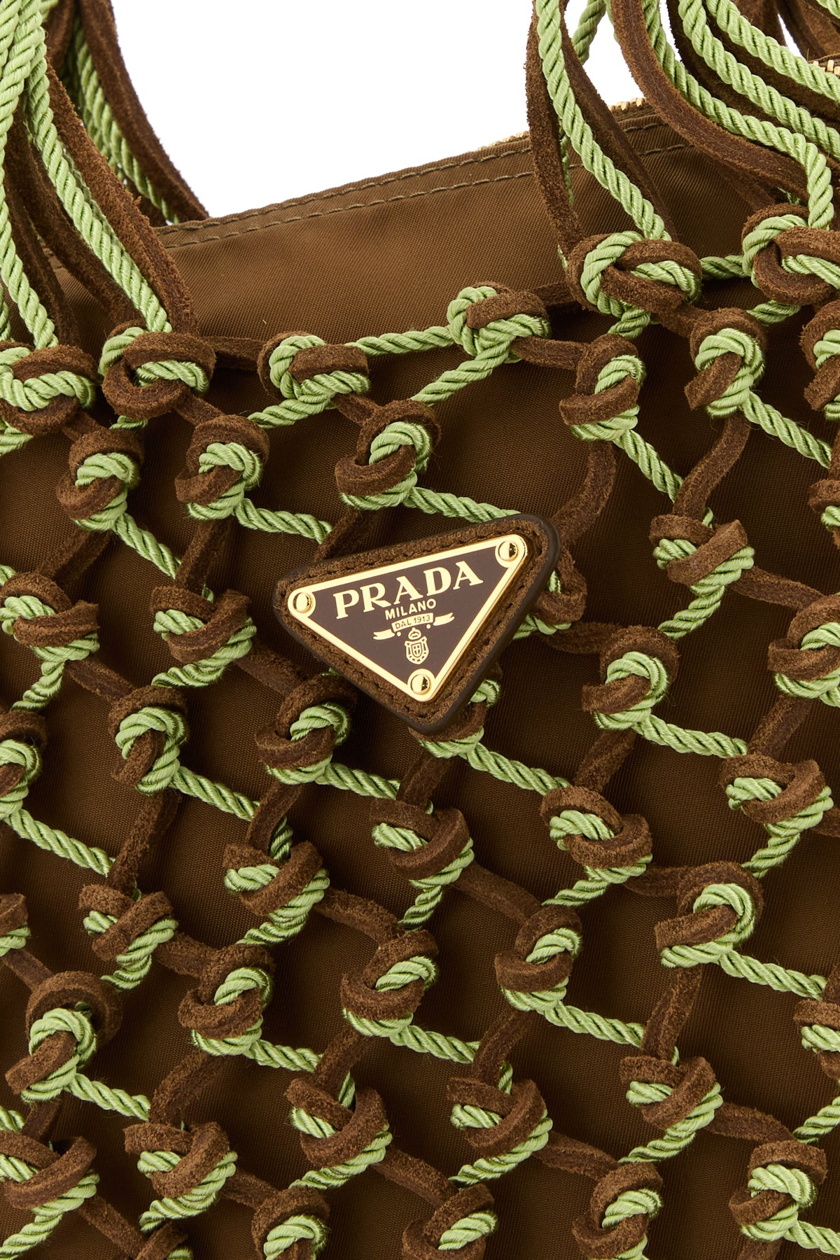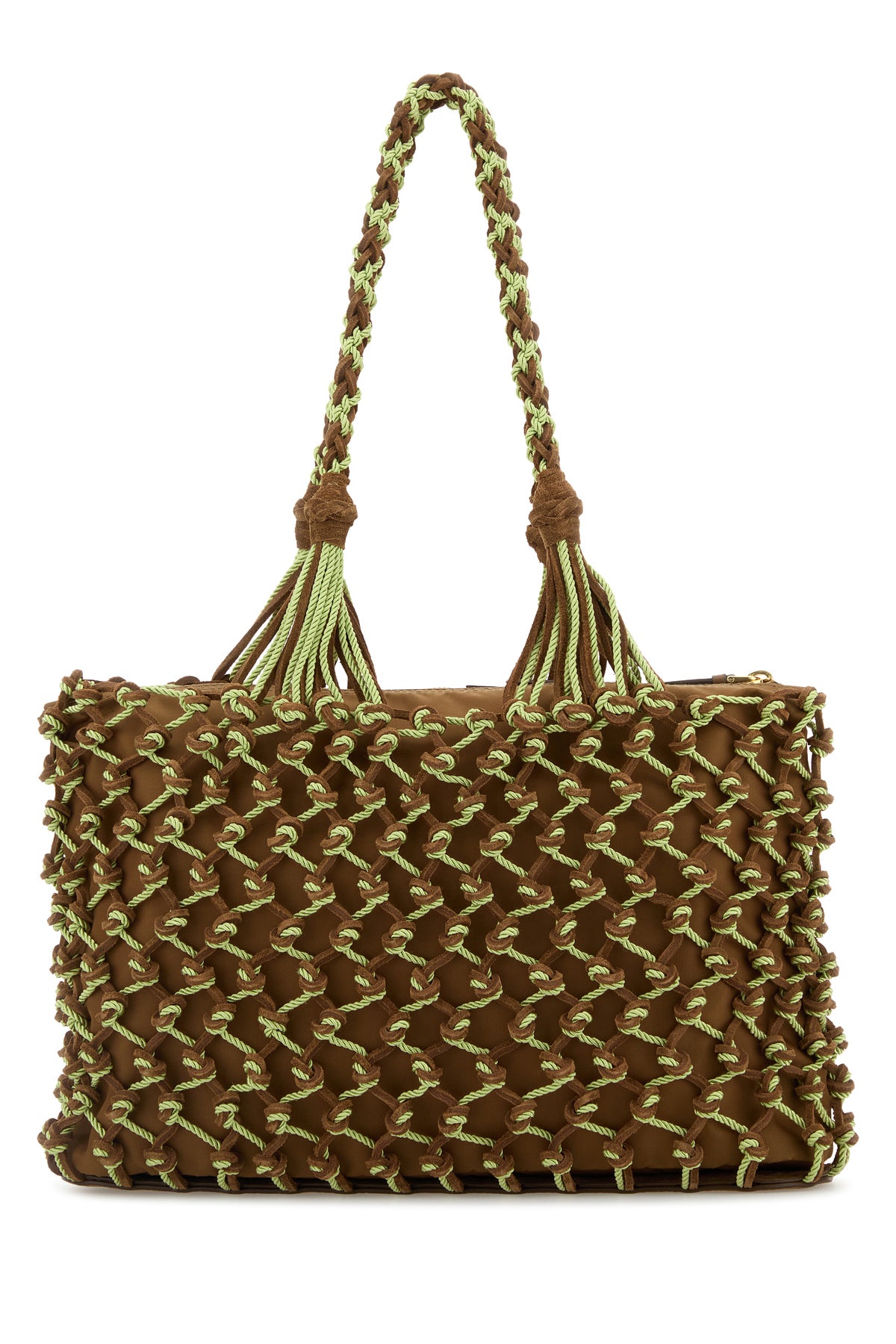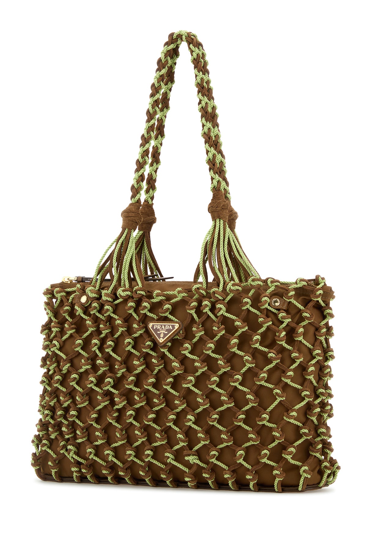 Shopping bag realized in suede and fabric mesh enriched by iconic logoed meal triangle at the front.