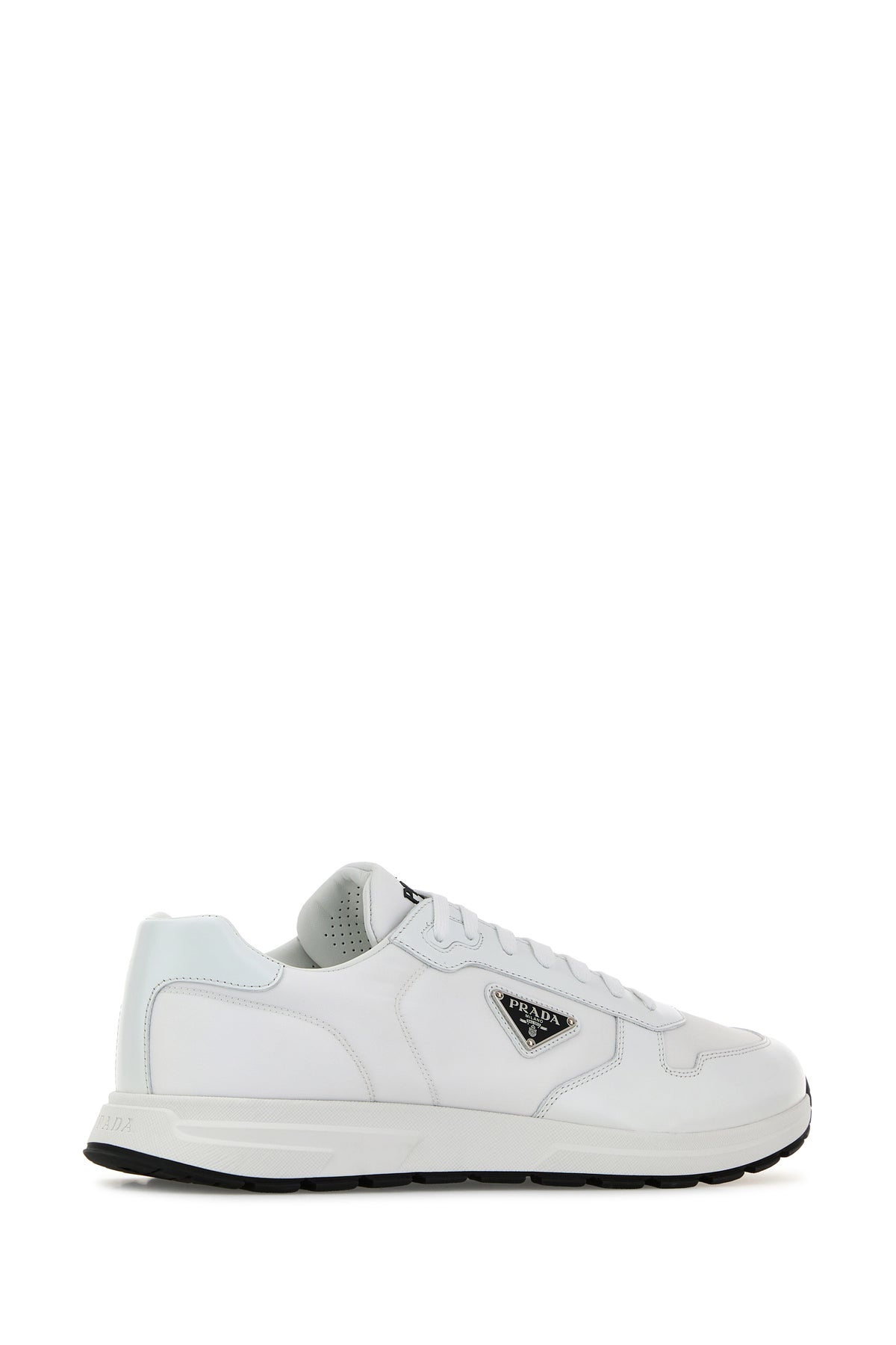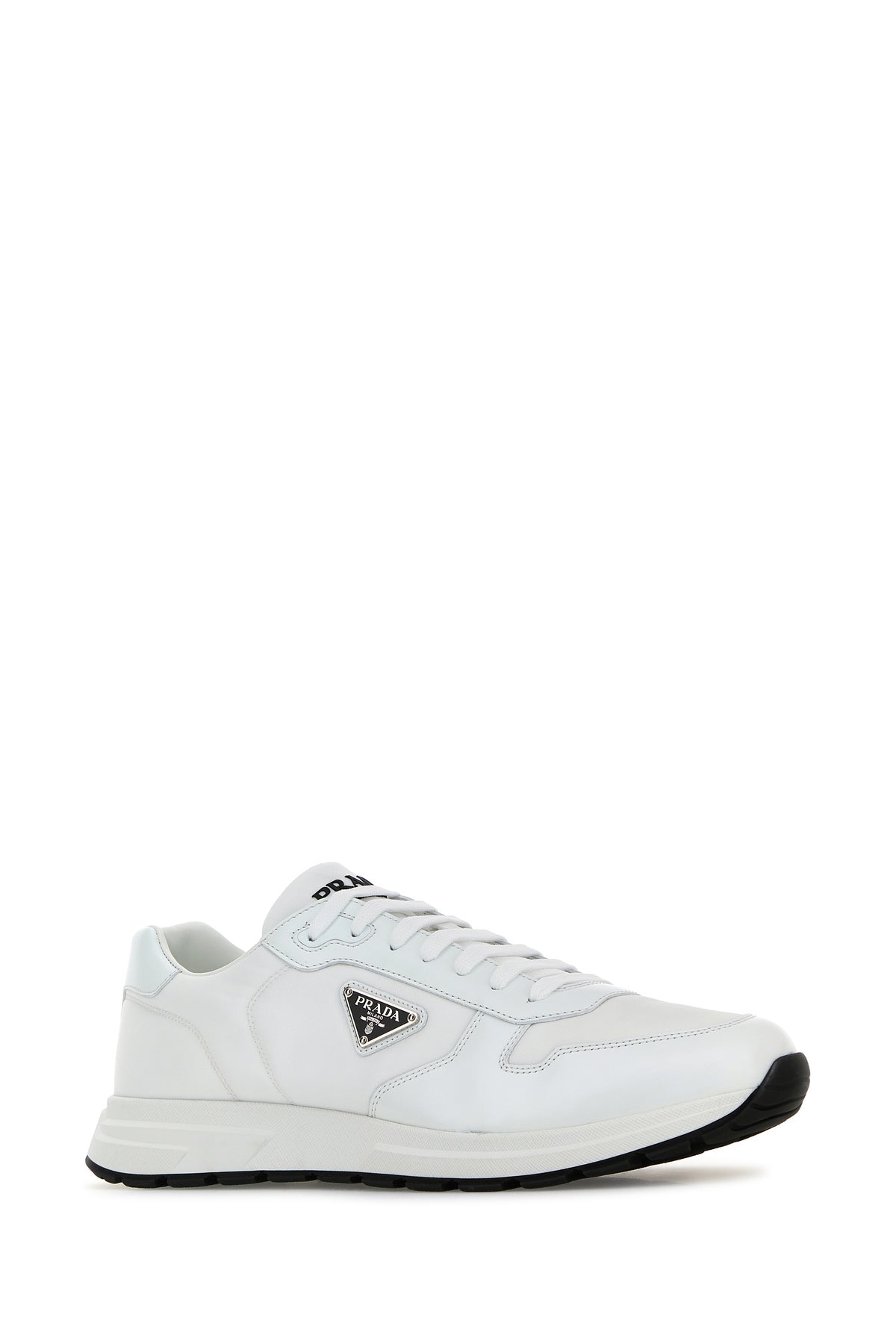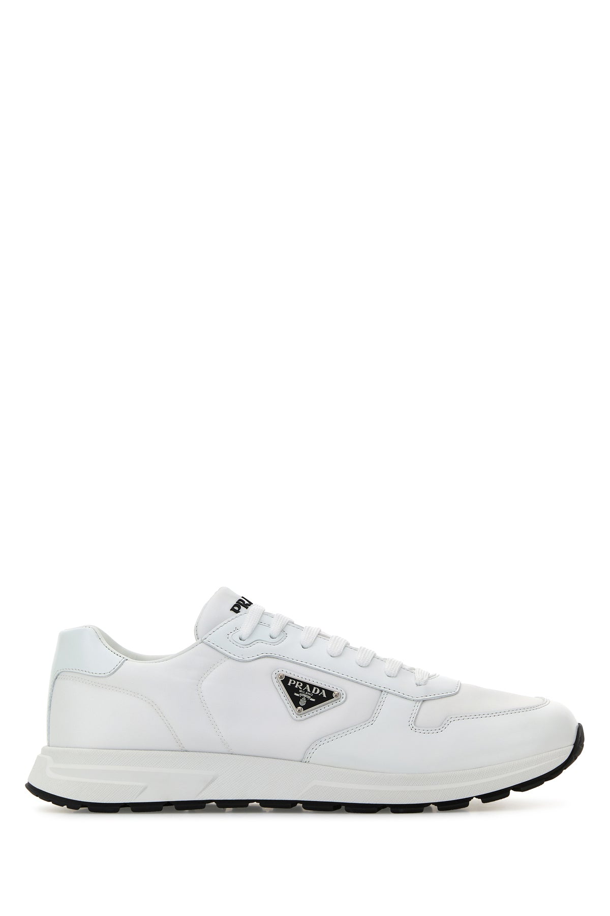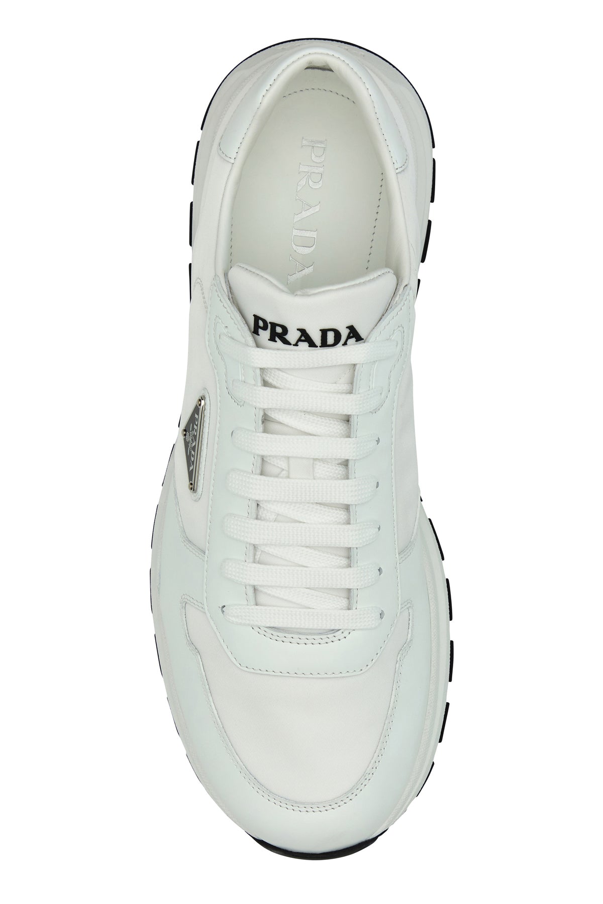 Sneakers realized in nylon and polished-finish leather inserts characterized by embossed logo at the back enriched by iconic logoed metal triangle on the side.