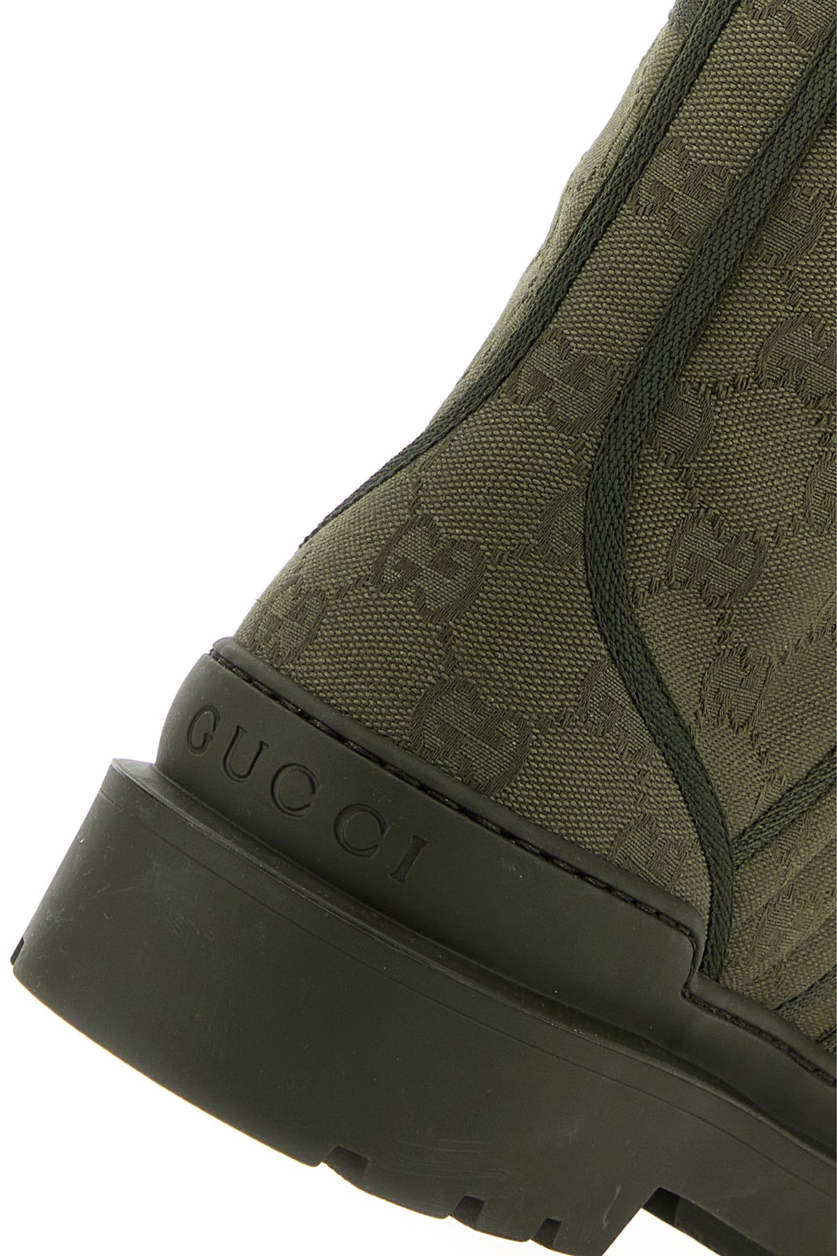 Ankle boots realized in GG fabric characterized by embossed Gucci motif at the back.