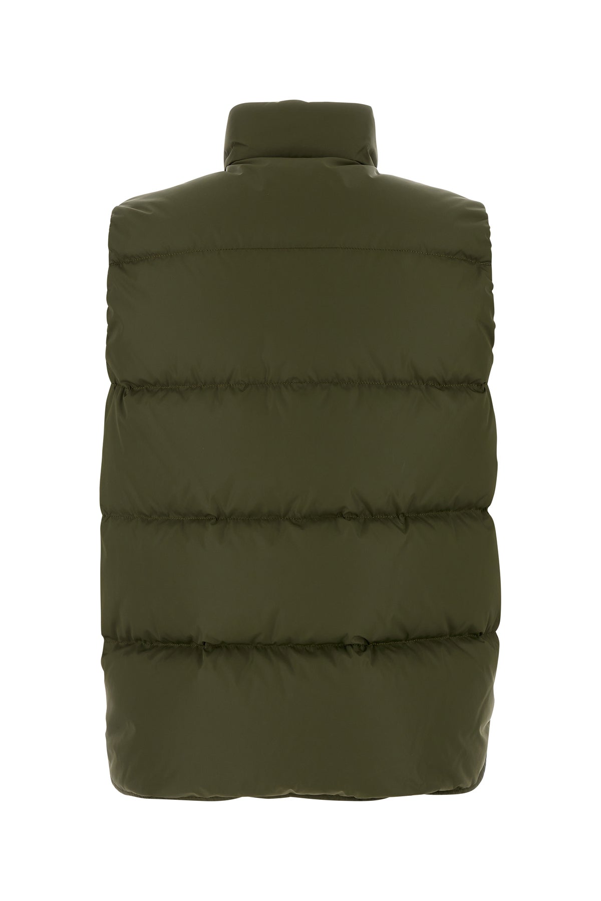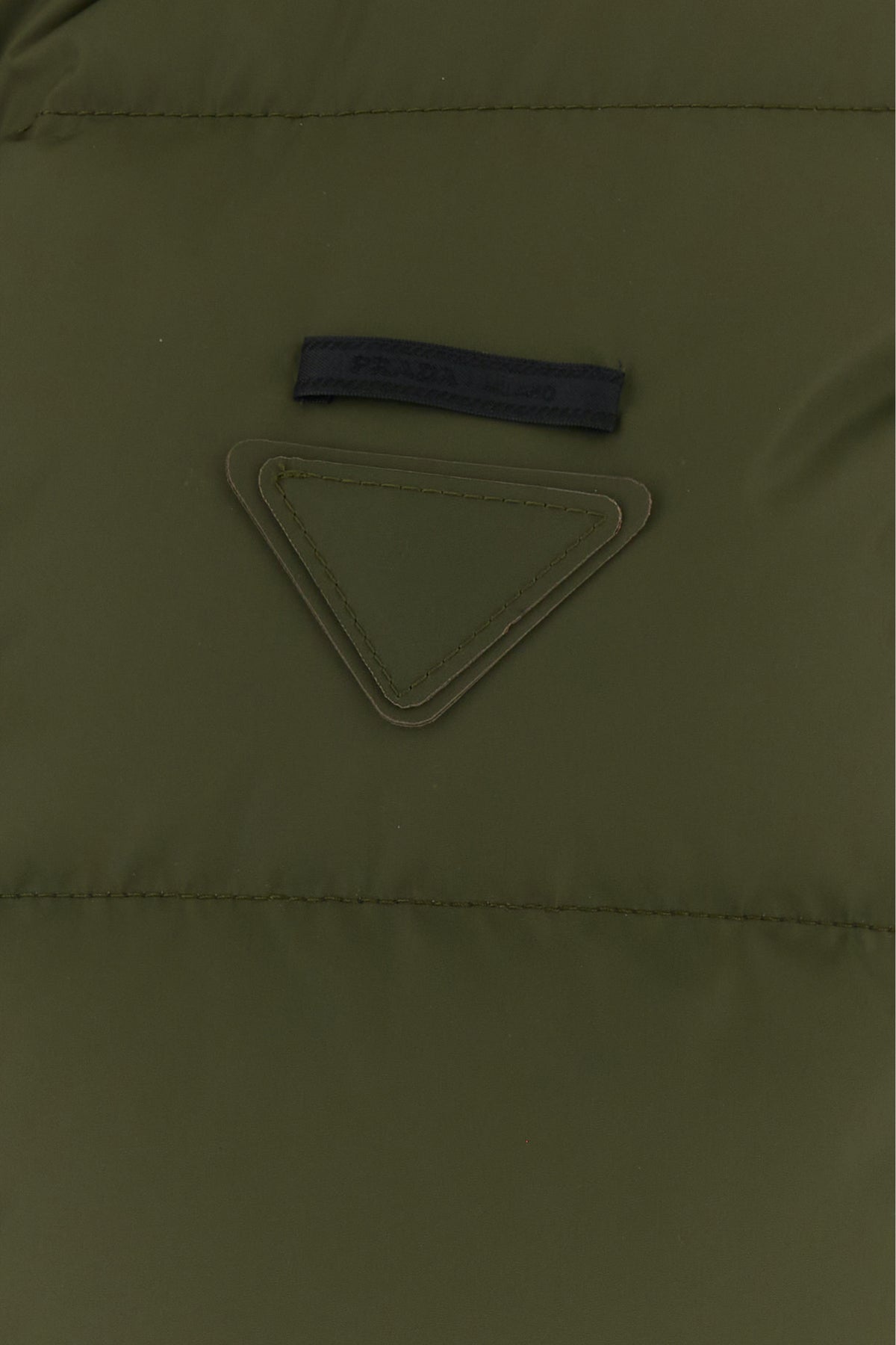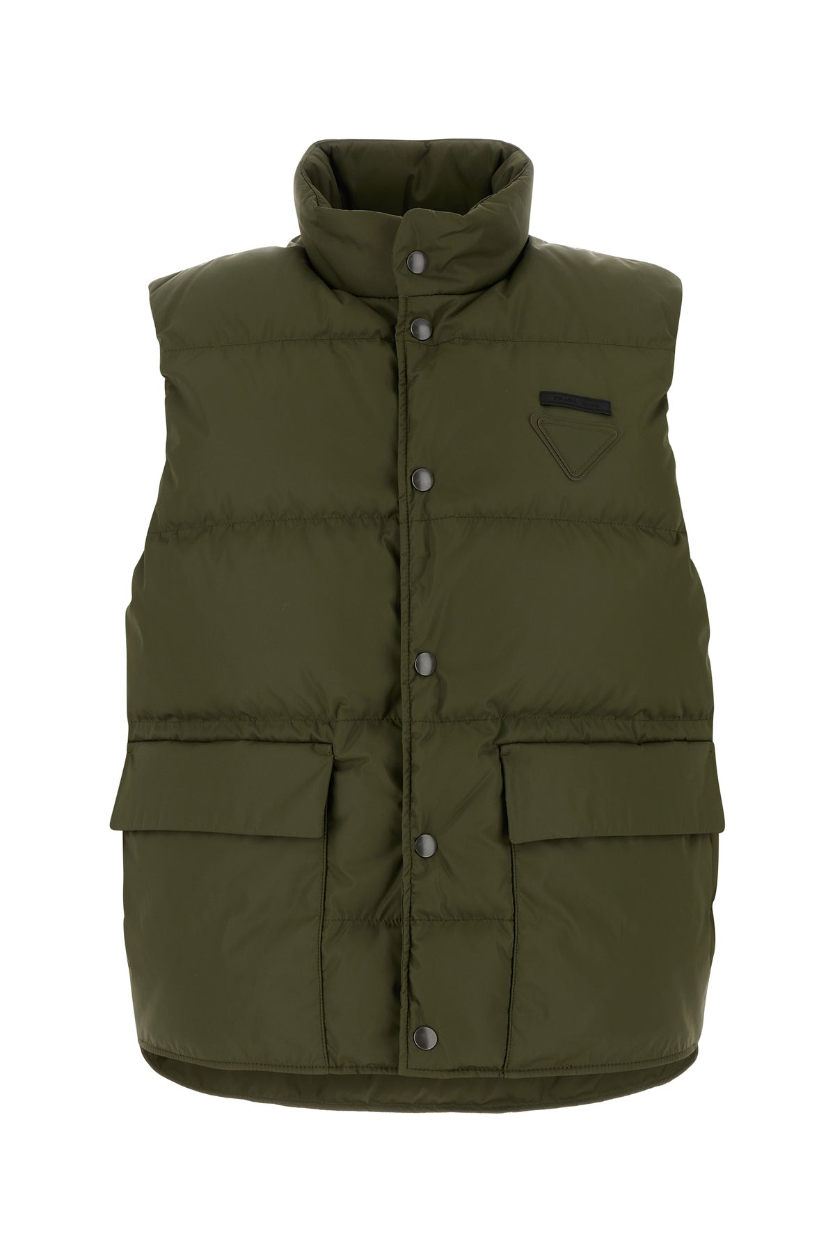 Sleeveless down jacket realized in quilted Re-Nylon enriched by tonal fabric iconic triangle and logoed label on the chest.