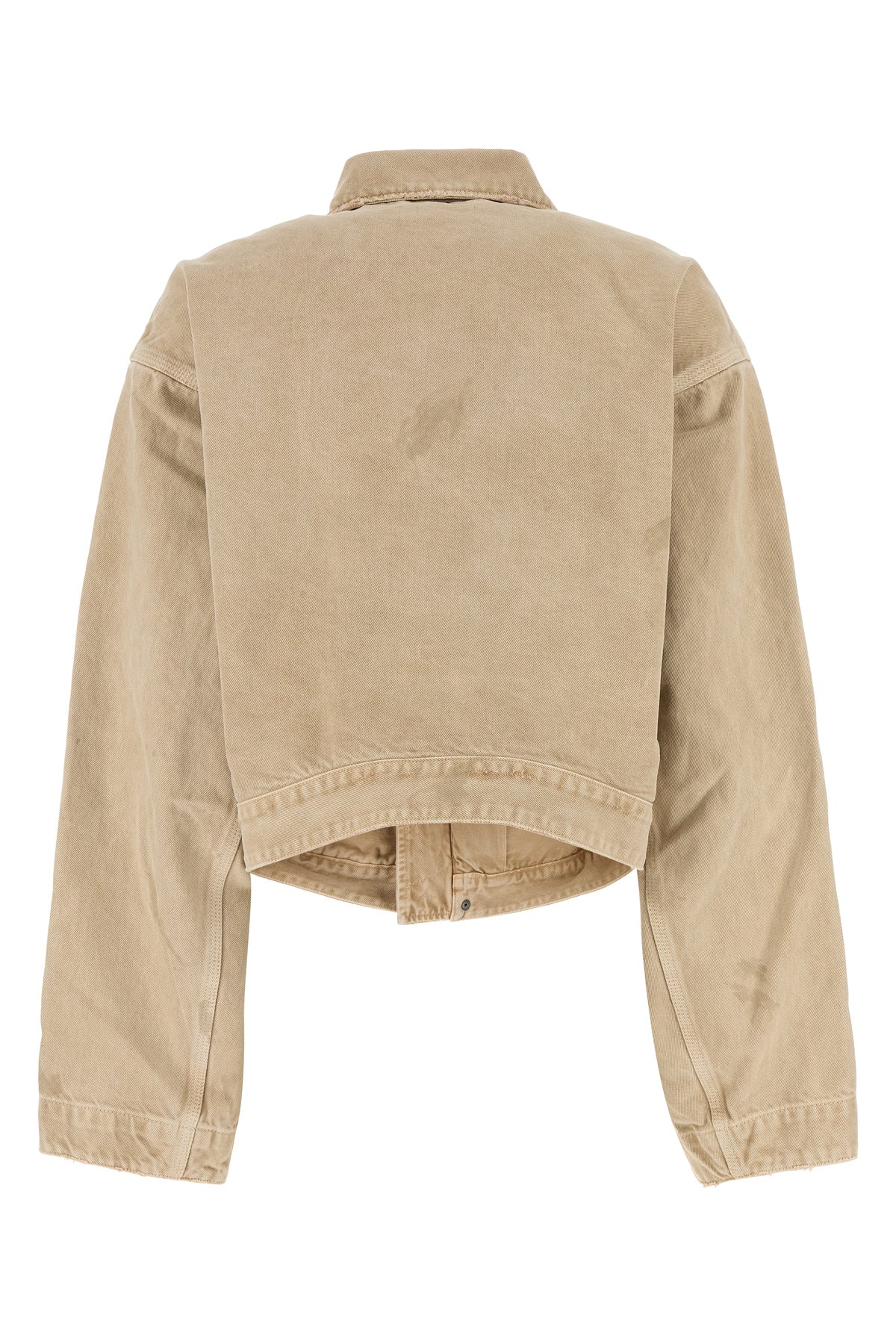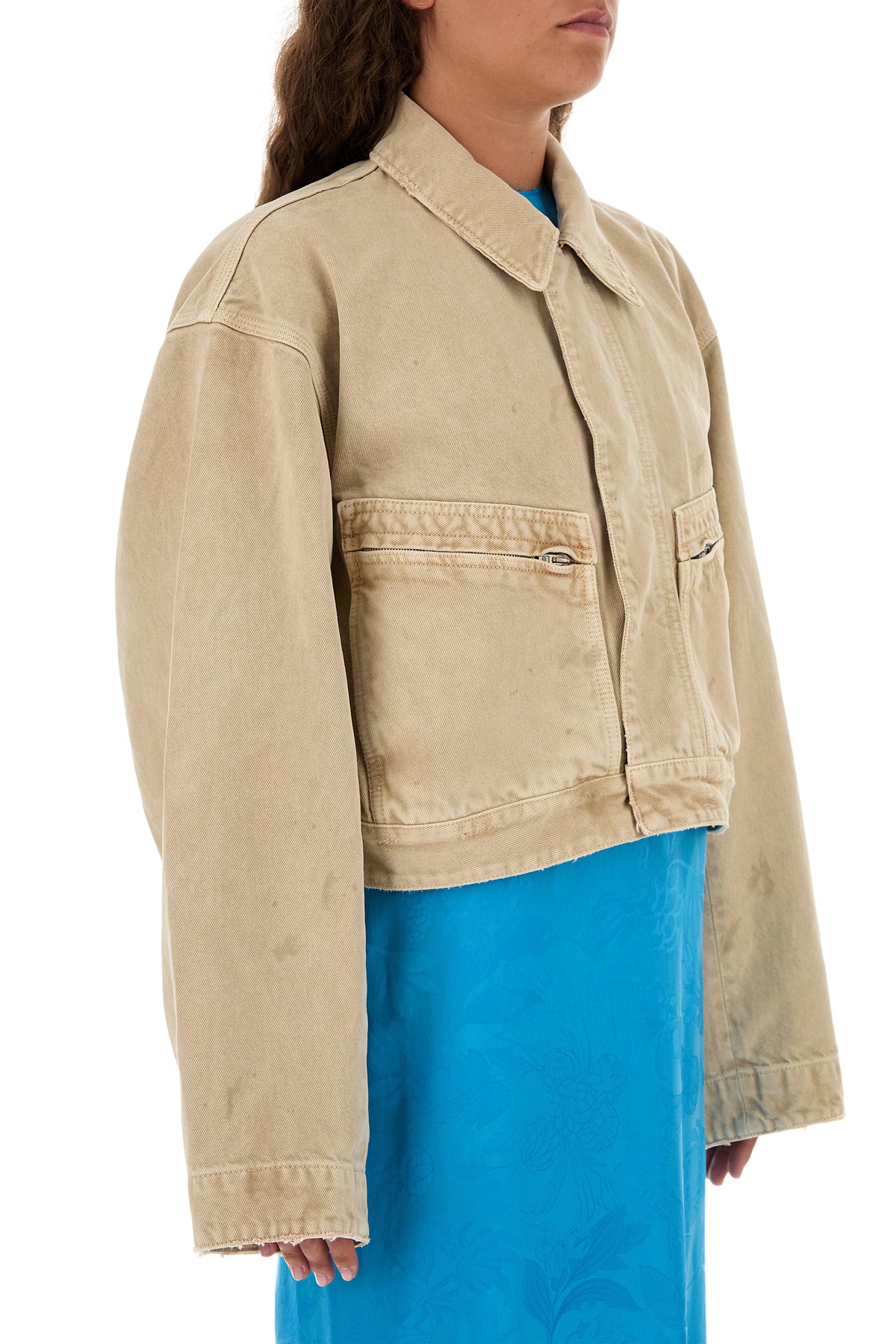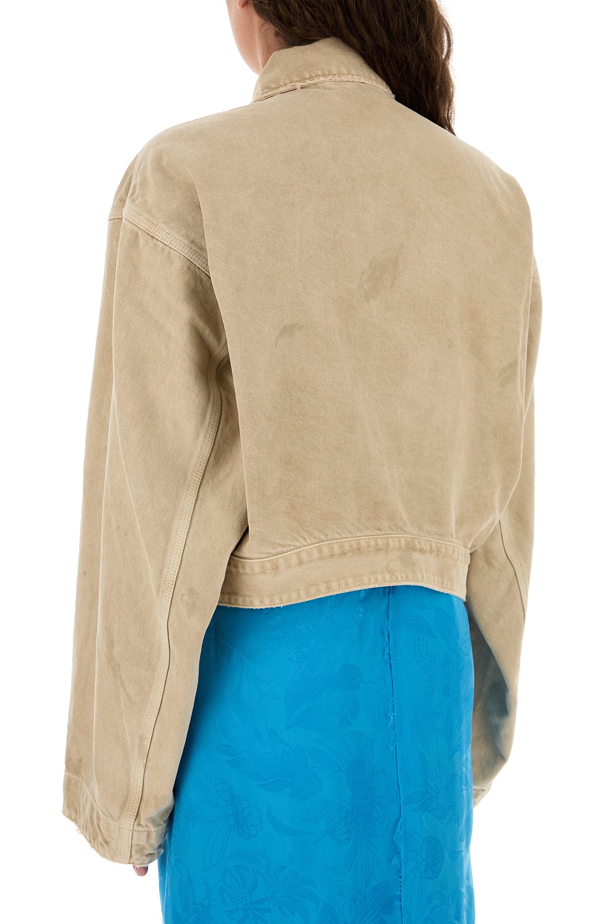 Cropped-cut jacket realized in stonewashed pure cotton denim with intentional dirties enriched by Balenciaga label at the front.