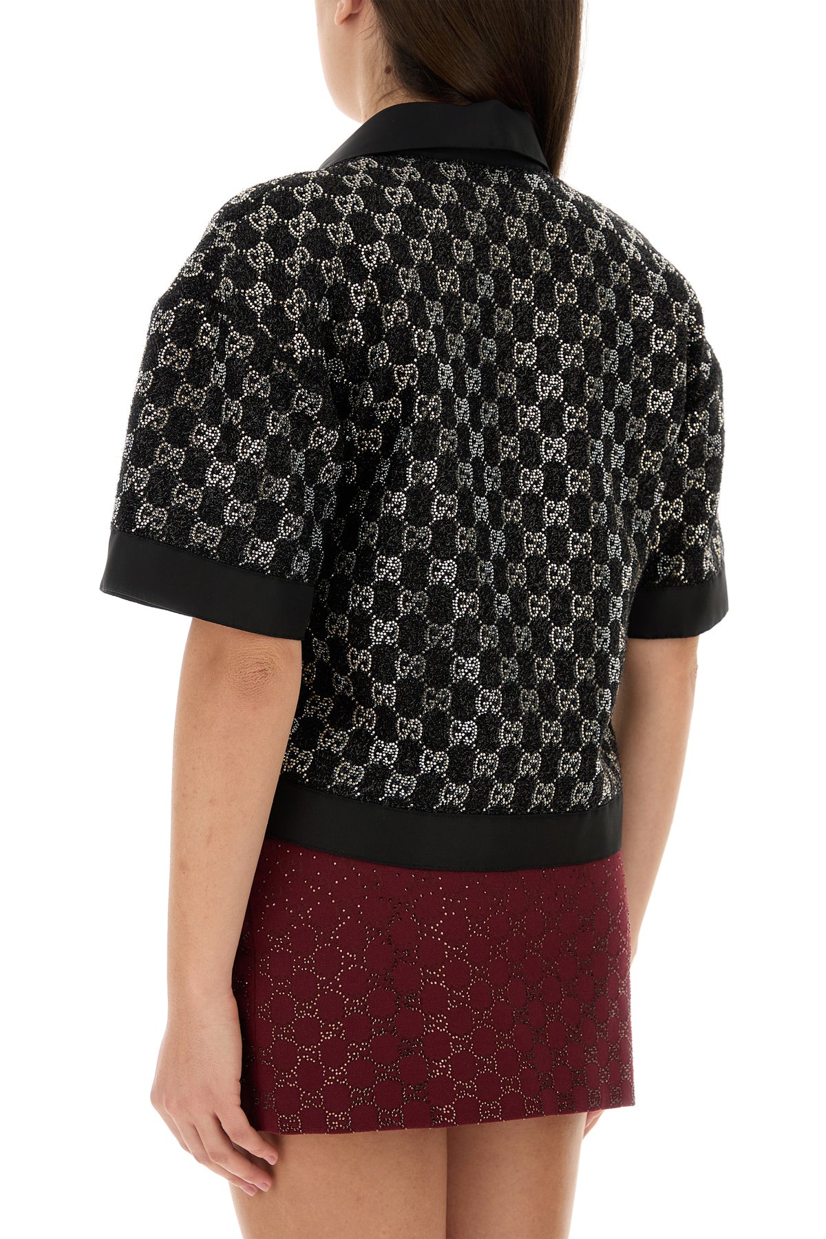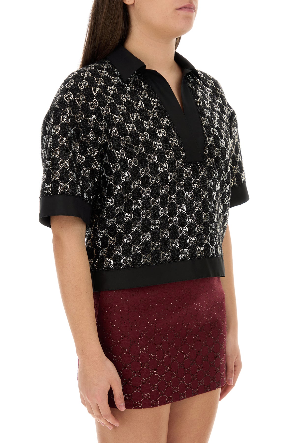 Polo shirt realized in boucle with lurex threads enriched by rhinestones GG motif on the entire surface.