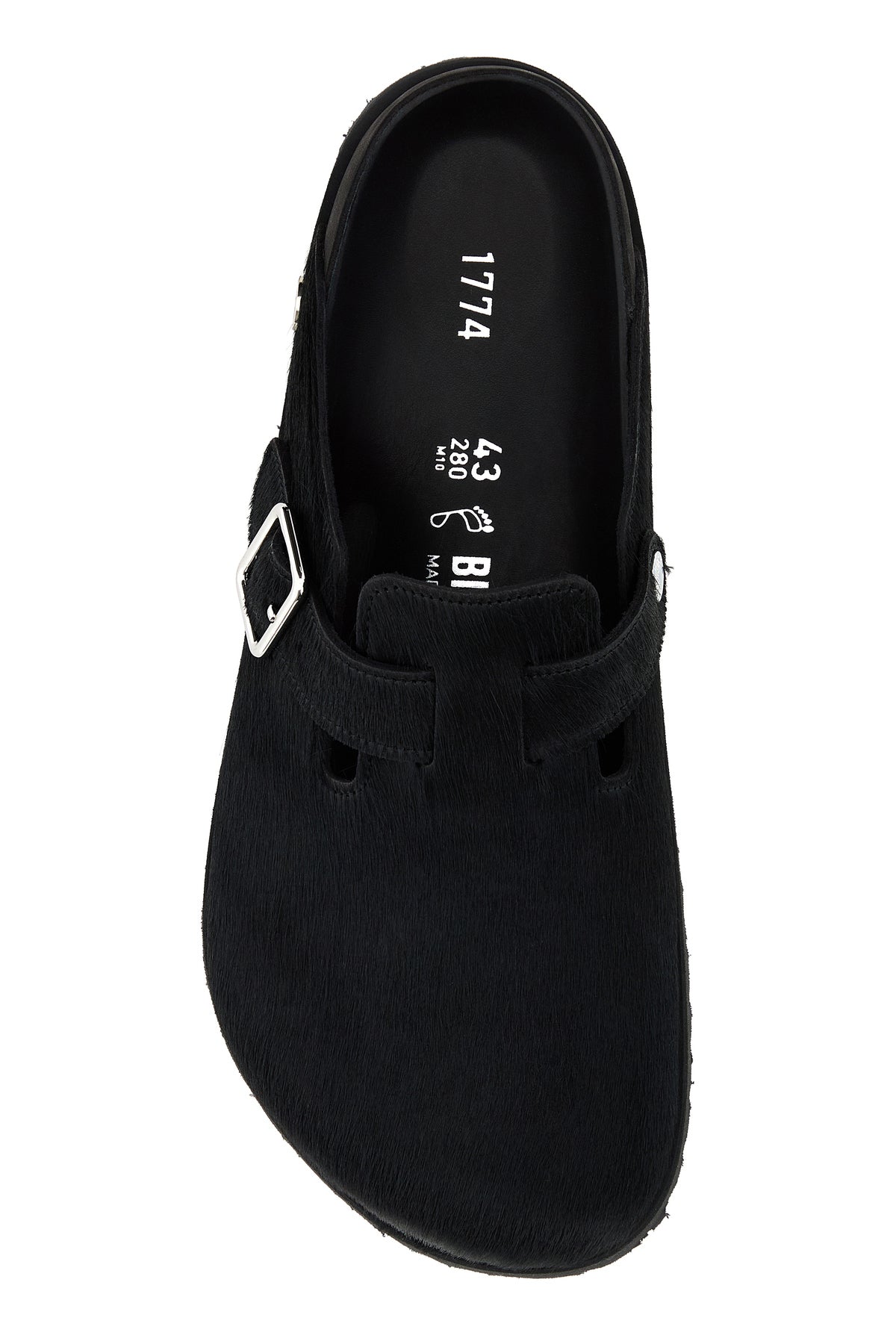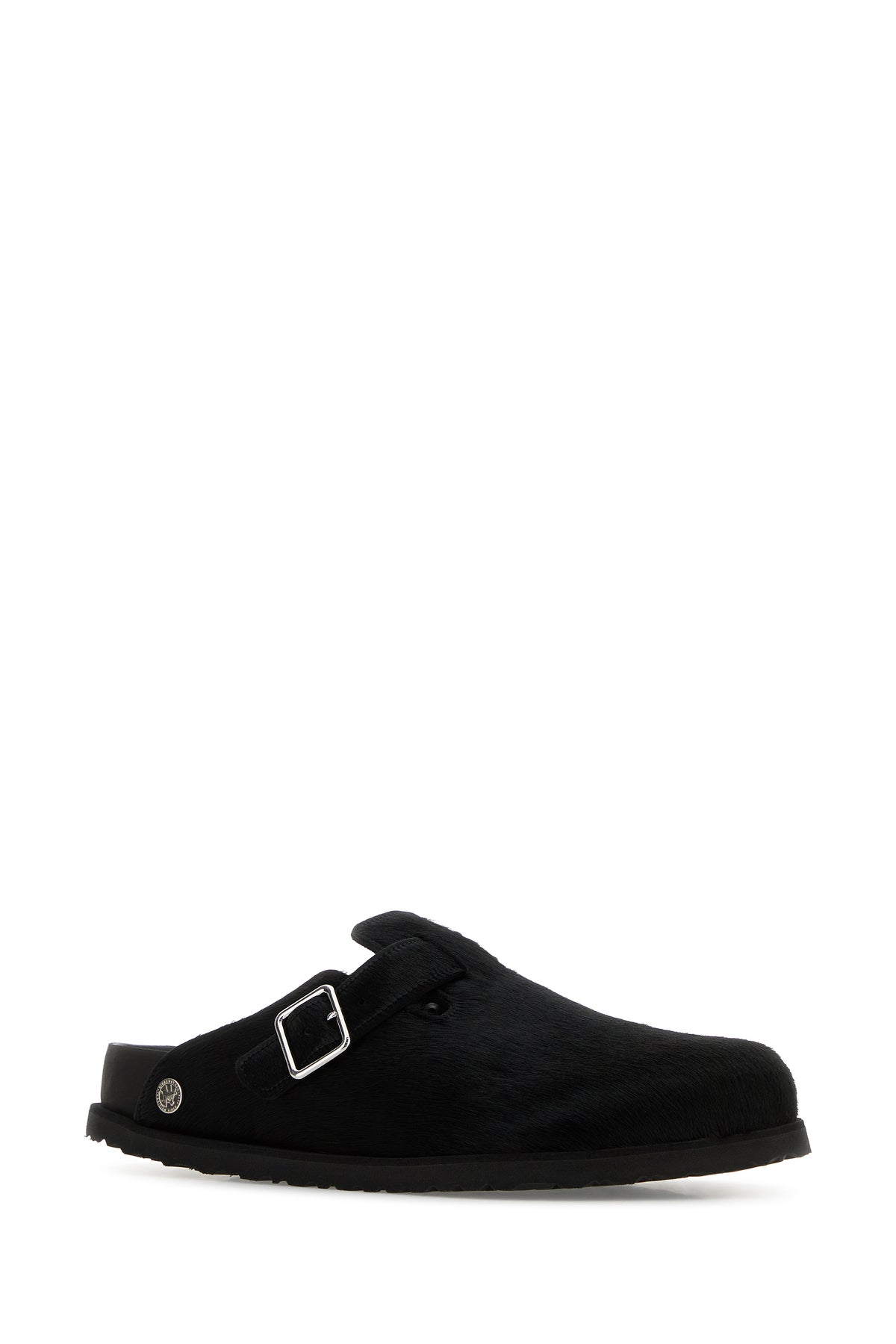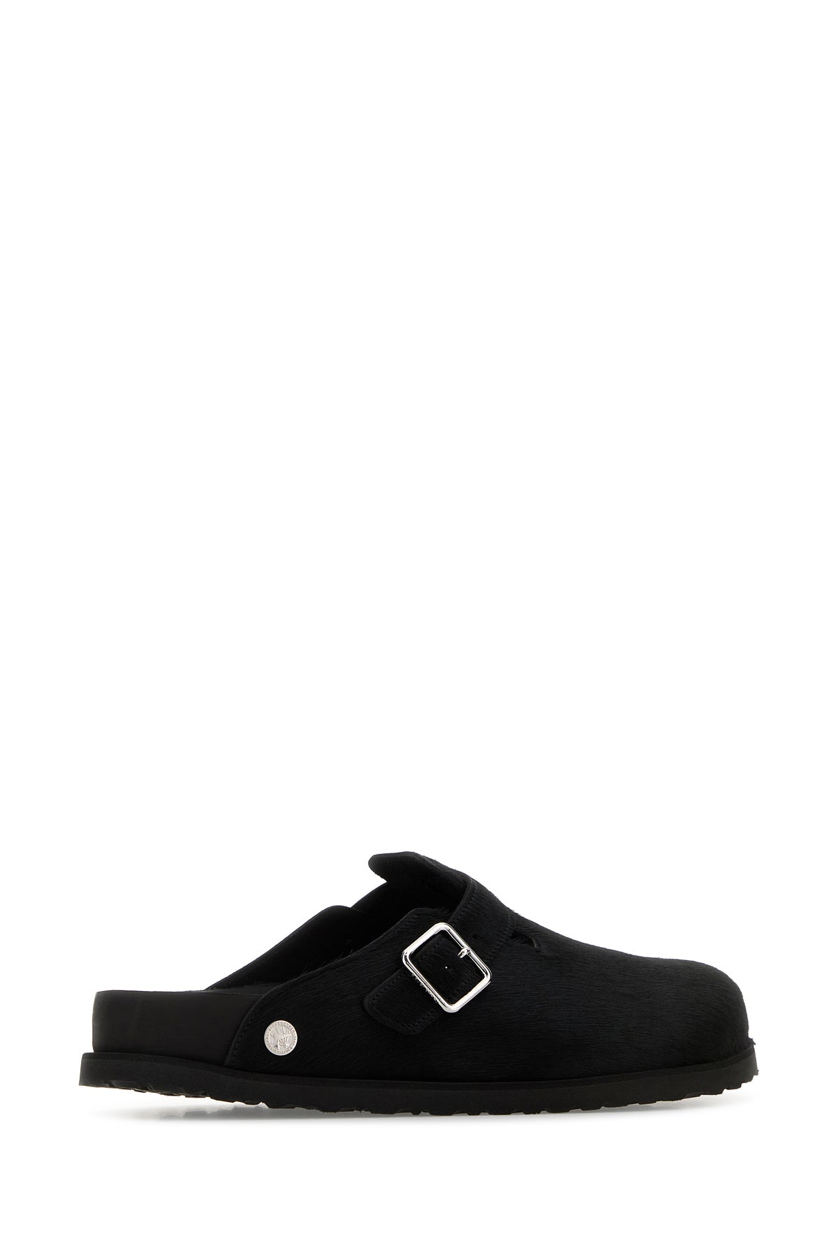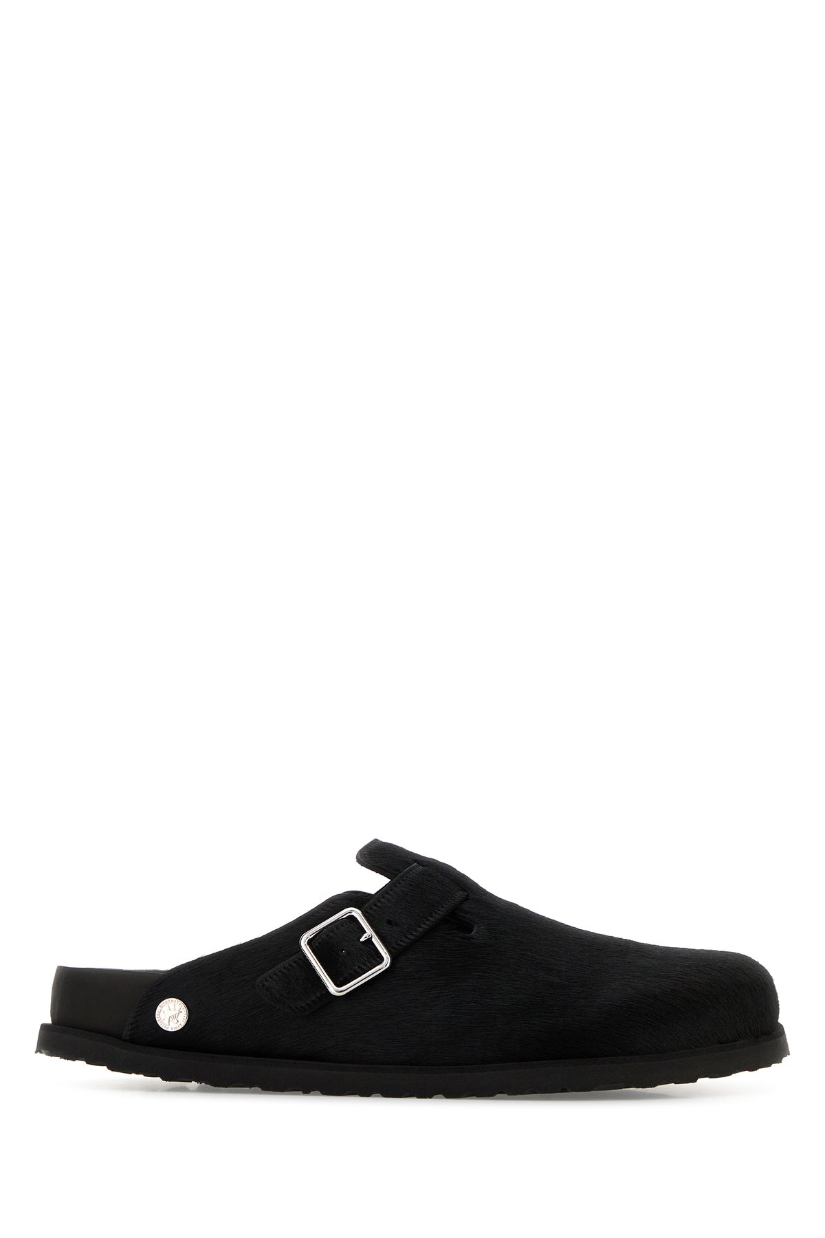 Slippers realized in calf hair enriched by logoed metal detail on the side.