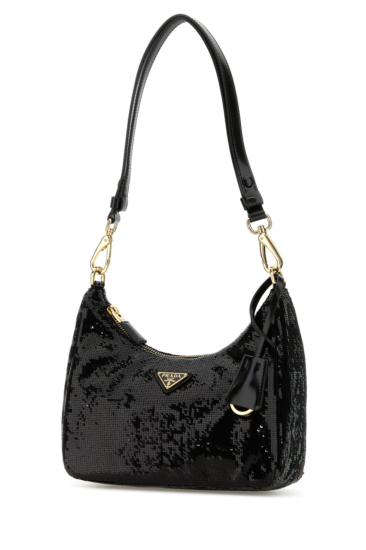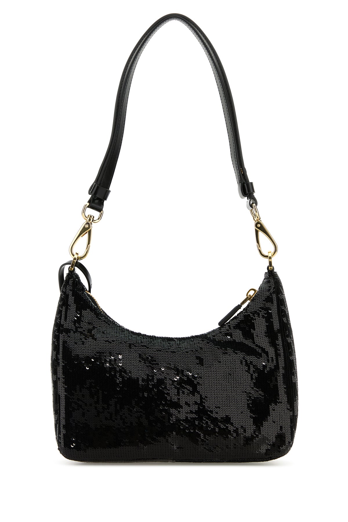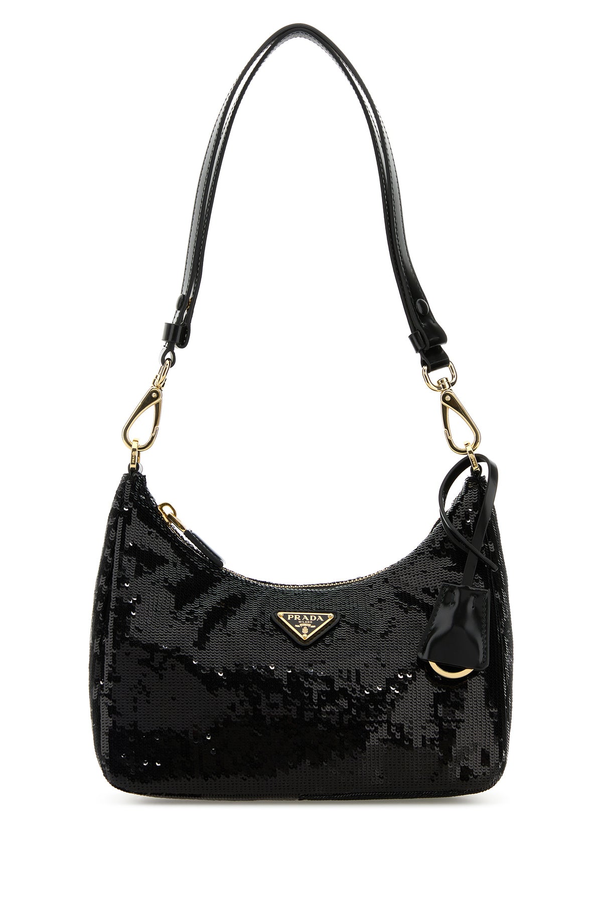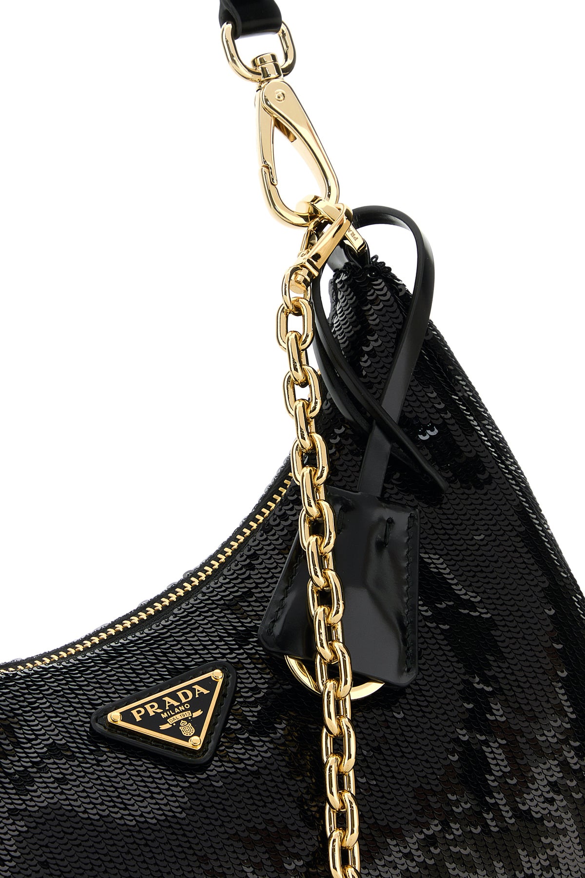 Shoulder bag realized in fabric entirely covered by sequins enriched by iconic logoed triangle at the front and detachable leather logoed accessory with metal key ring.