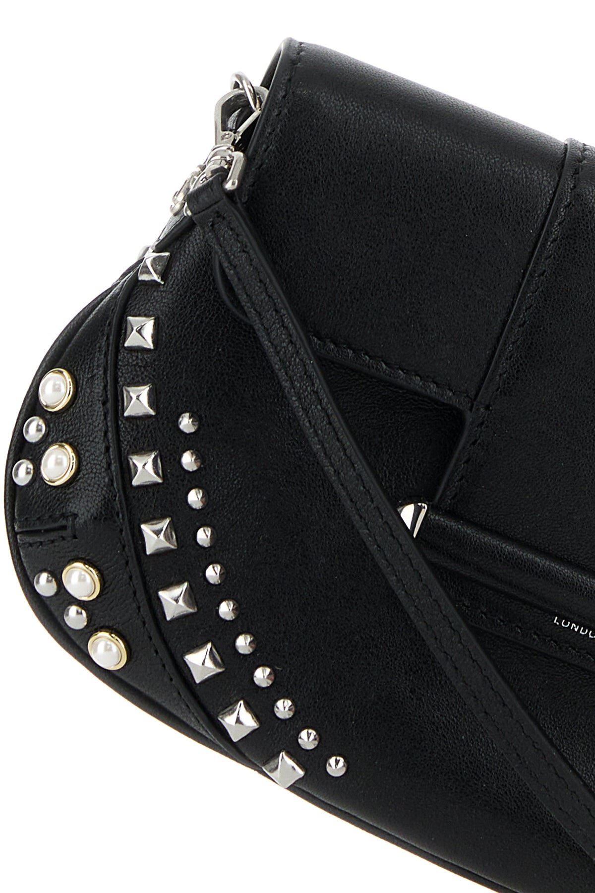 Clutch realized in slightly pebble leather characterized by laminated printed logo on the flap enriched by metal studs on the hemline.