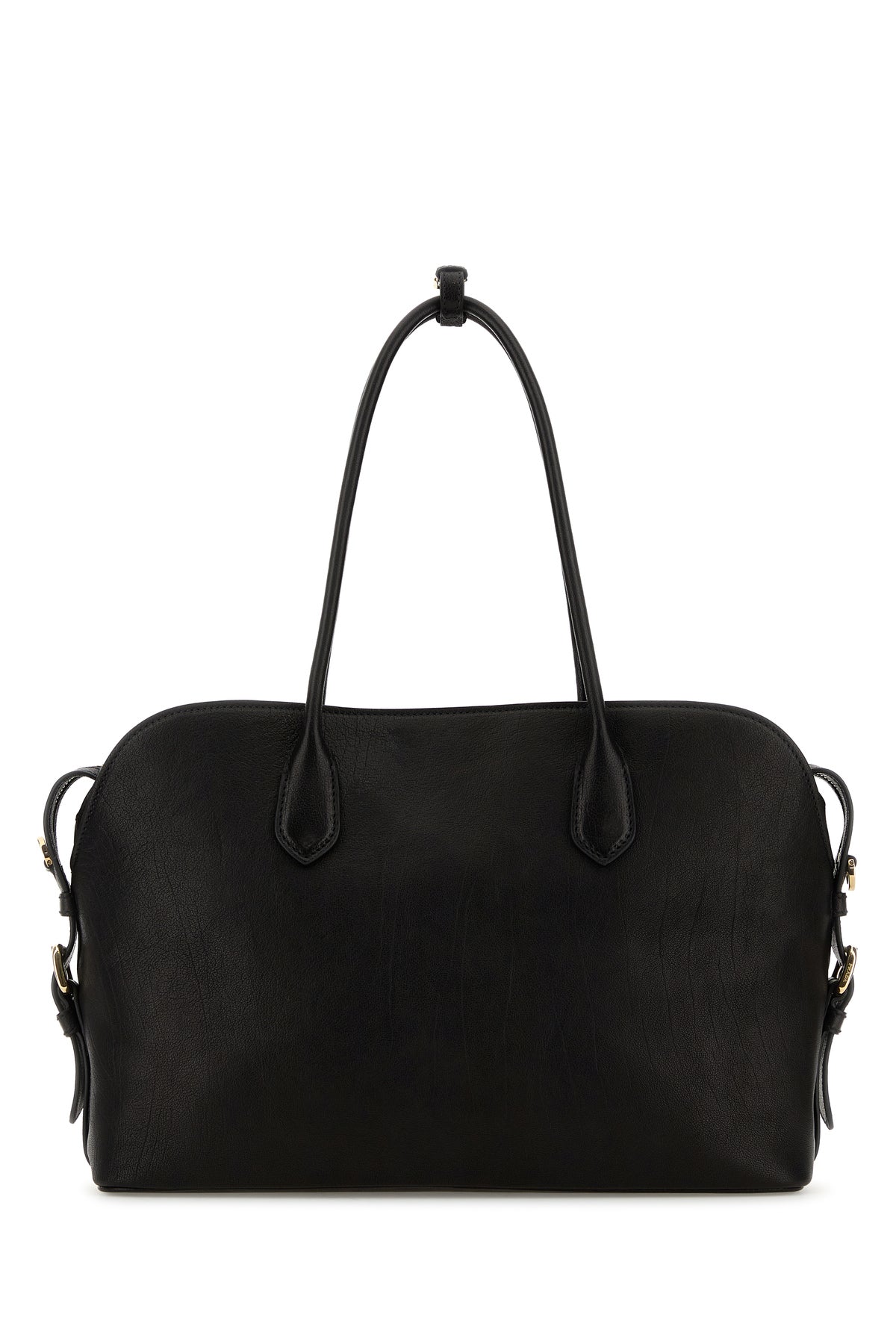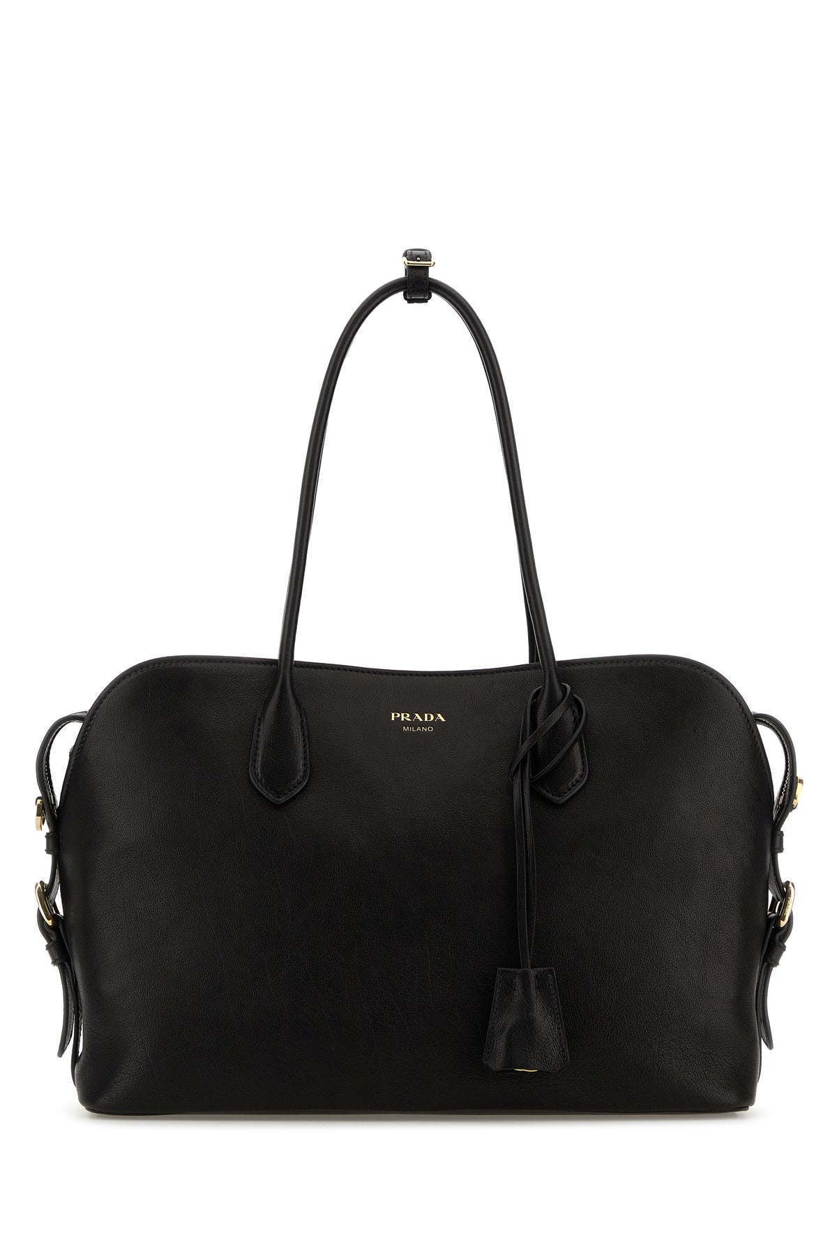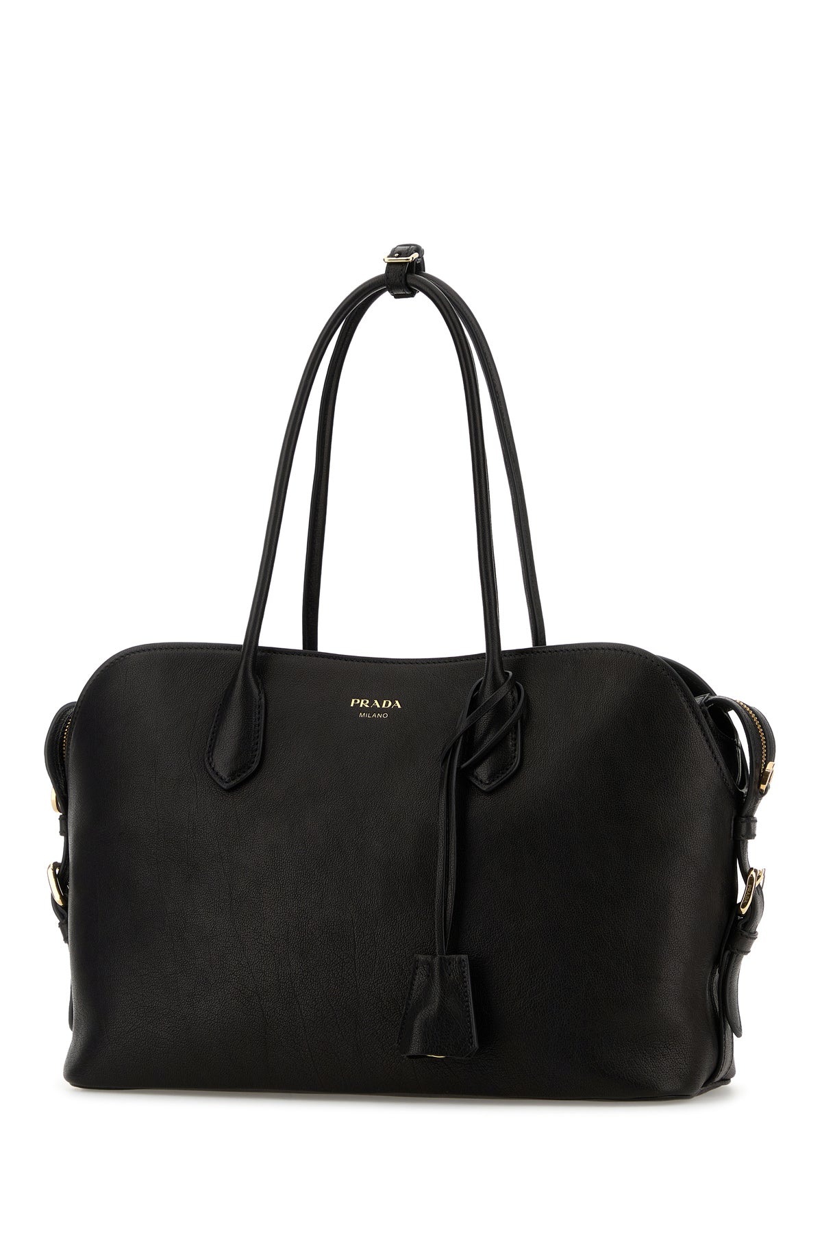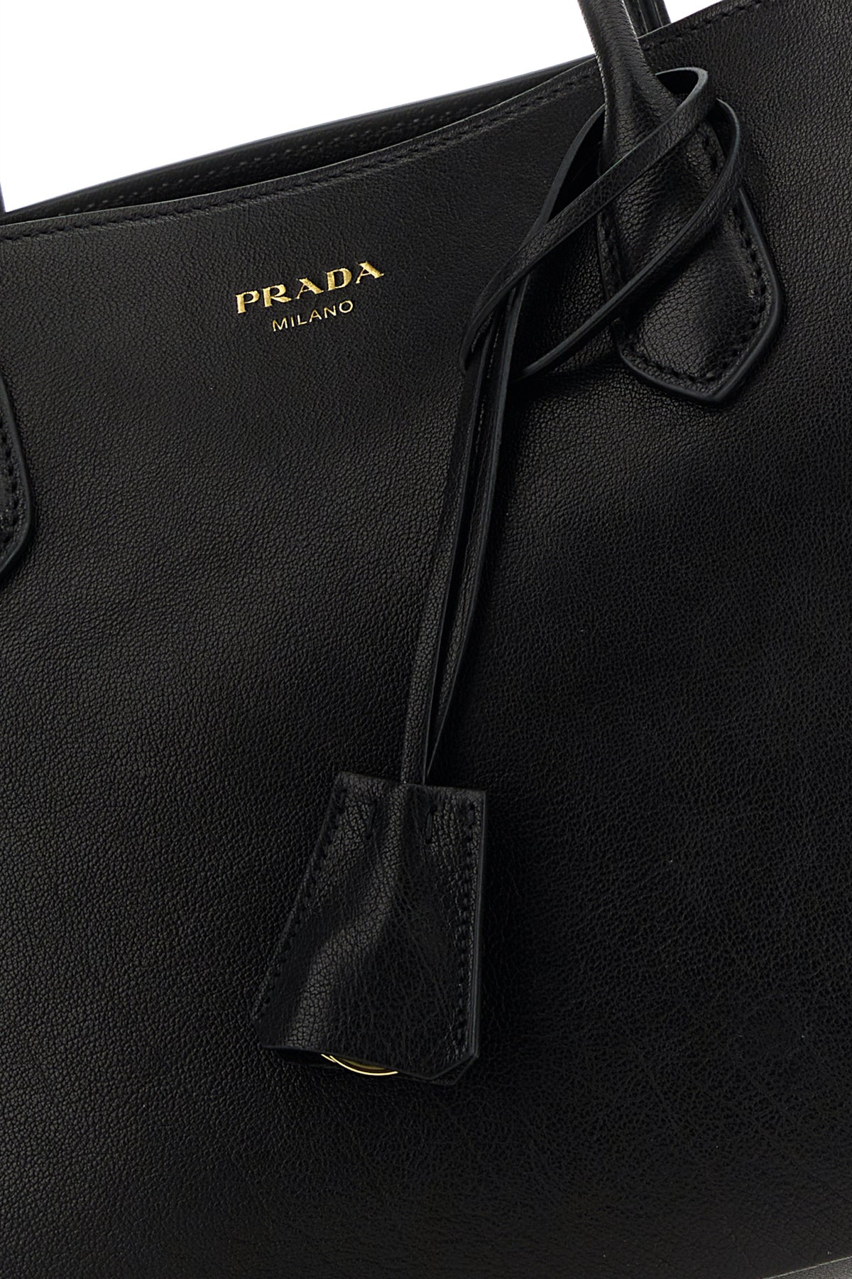 Shopping bag realized in pebble leather characterized by laminated printed logo at the front.