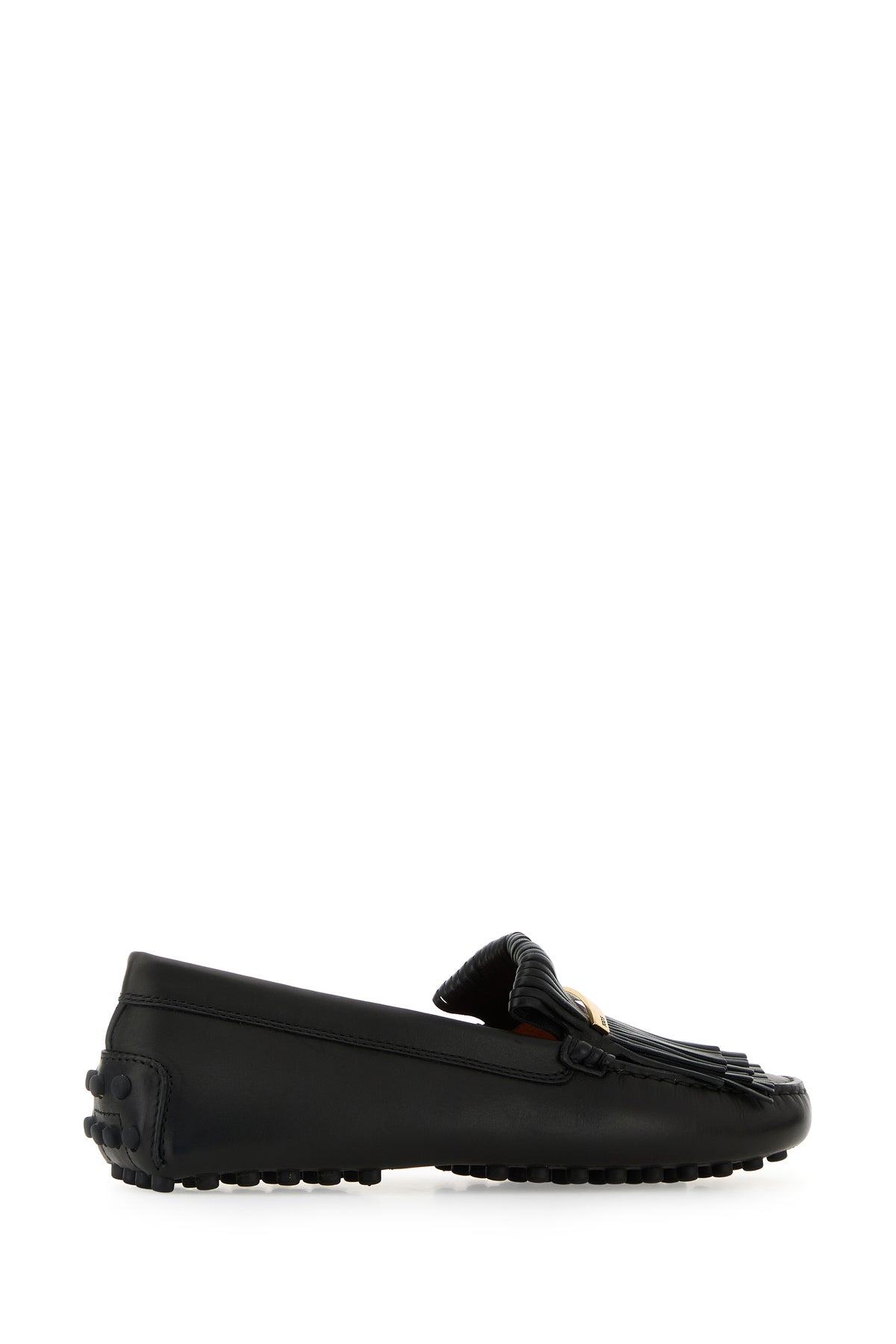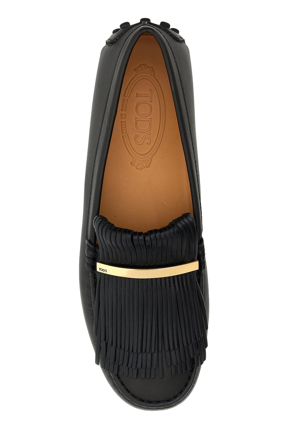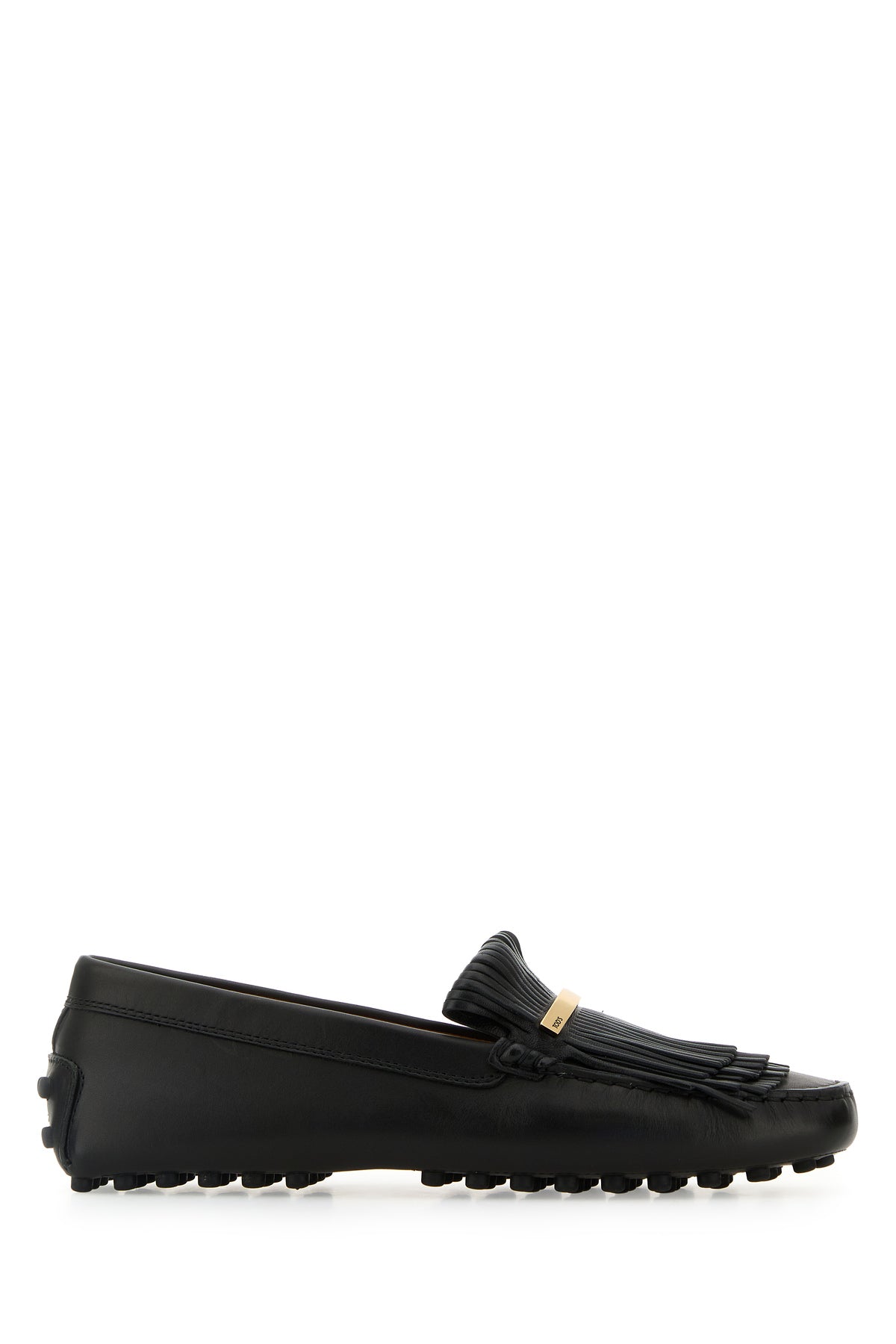 Loafers realized in smooth leather enriched by fringes and logoed metal plate on the instep.