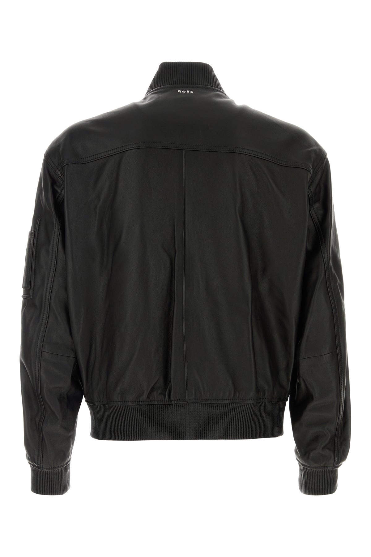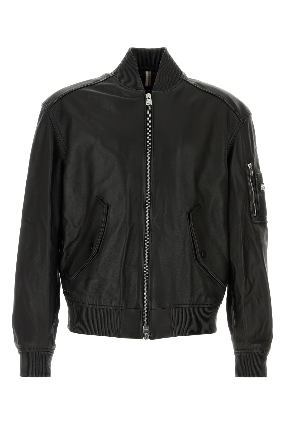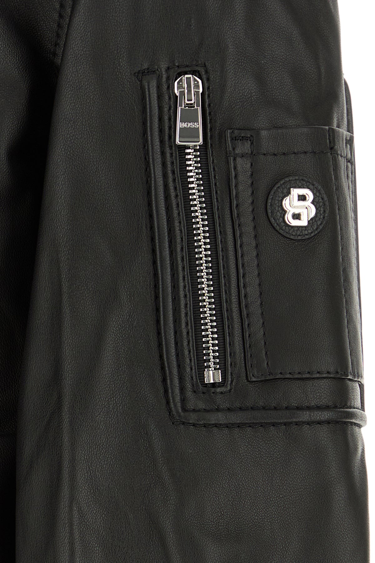 Bomber jacket realized in pebble lamb leather enriched by logoed meal detail on the sleeve.