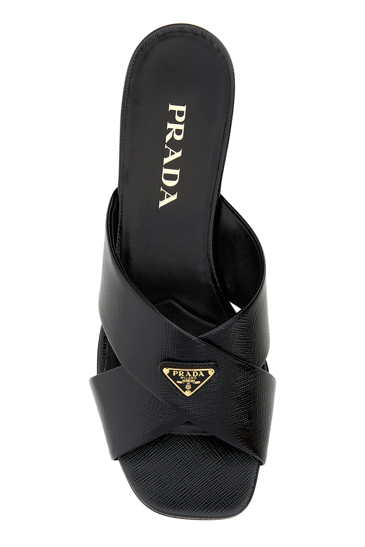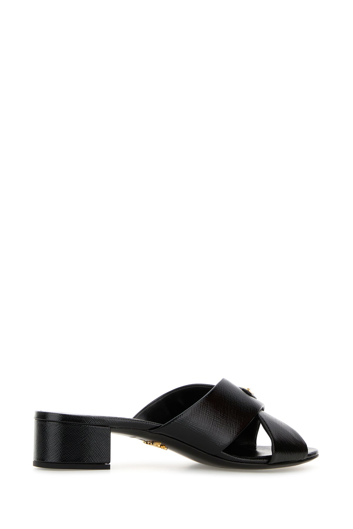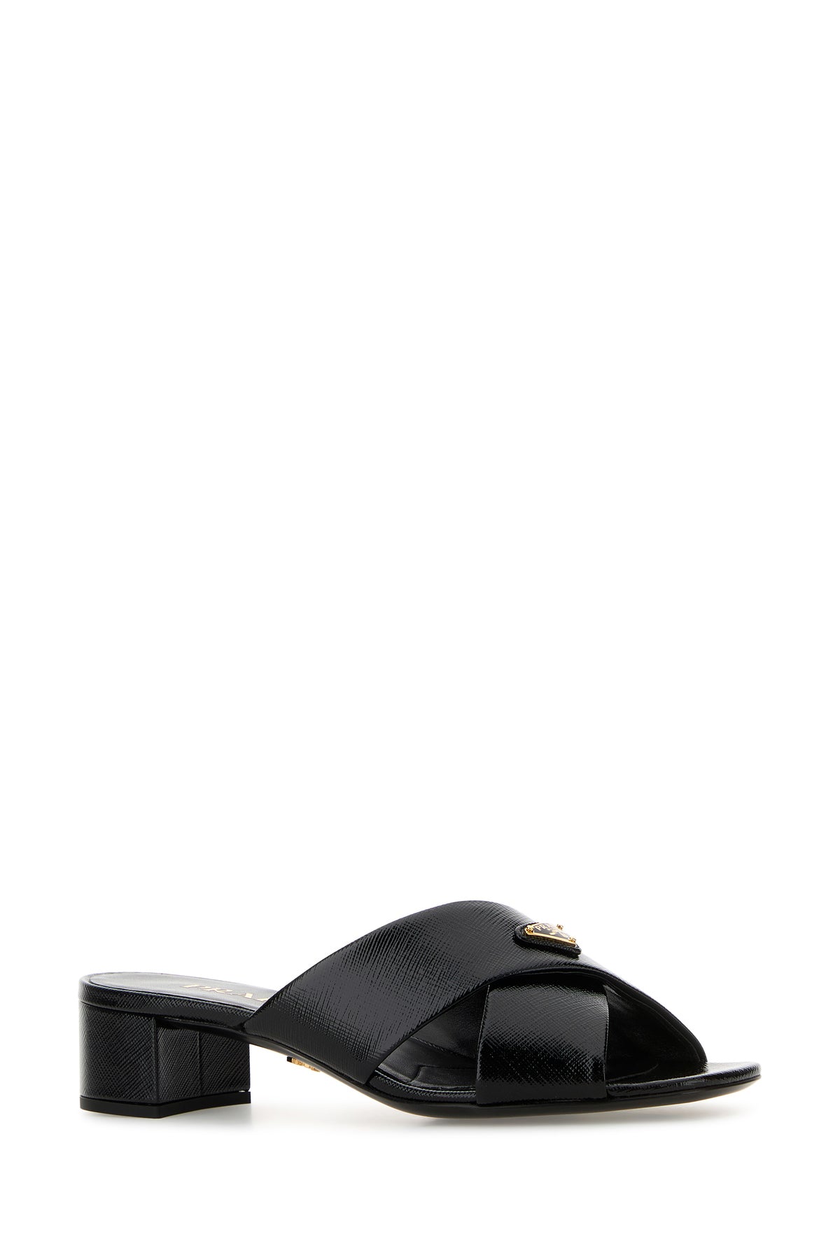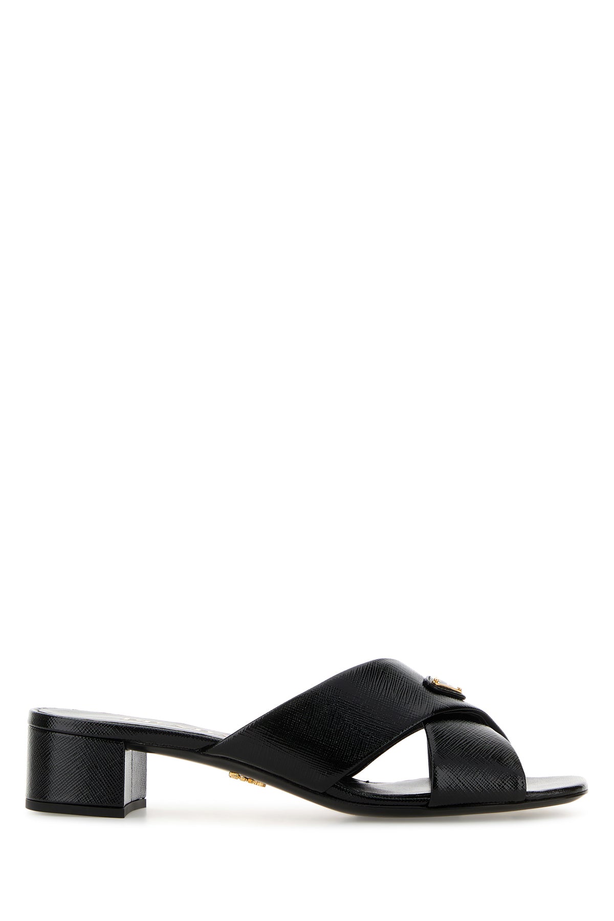 Mules realized in grained leather enriched by iconic logoed metal triangle on the instep.