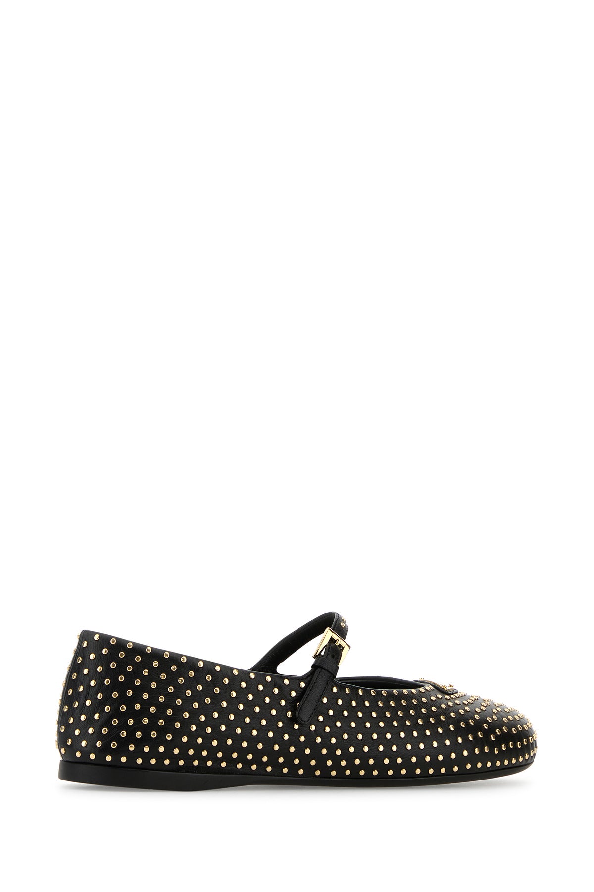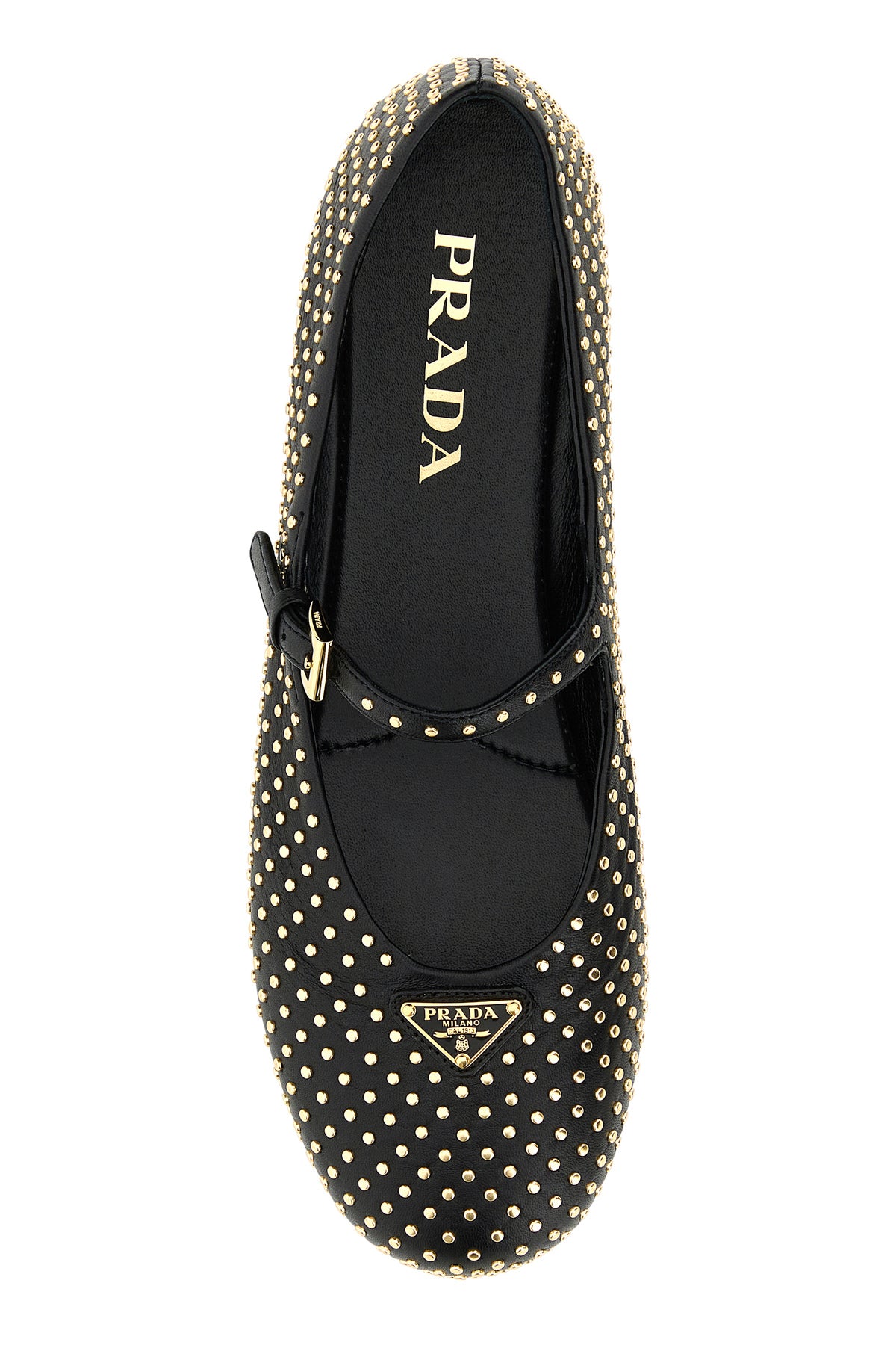 Ballerinas realized in nappa leather entirely covered by metal studs enriched by iconic logoed metal triangle on the round toe.