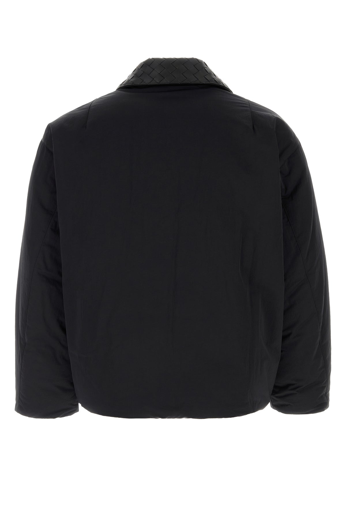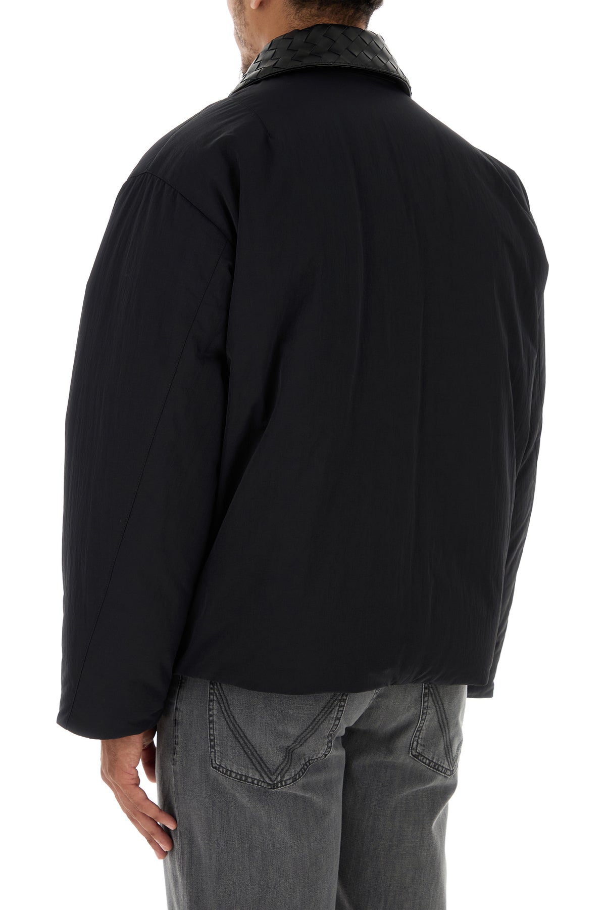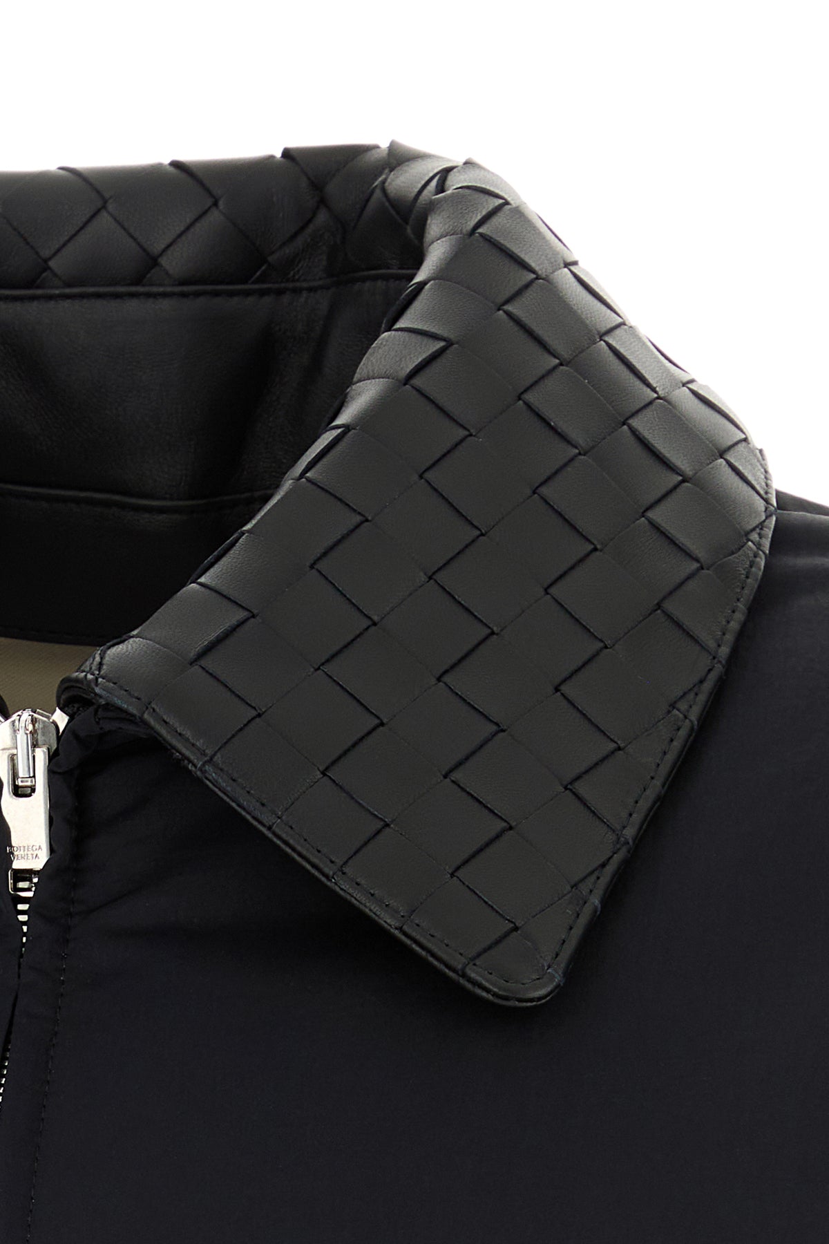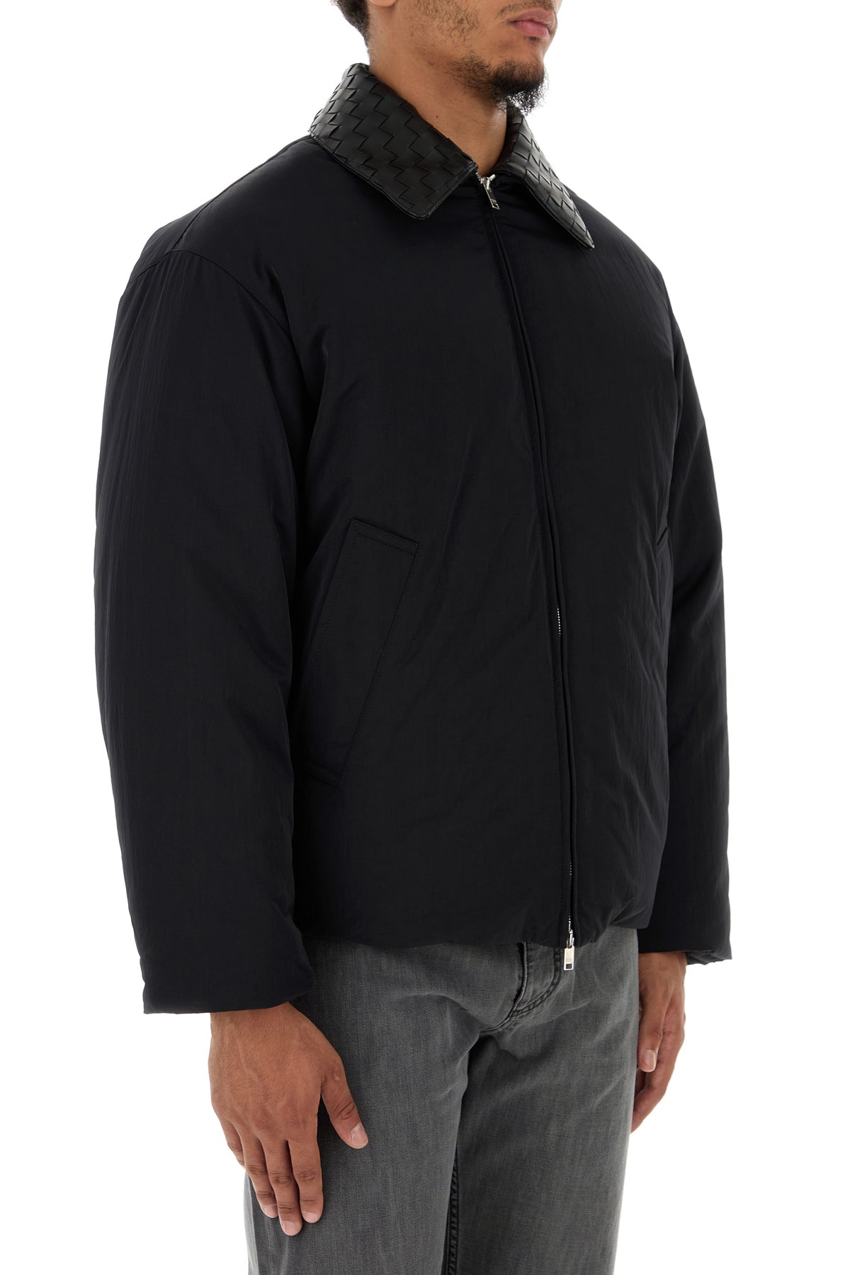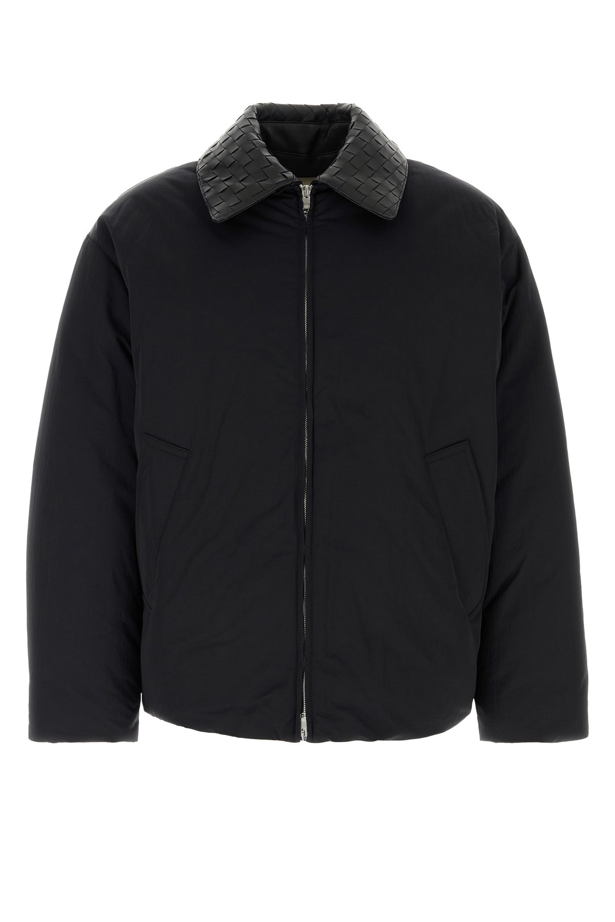 Down jacket realized in quilted nylon characterized by iconic Intrecciato motif on the detachable collar.