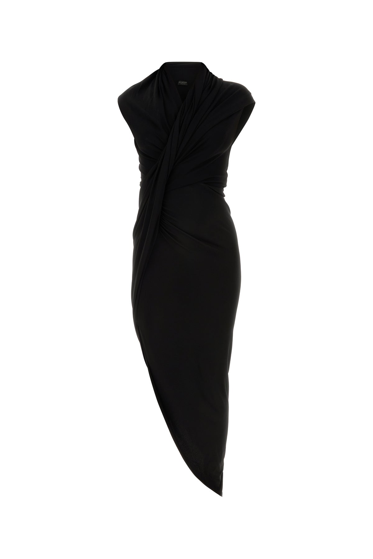 Dress realized in stretch crepe characterized by drapes on the V neckline and at the front.