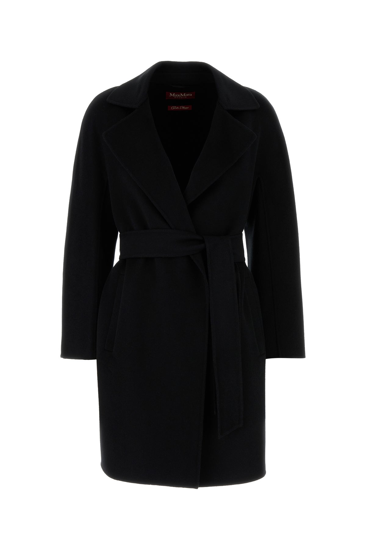 Coat realized in virgin wool characterized by belt to tie closure at the waist.