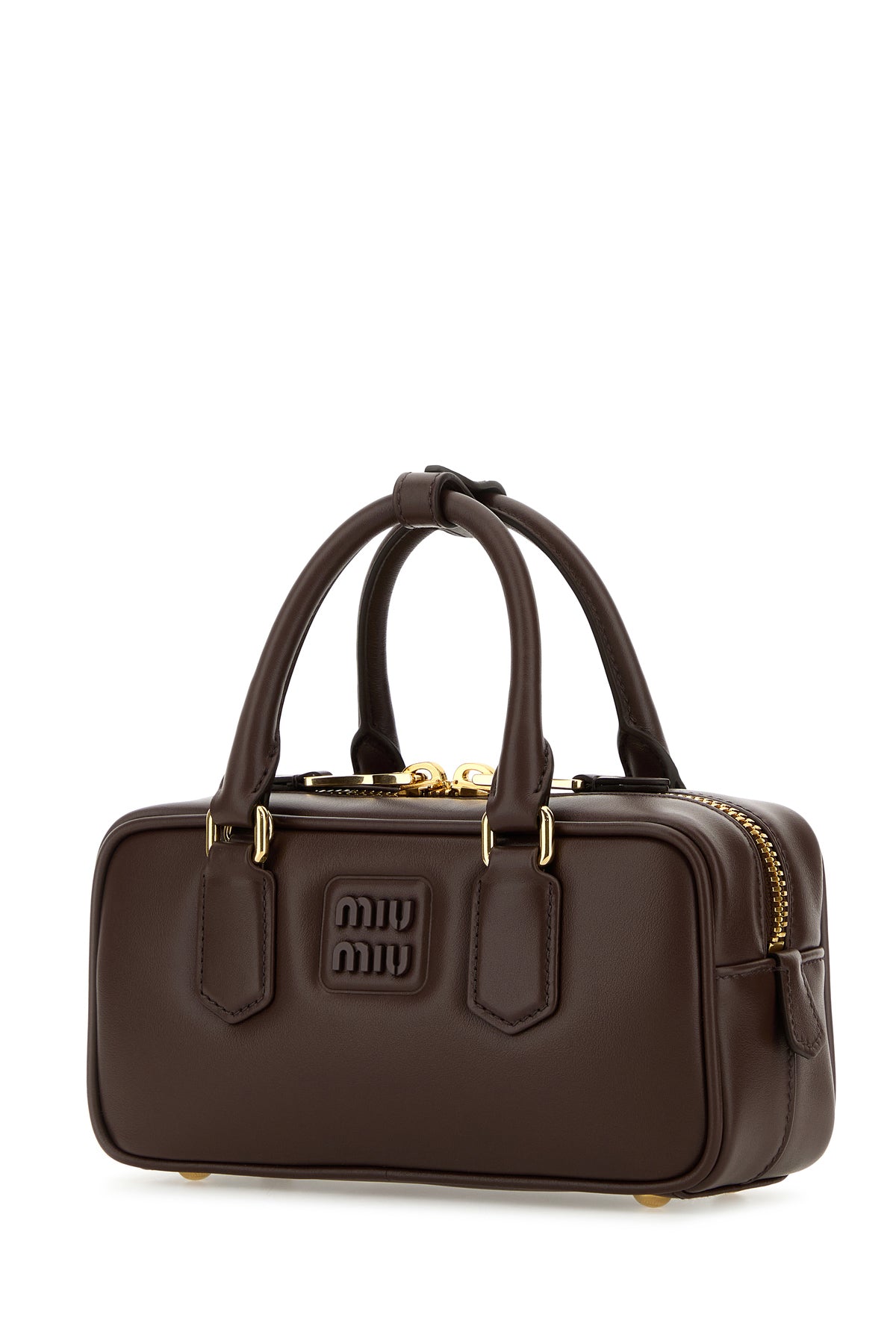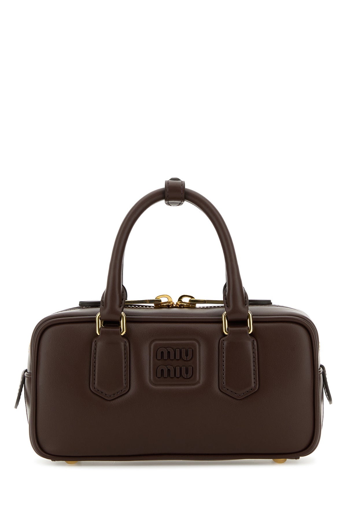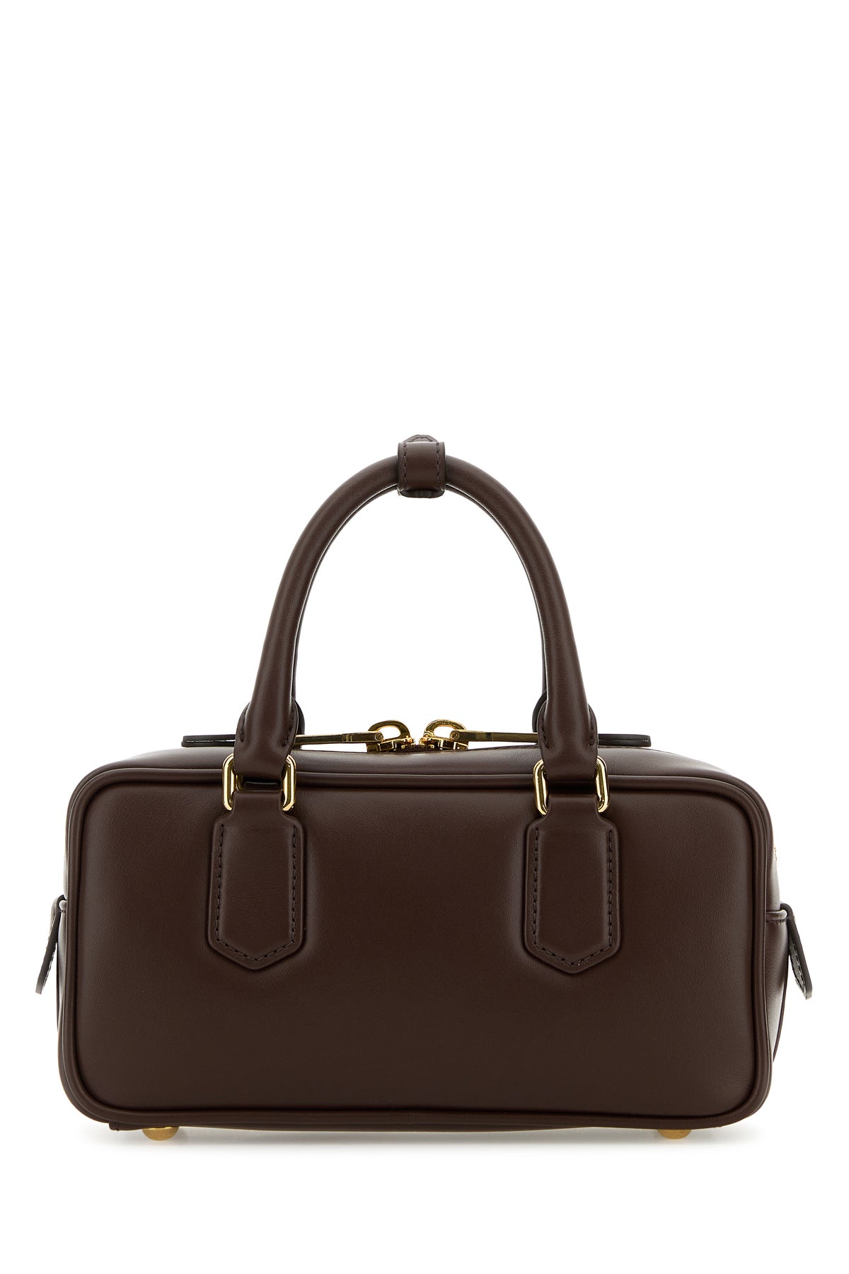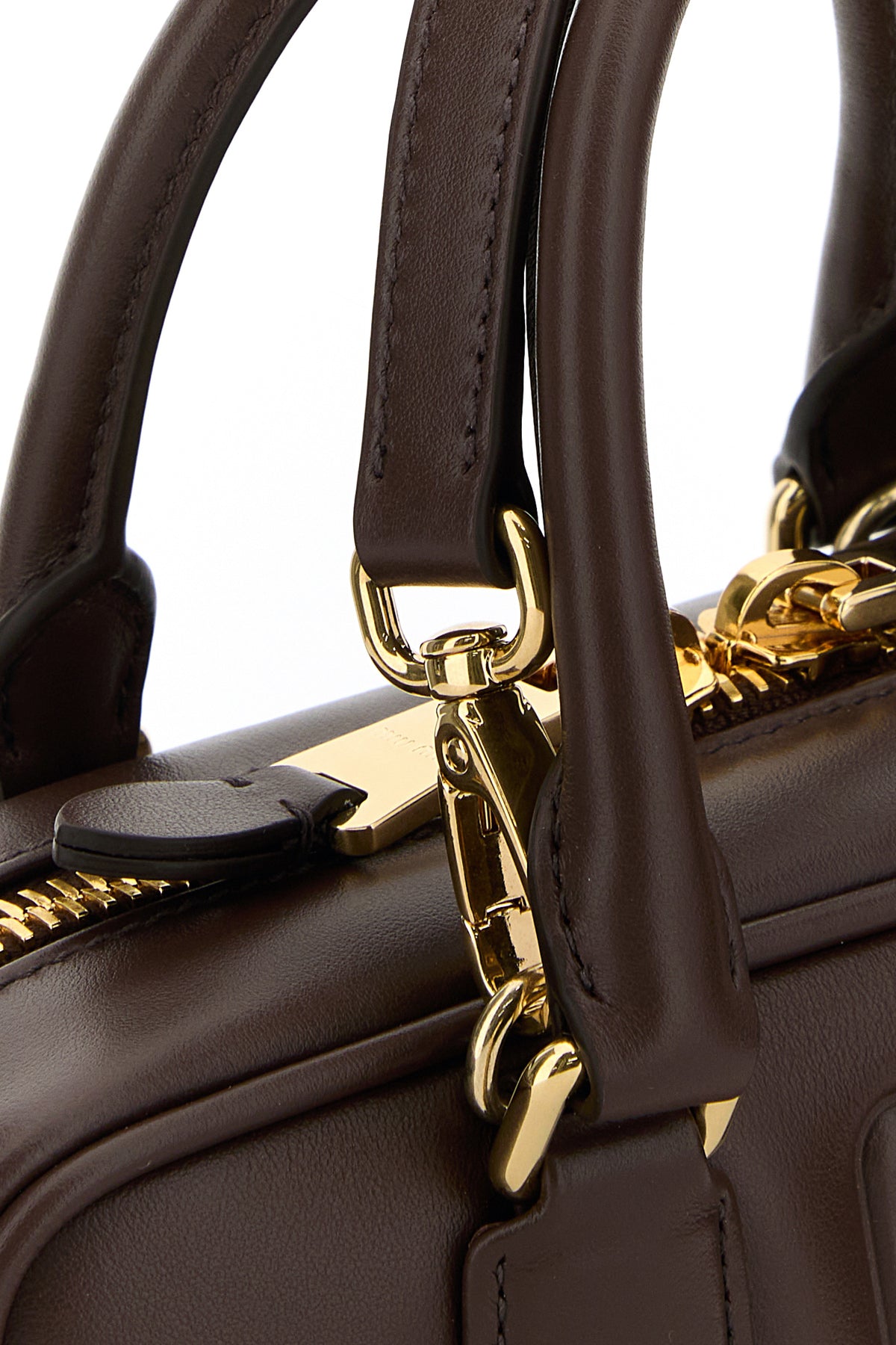 Handbag realized smooth leather enriched by tonal metal lettering logo at the front.