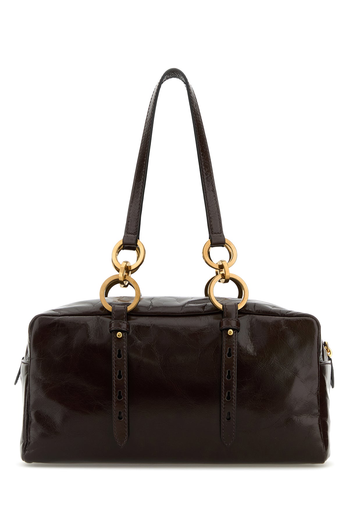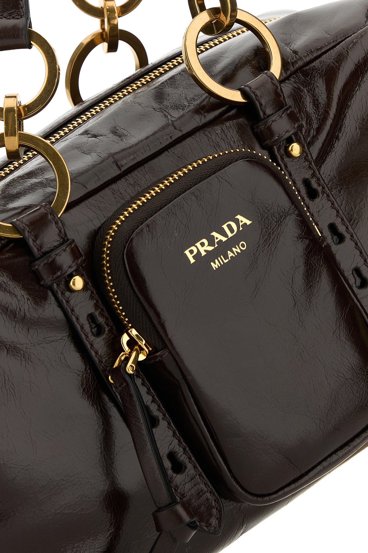 Handbag realized in creased effect polished finish leather characterized by laminated printed logo at the front.