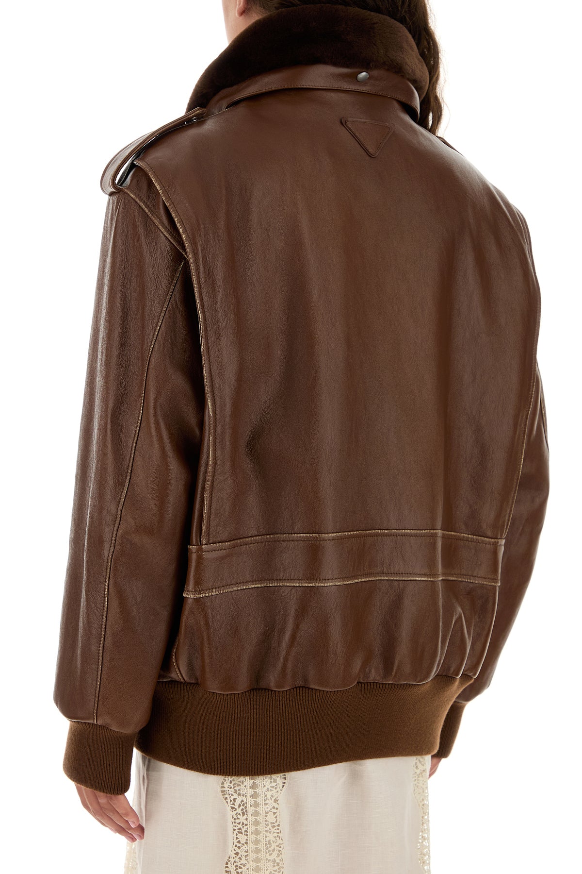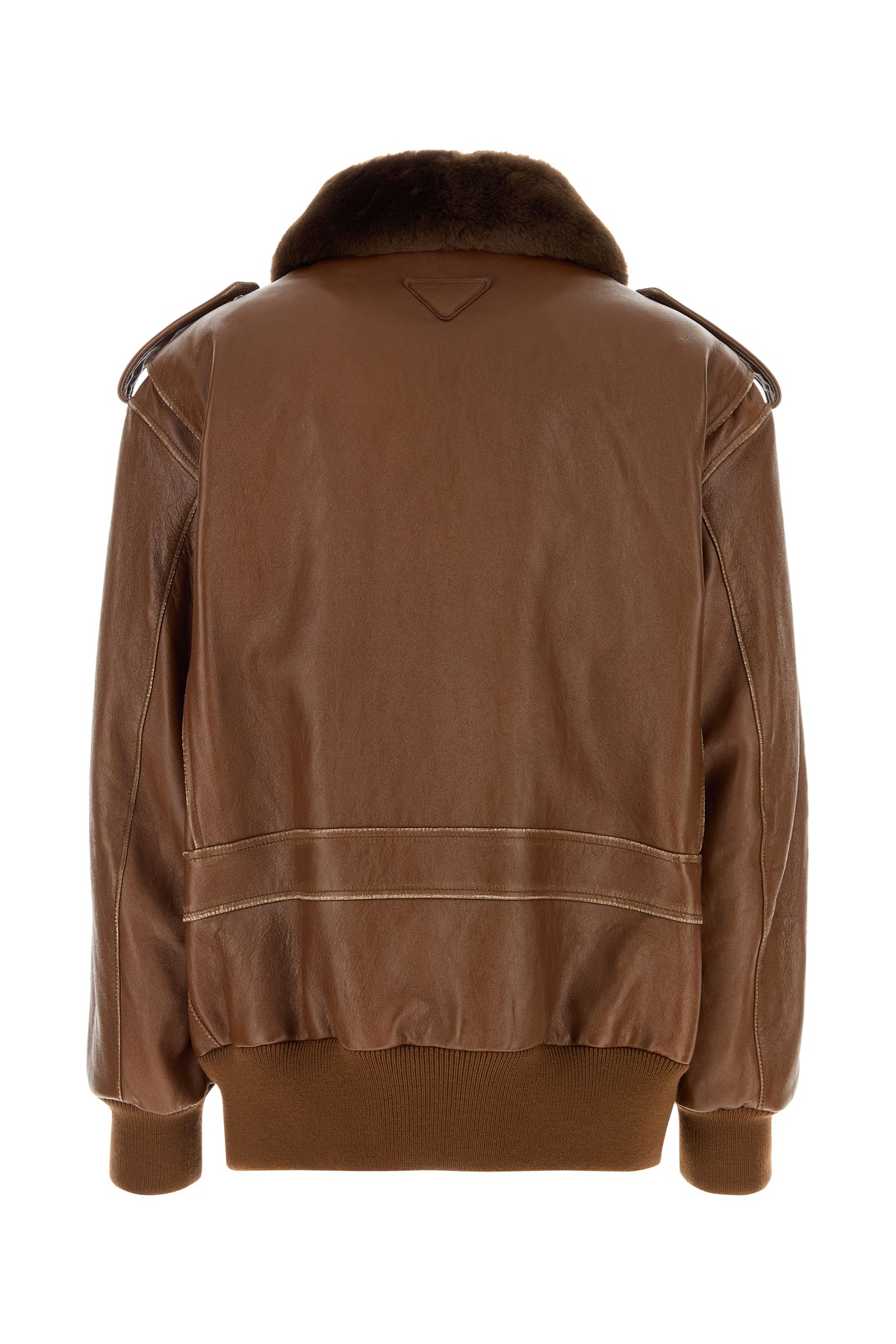 Jacket realized in lamb nappa leather enriched by iconic tonal logoed triangle at the back.
