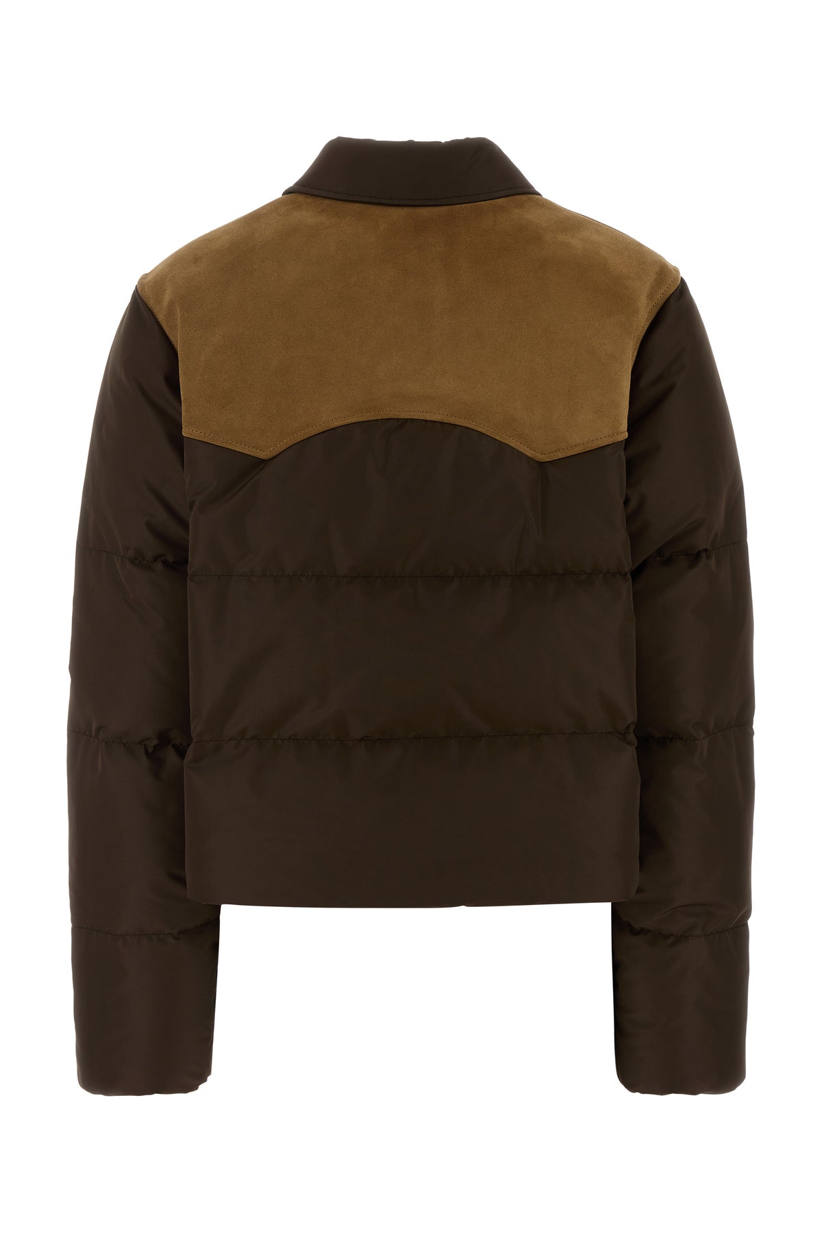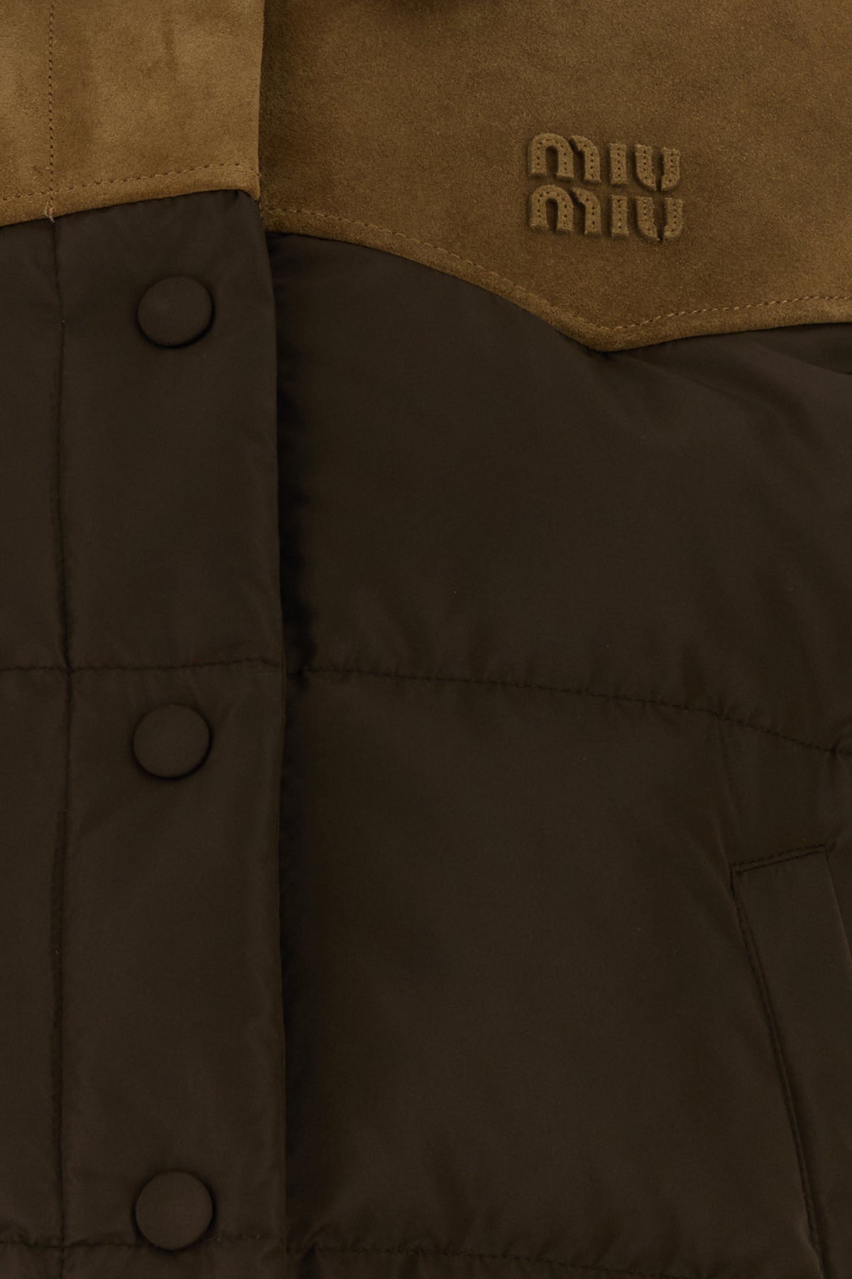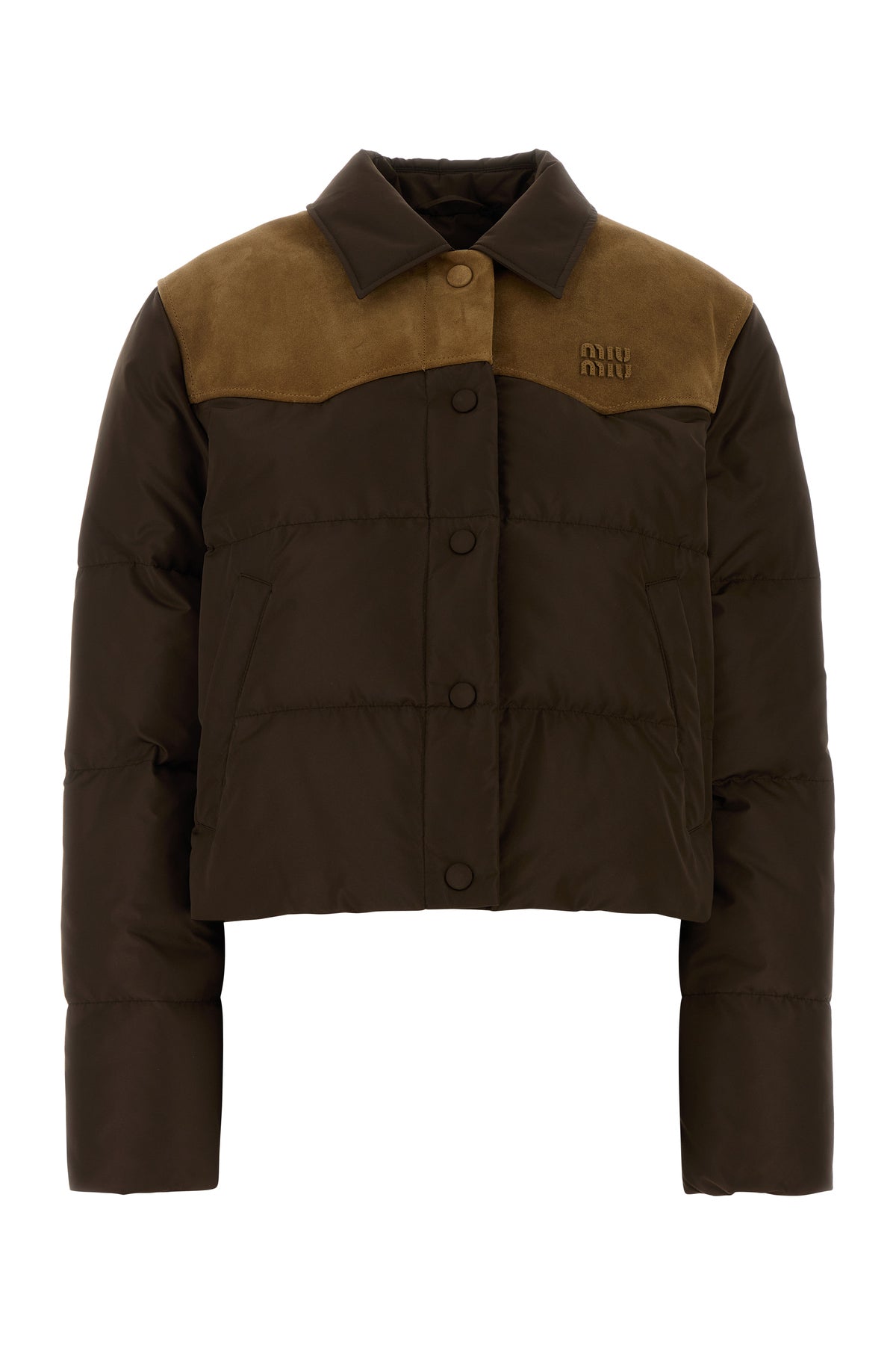 Down jacket realized in polyester with contrasting suede insert at the top enriched by logoed patch on the chest.
