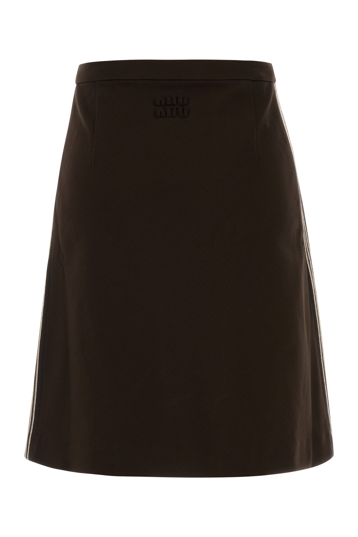 Flared skirt realized in stretch viscose blend with contrasting inserts on the sides enriched by logoed patch at the back.
