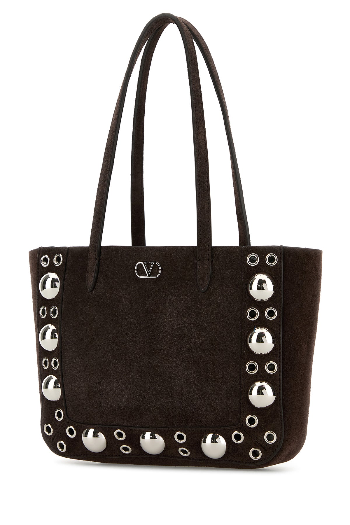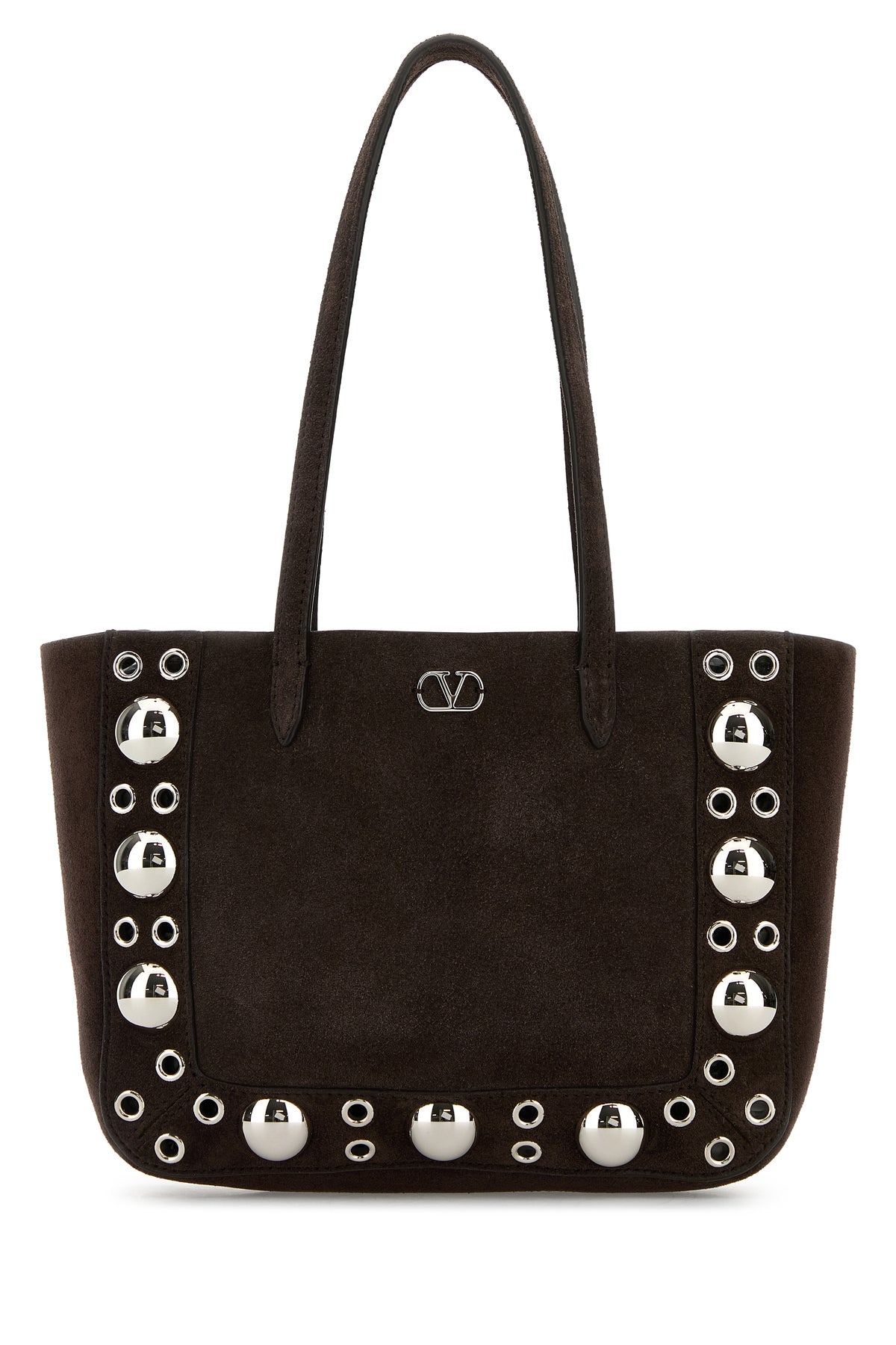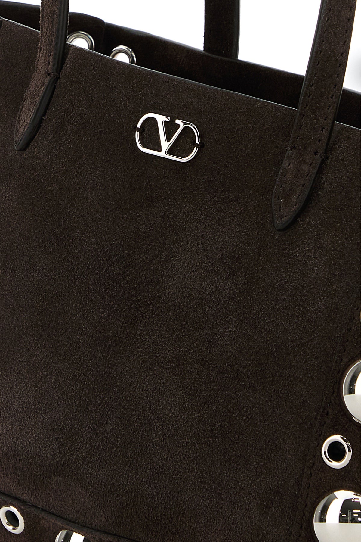 Shopping bag realized in suede enriched by VLogo Signature metal detail at the front and metal studs on the trimmings.