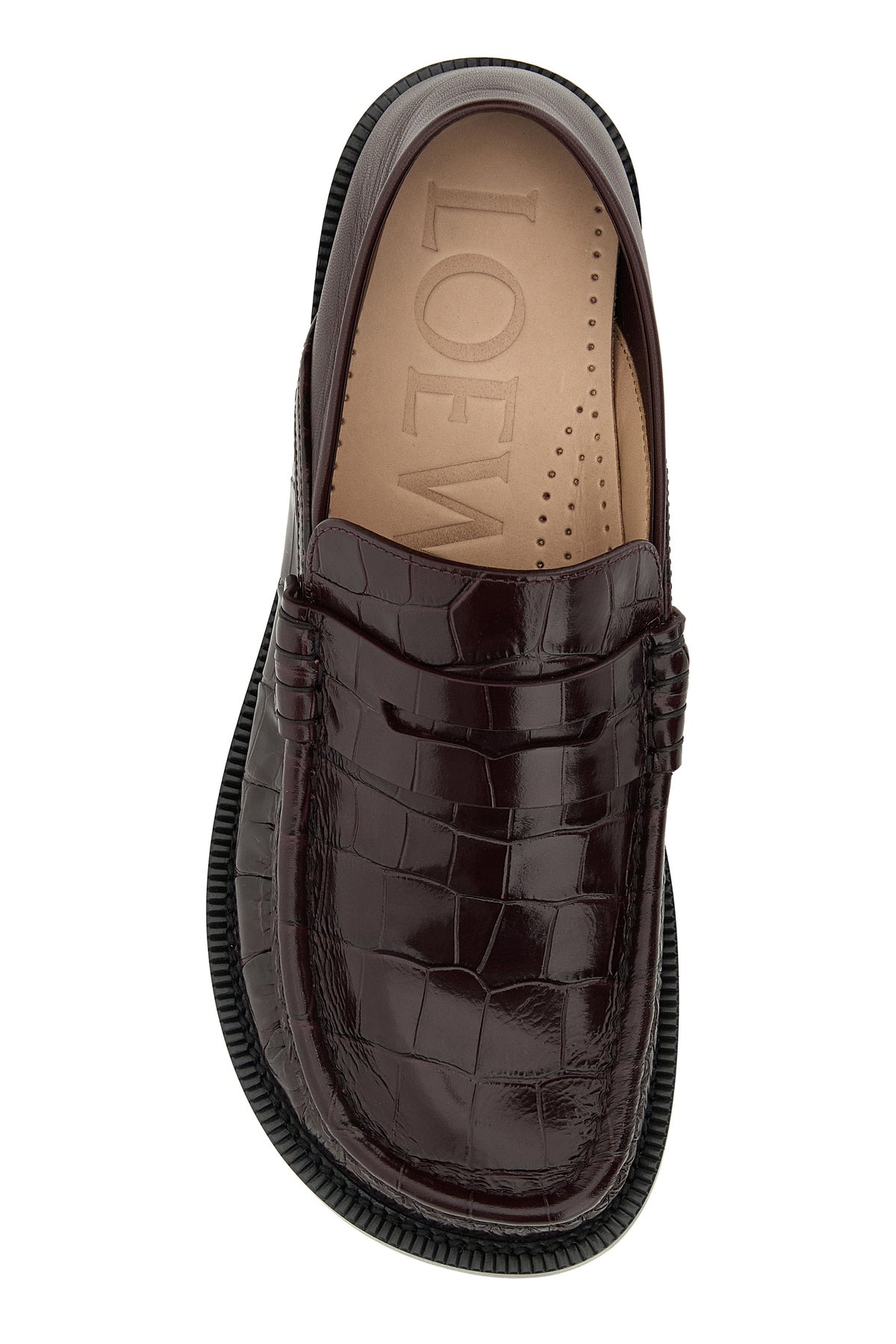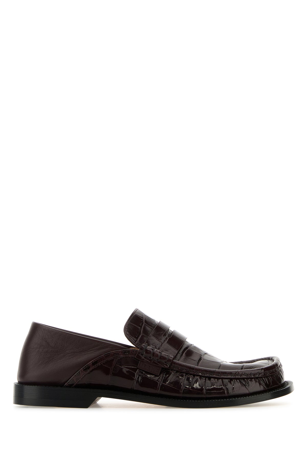 Loafers realized in ostrich motif embossed calf leather characterized by peculiar moulded toe.