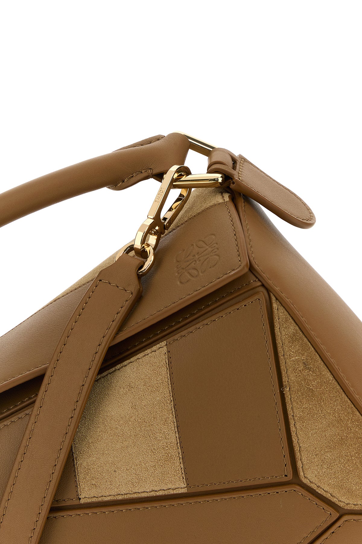 Handbag realized in calf leather and suede characterized by embossed Anagram motif on the flap and iconic geometric motif on the entire surface.