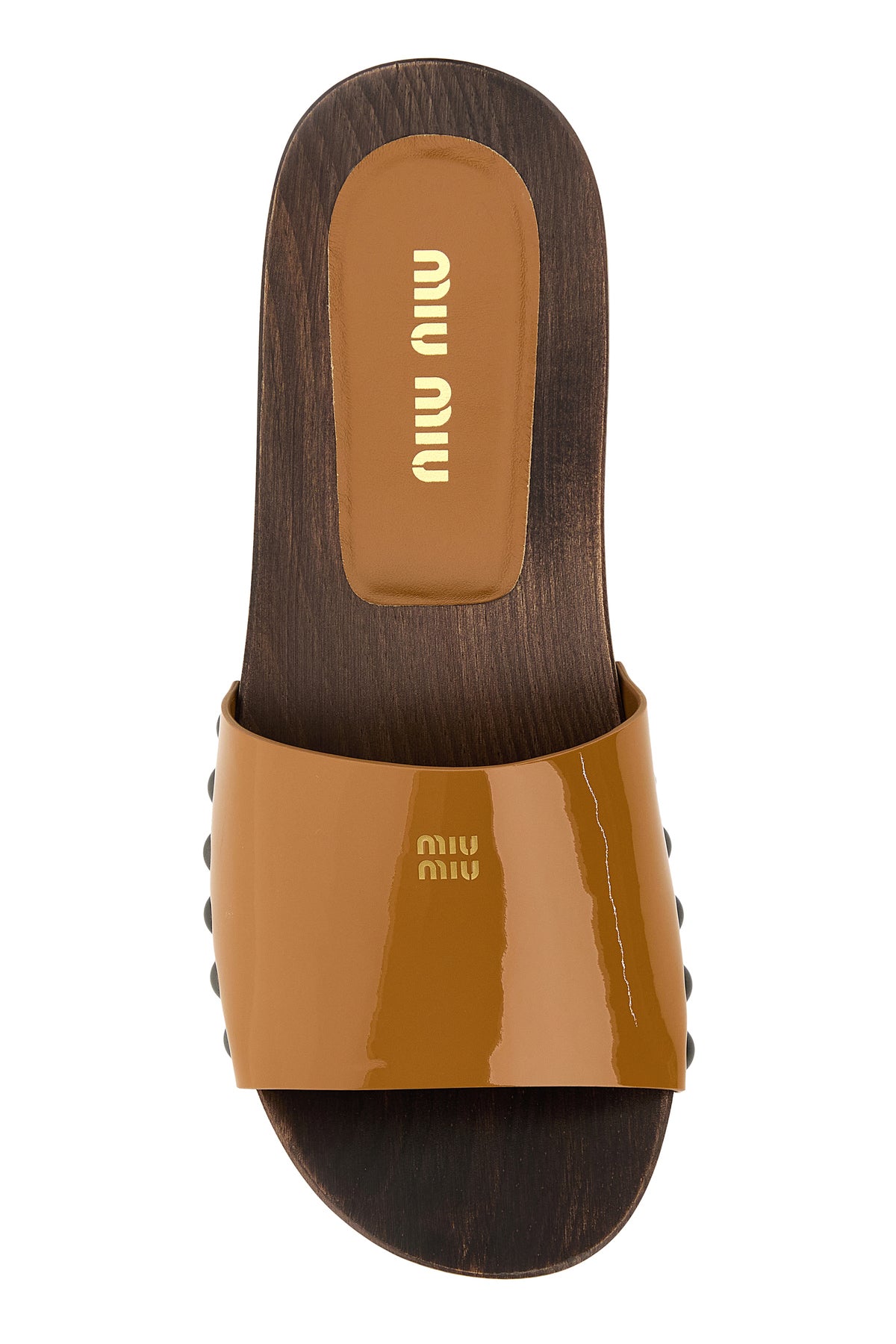 Clogs realized in patent leather characterized by laminated printed logo on the instep.