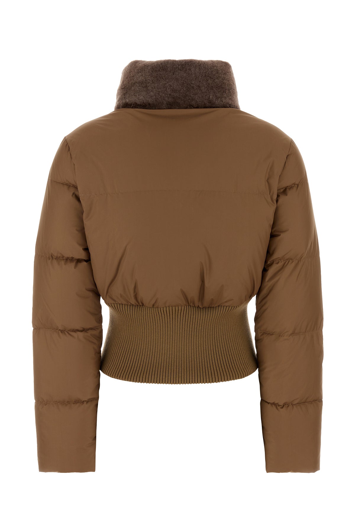 Down jacket realized in quilted polyester enriched by tonal logoed label on the chest.