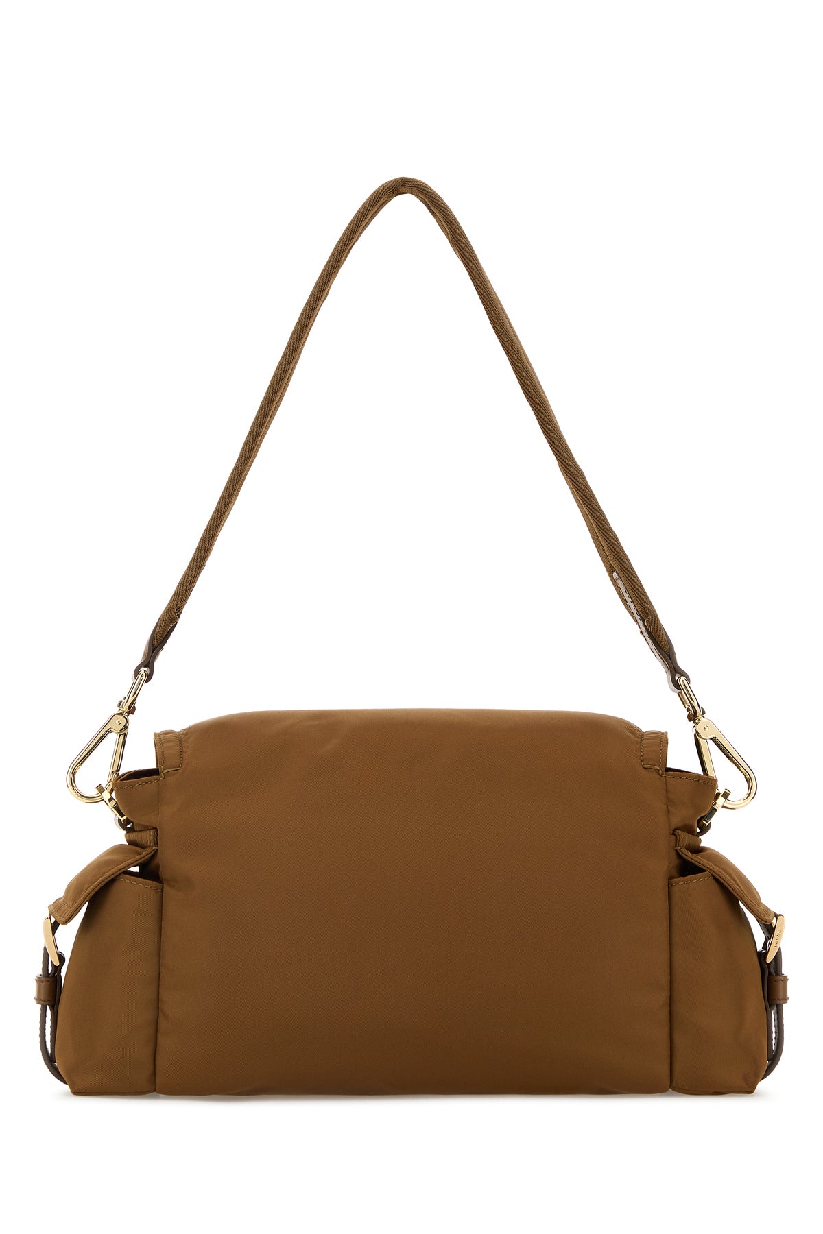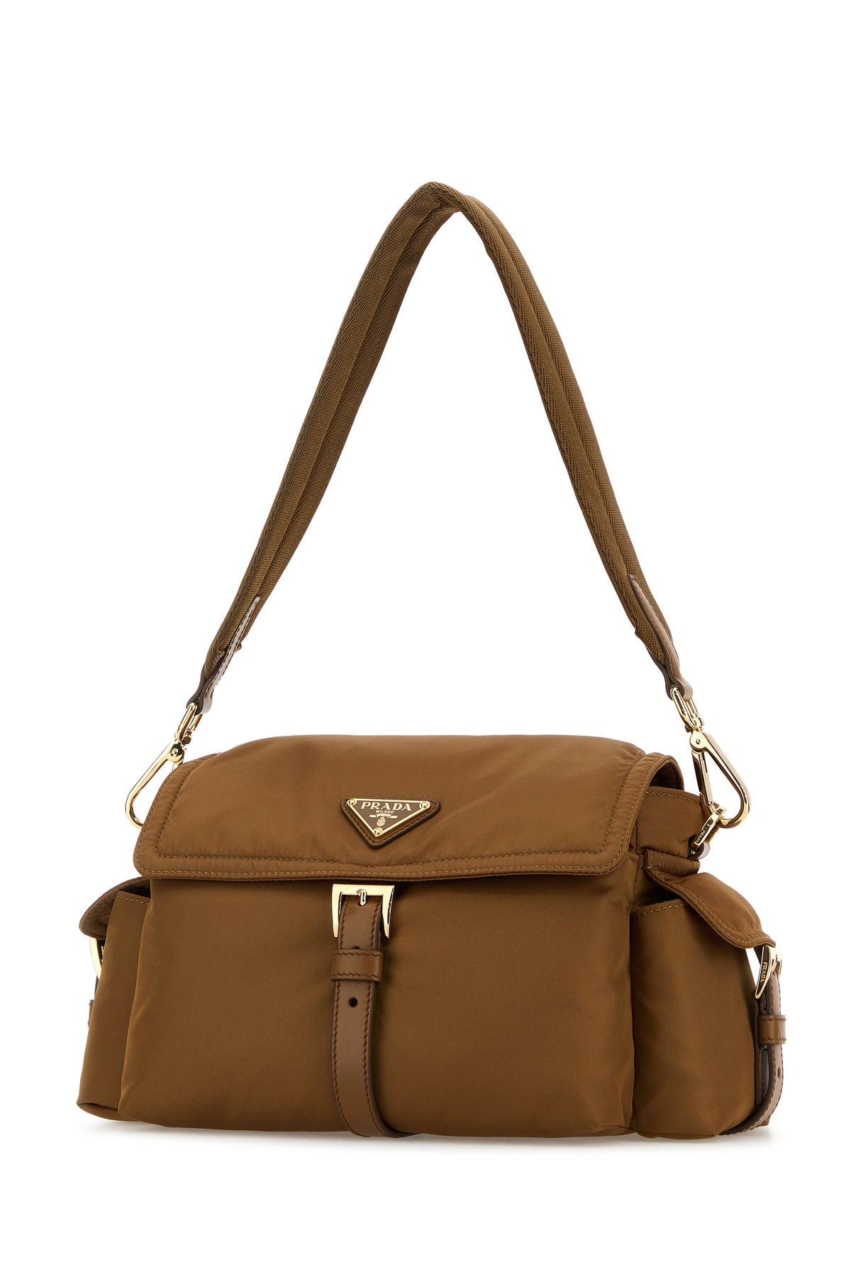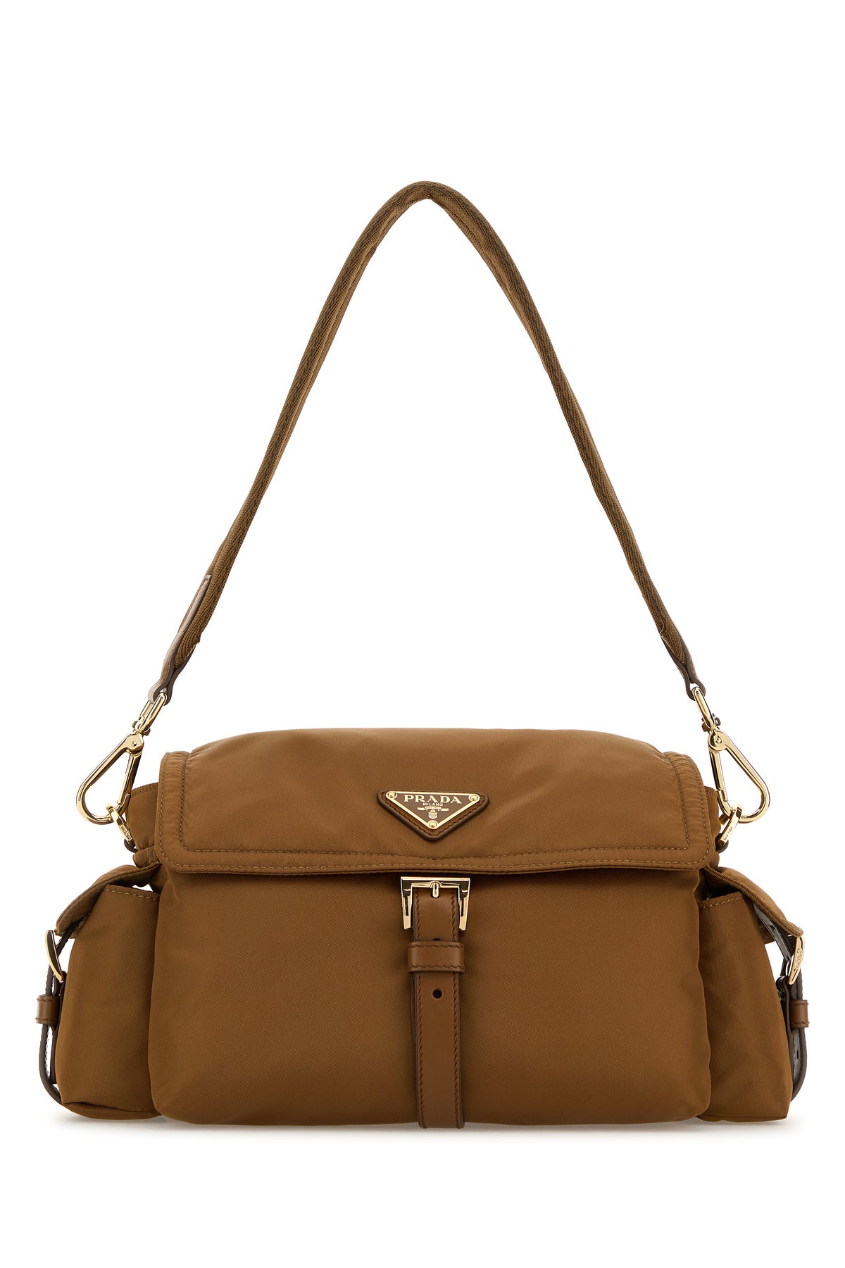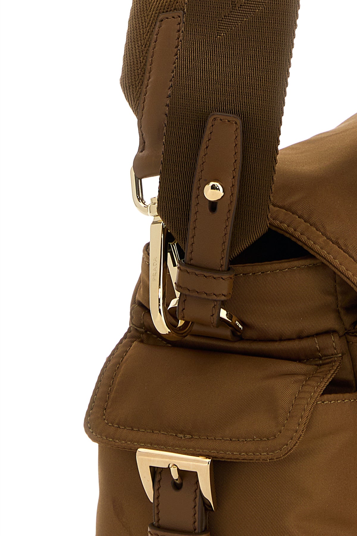 Shoulder bag realized in Re-Nylon with calf leather inserts enriched by metal iconic logoed triangle on the flap.