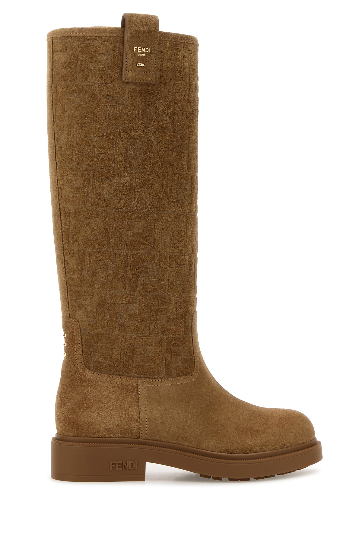 Boots realized in calf suede characterized by FF motif in relief at the top enriched by metal lettering logo on the pull-tabs.