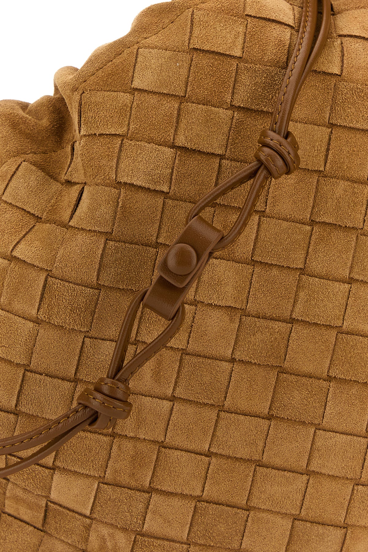 Clutch realized in suede characterized by iconic Intrecciato motif on the entire surface.