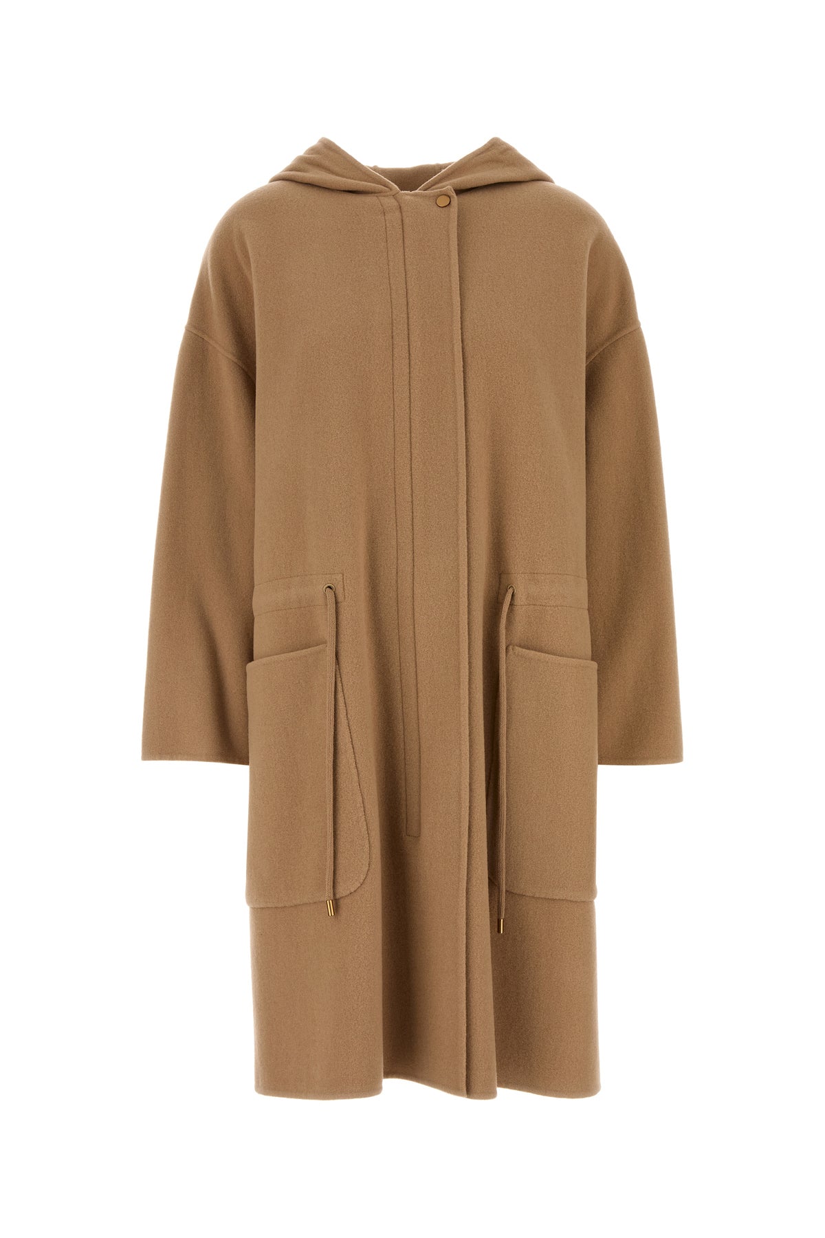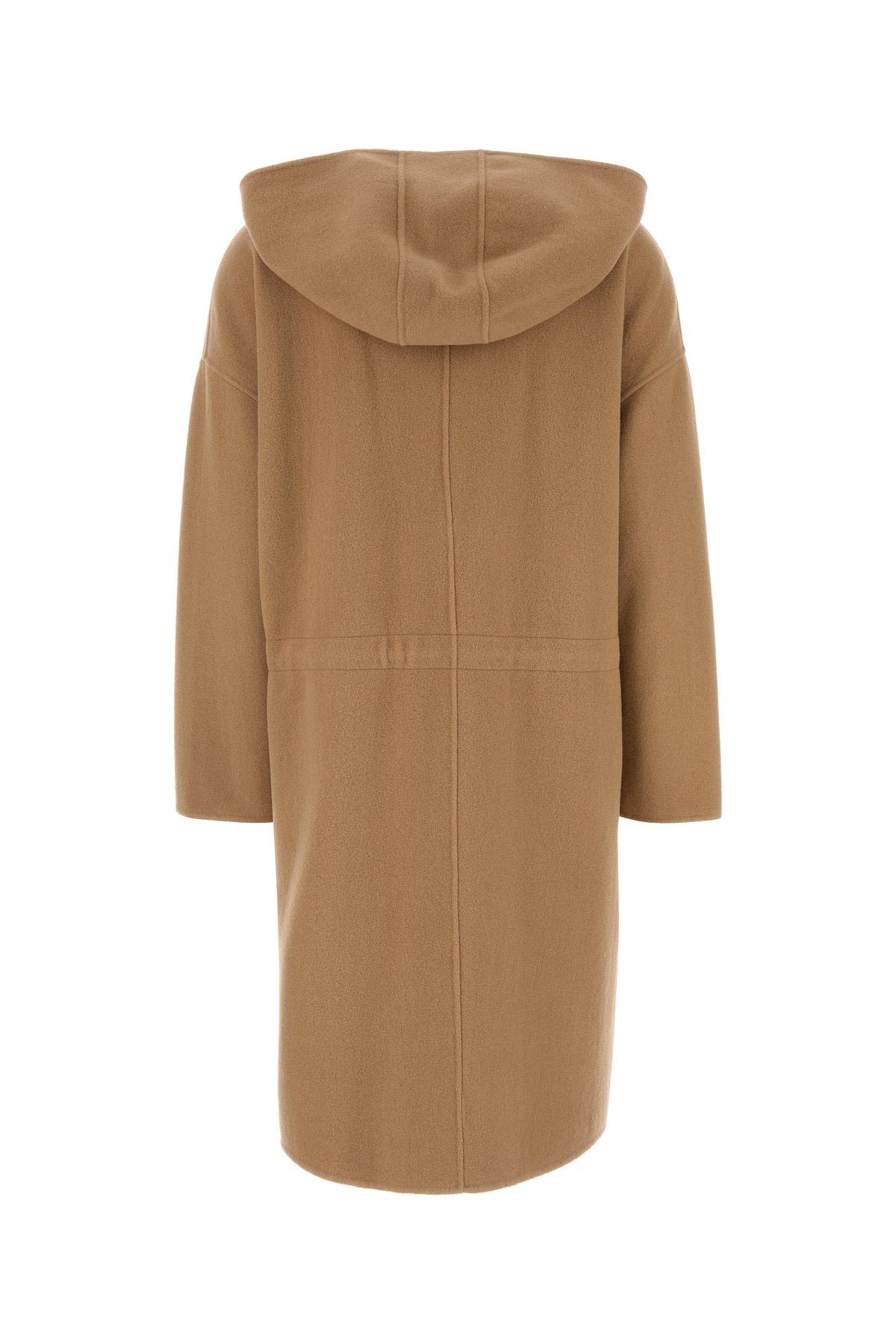 Coat realized in cashmere blend characterized by hood.