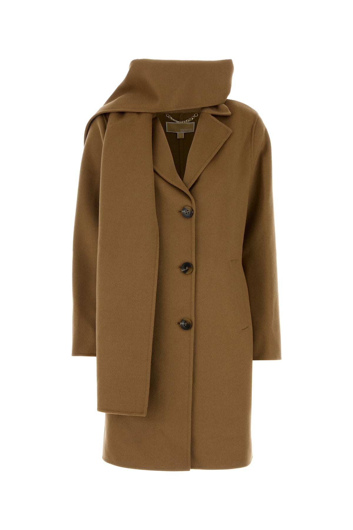 Coat realized in wool blend enriched by detachable tonal fabric insert on the neck.