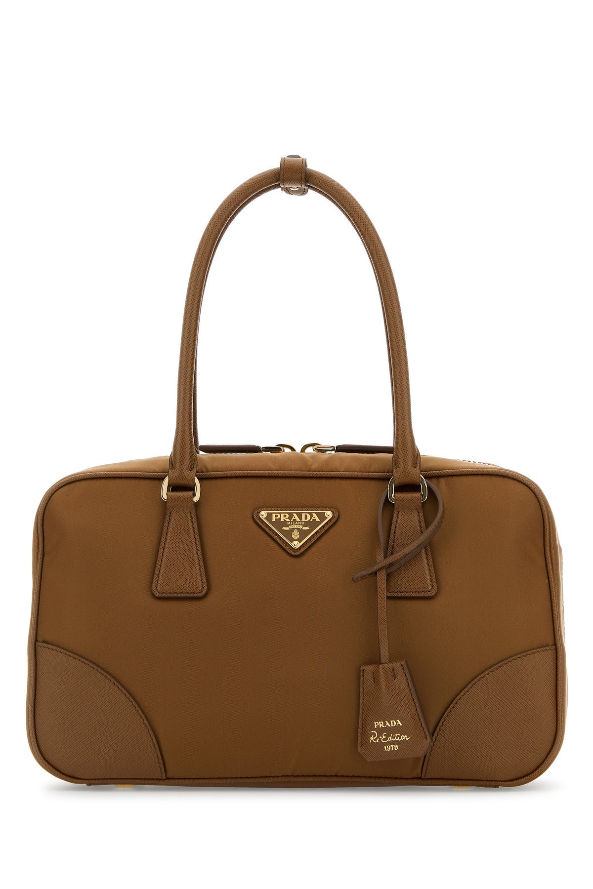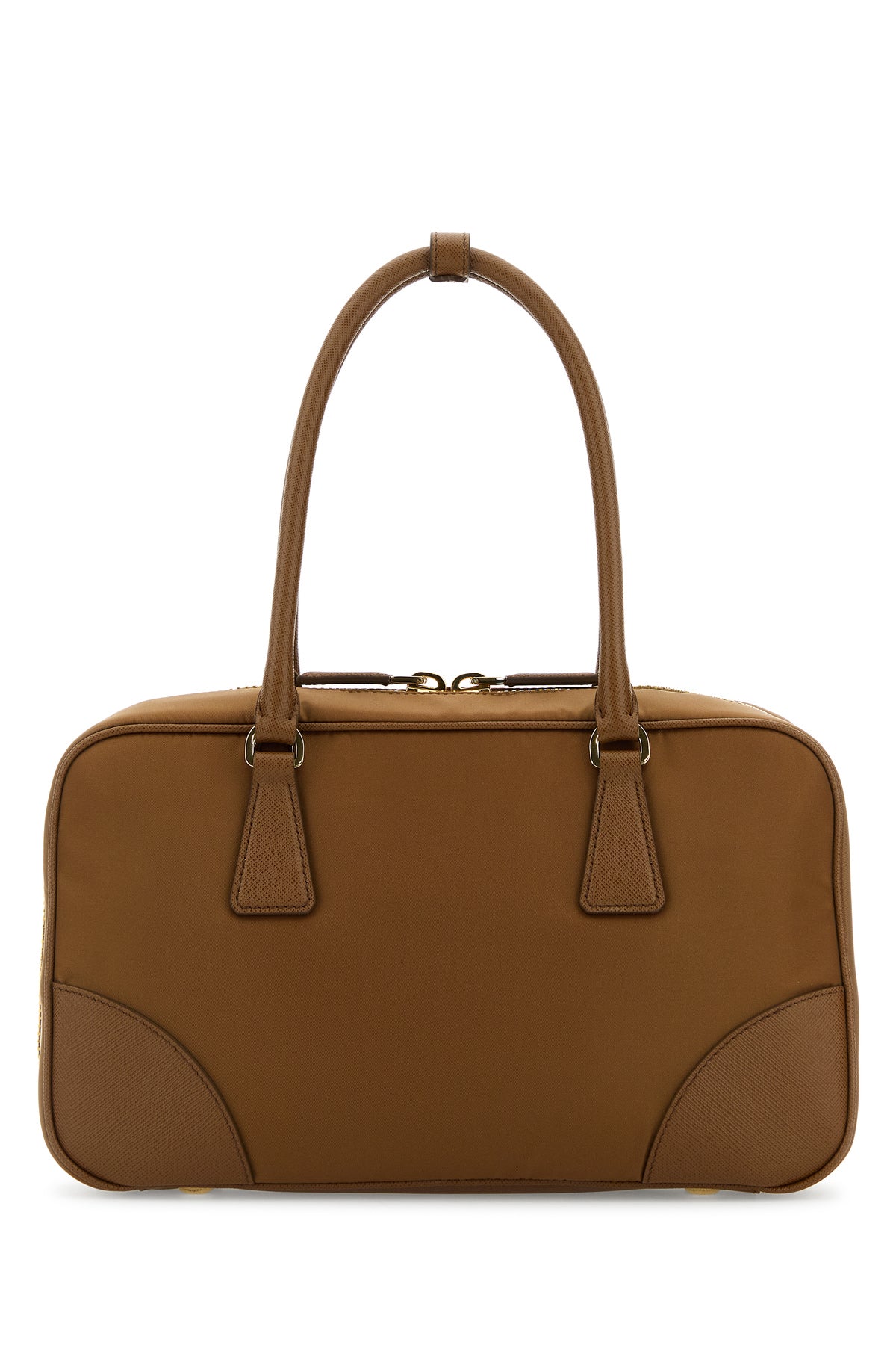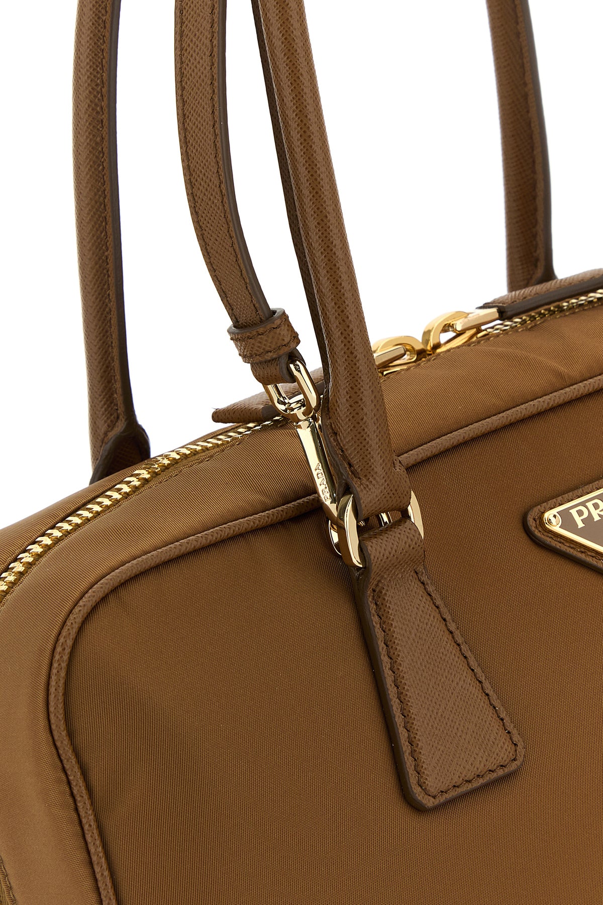 Handbag realized in canvas with leather inserts on the trimmings enriched by iconic logoed metal triangle at the front.