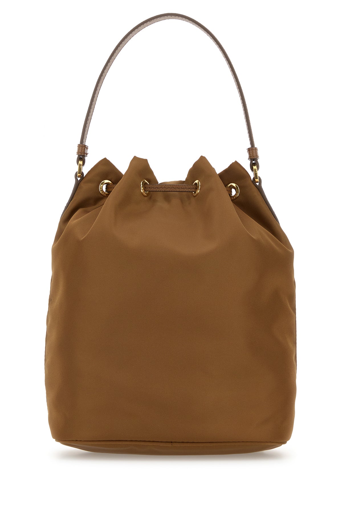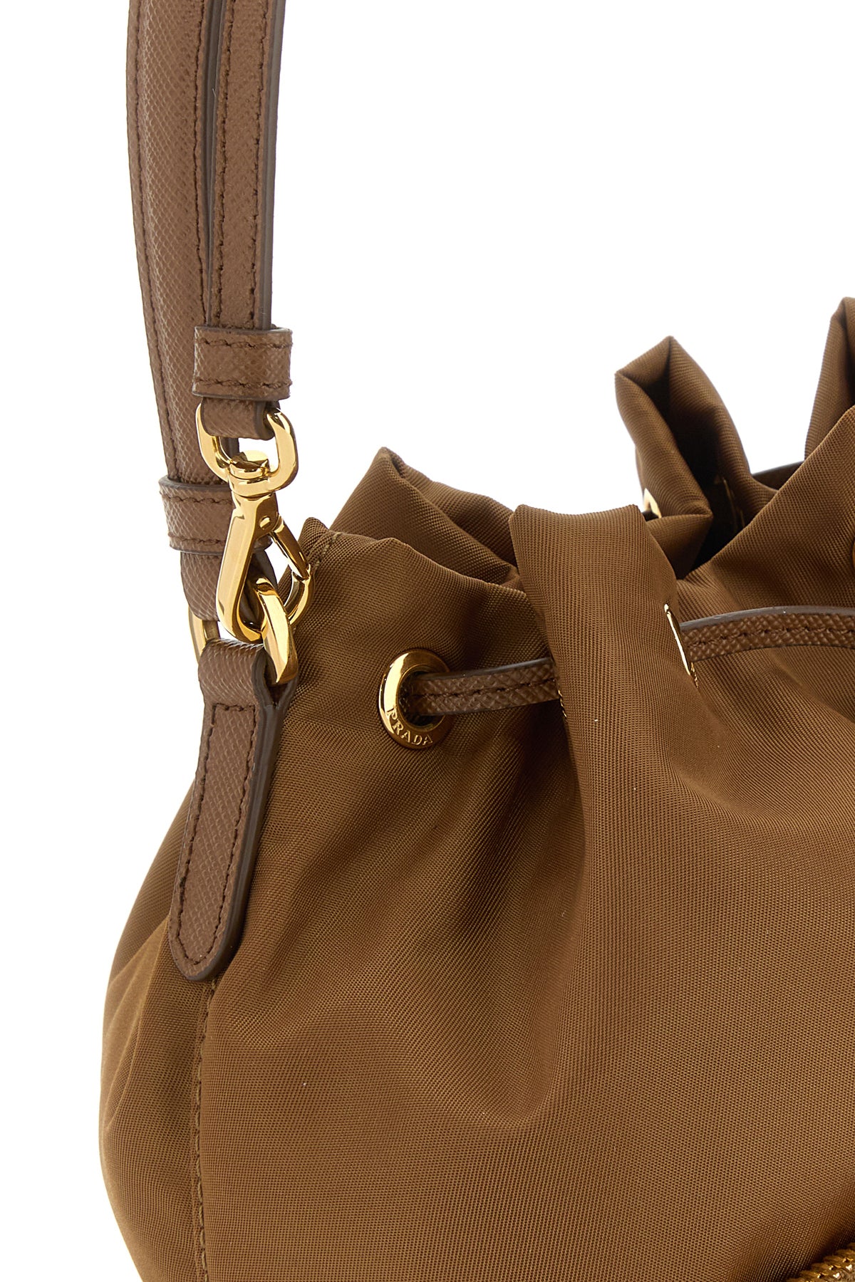 Bucket bag realized in Re-Nylon with Saffiano leather enriched by iconic logoed triangle at the front.