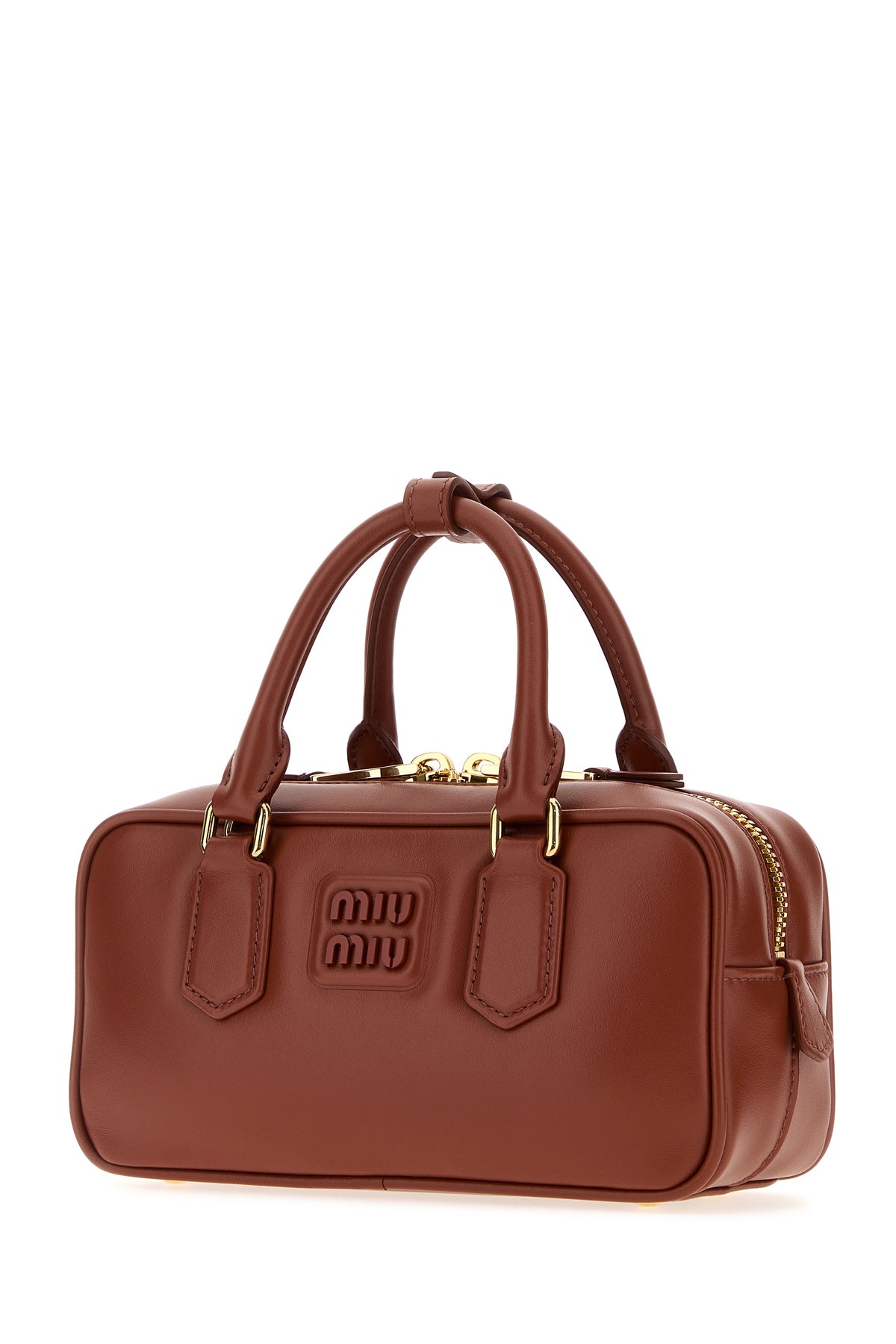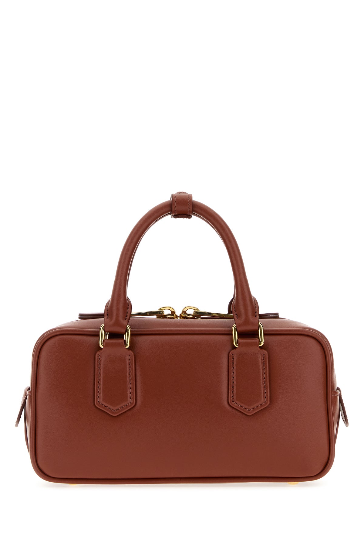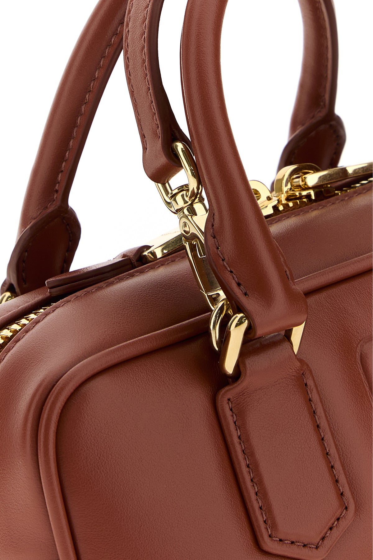 Handbag realized smooth leather enriched by tonal metal lettering logo at the front.