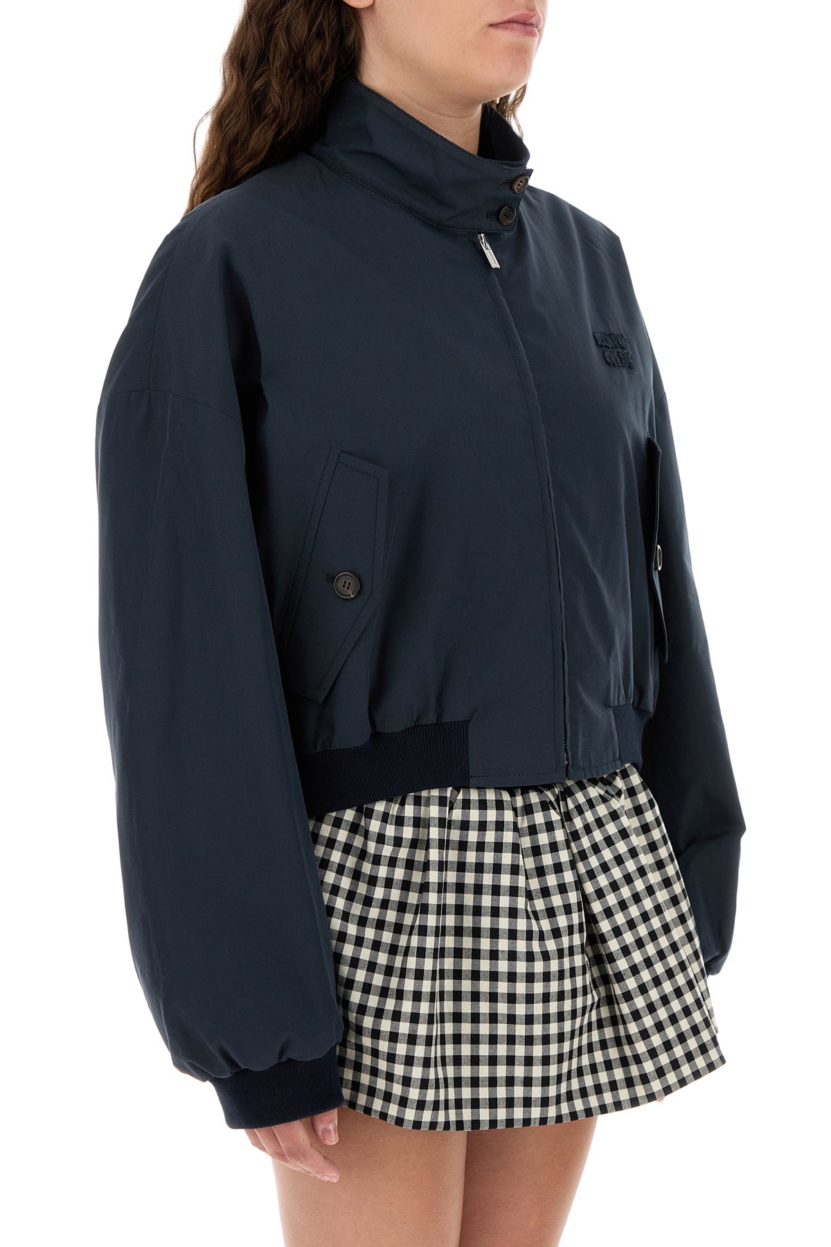 Bomber jacket realized in cotton blend enriched by tonal logoed patch on the chest.