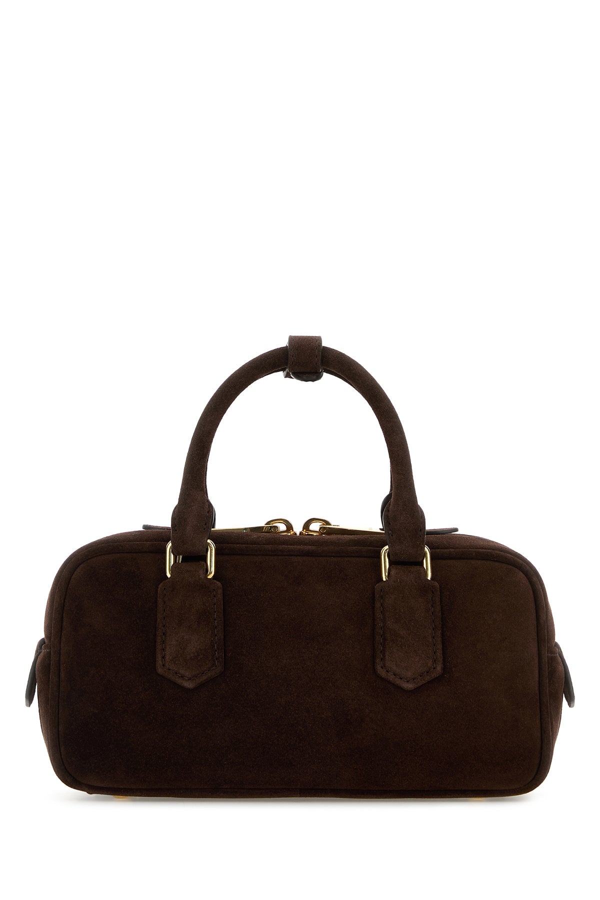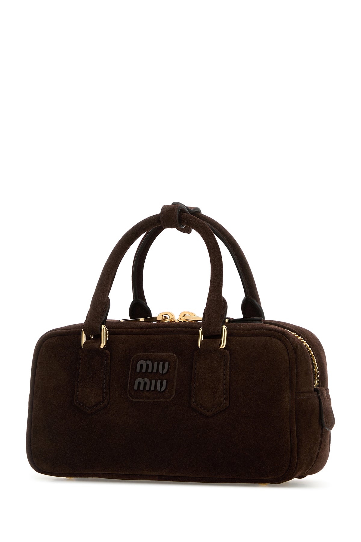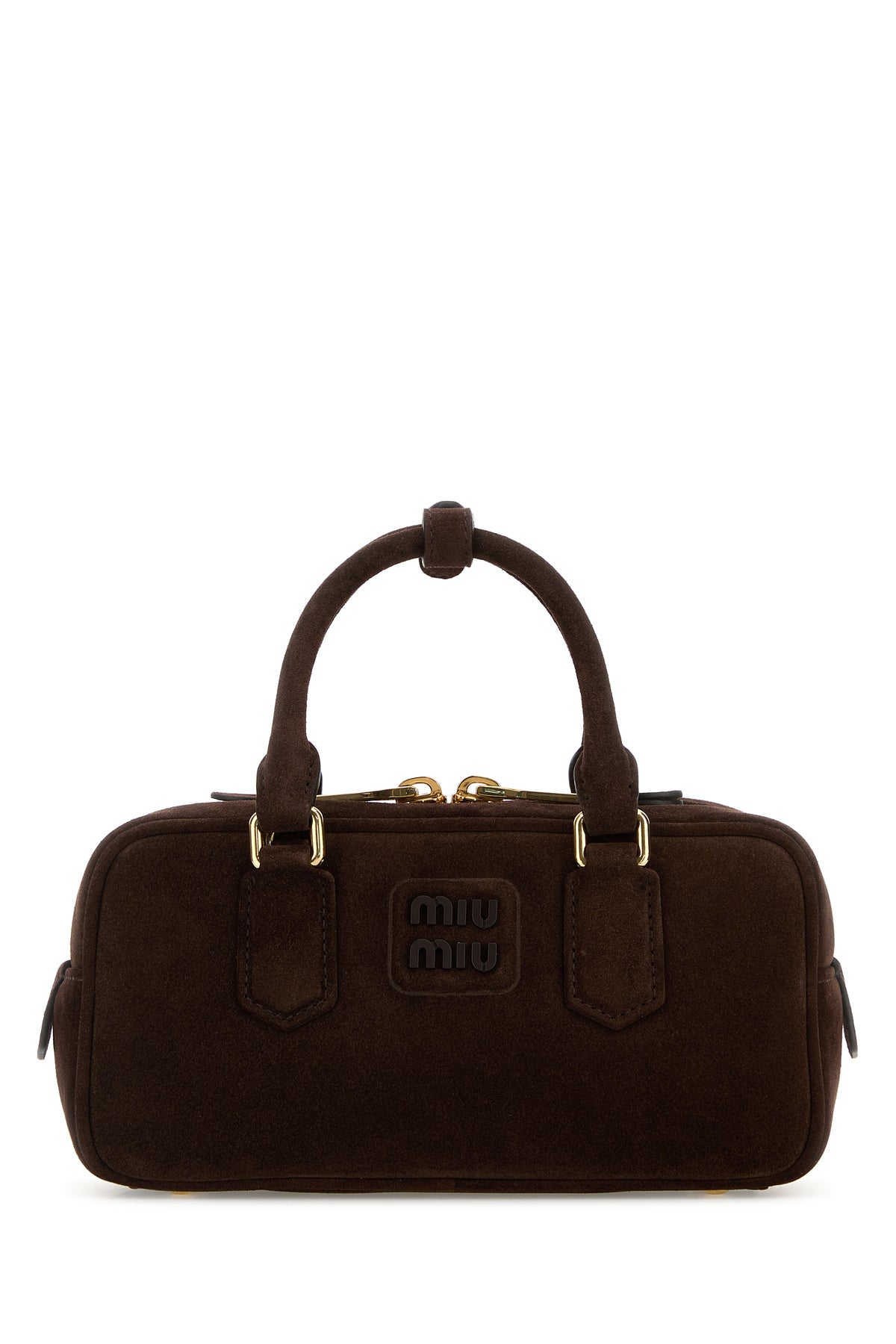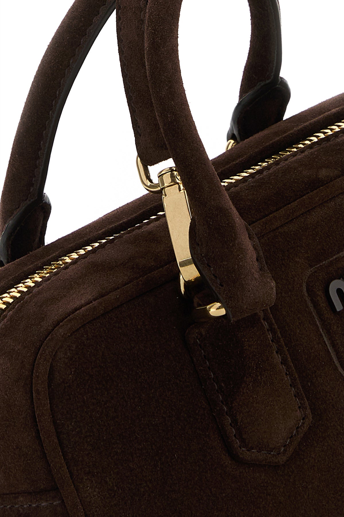 Handbag realized in suede enriched by tonal metal lettering logo at the front.