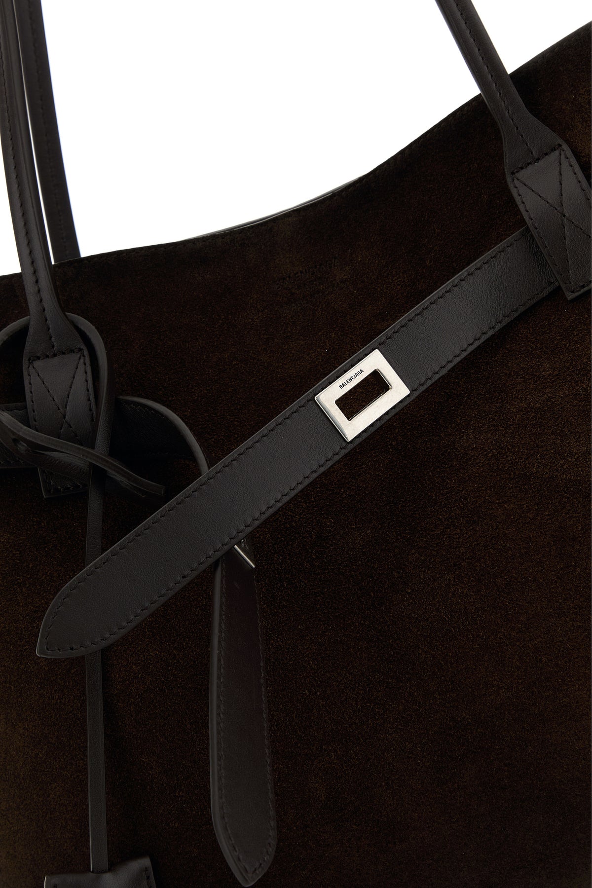 Shopping bag realized in calf suede characterized by calf suede characterized by embossed logo at the front enriched by smooth leather strap at the top.