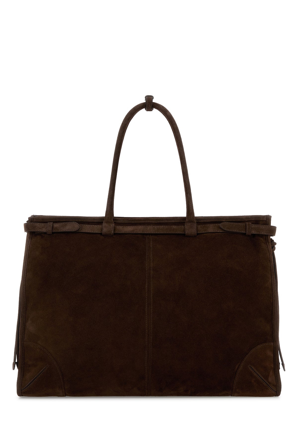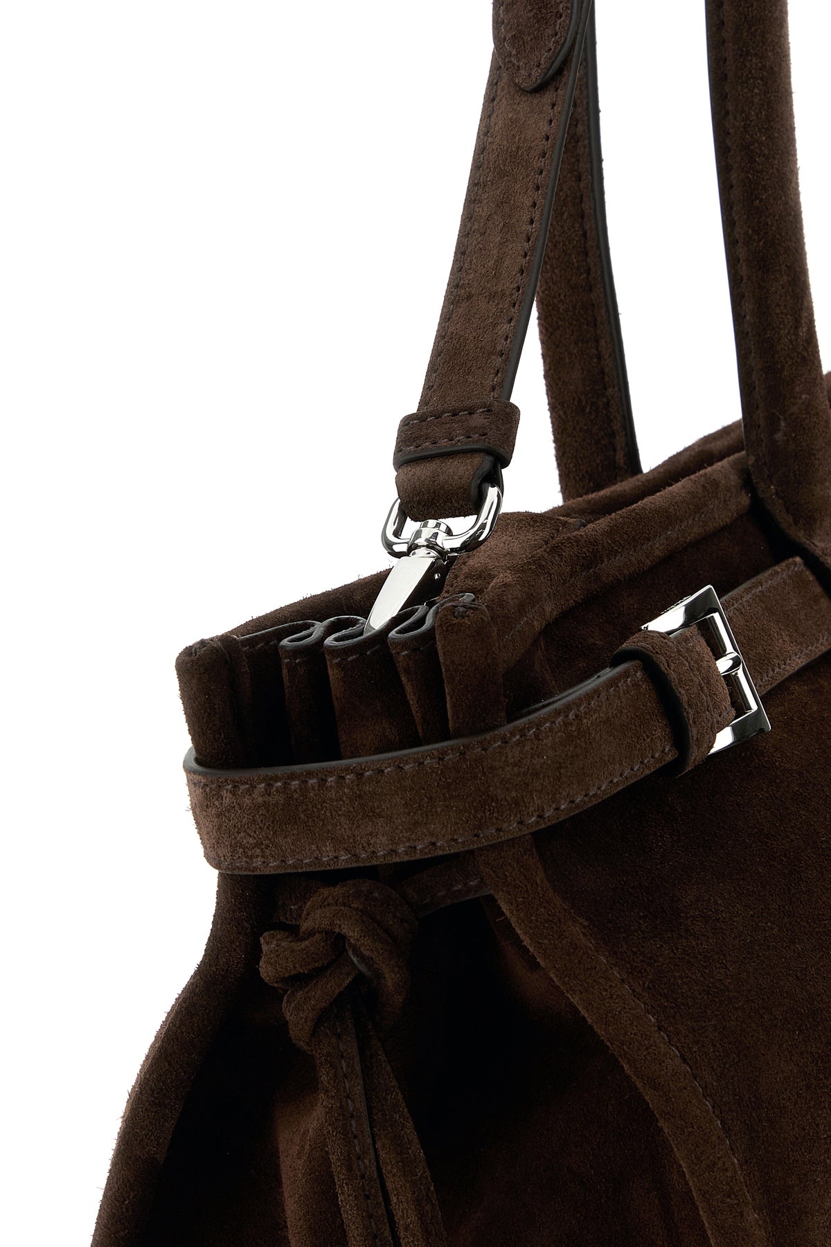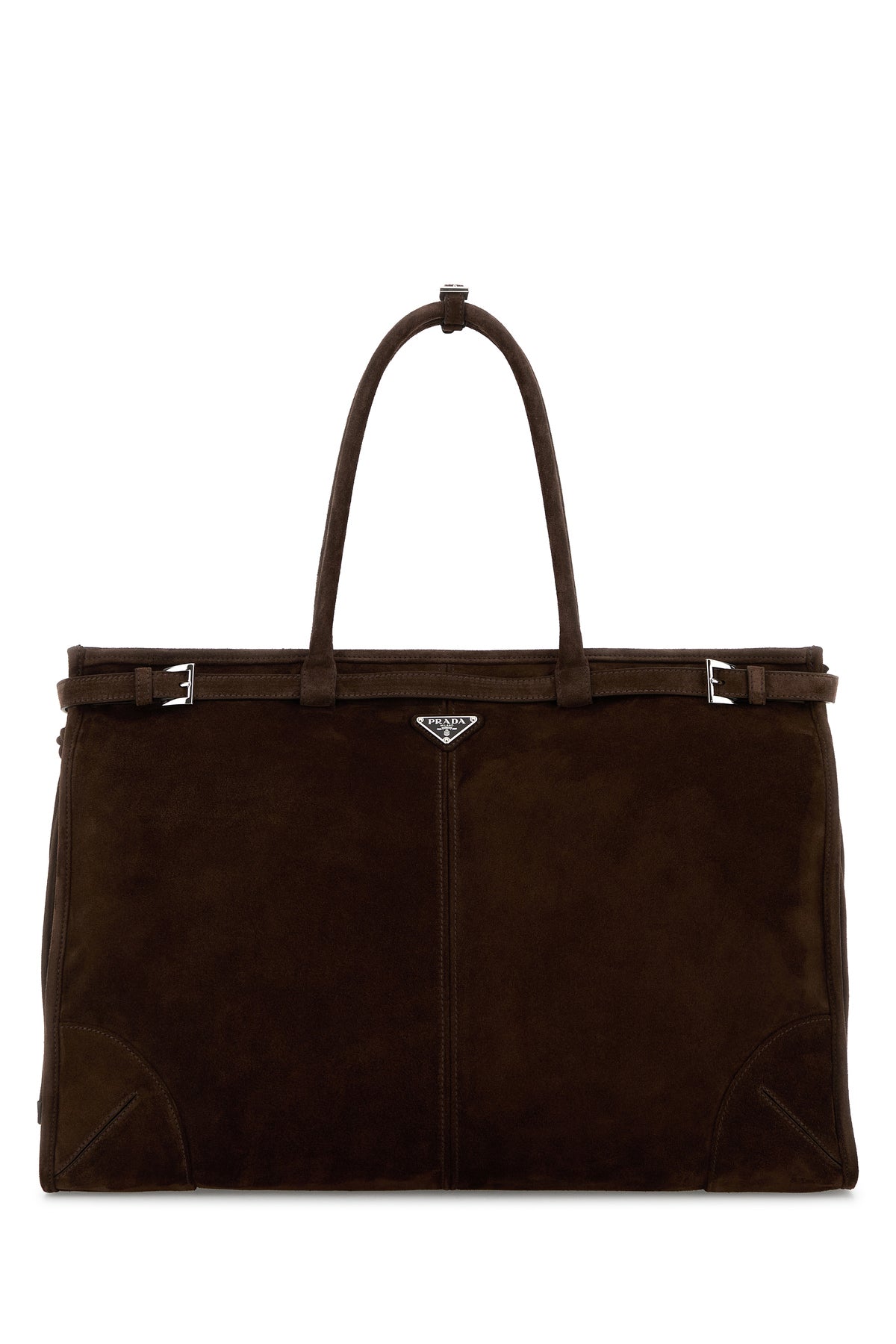 Shopping bag realized in calf suede enriched by metal iconic logoed triangle at the front and decorative straps with metal buckle at the top.