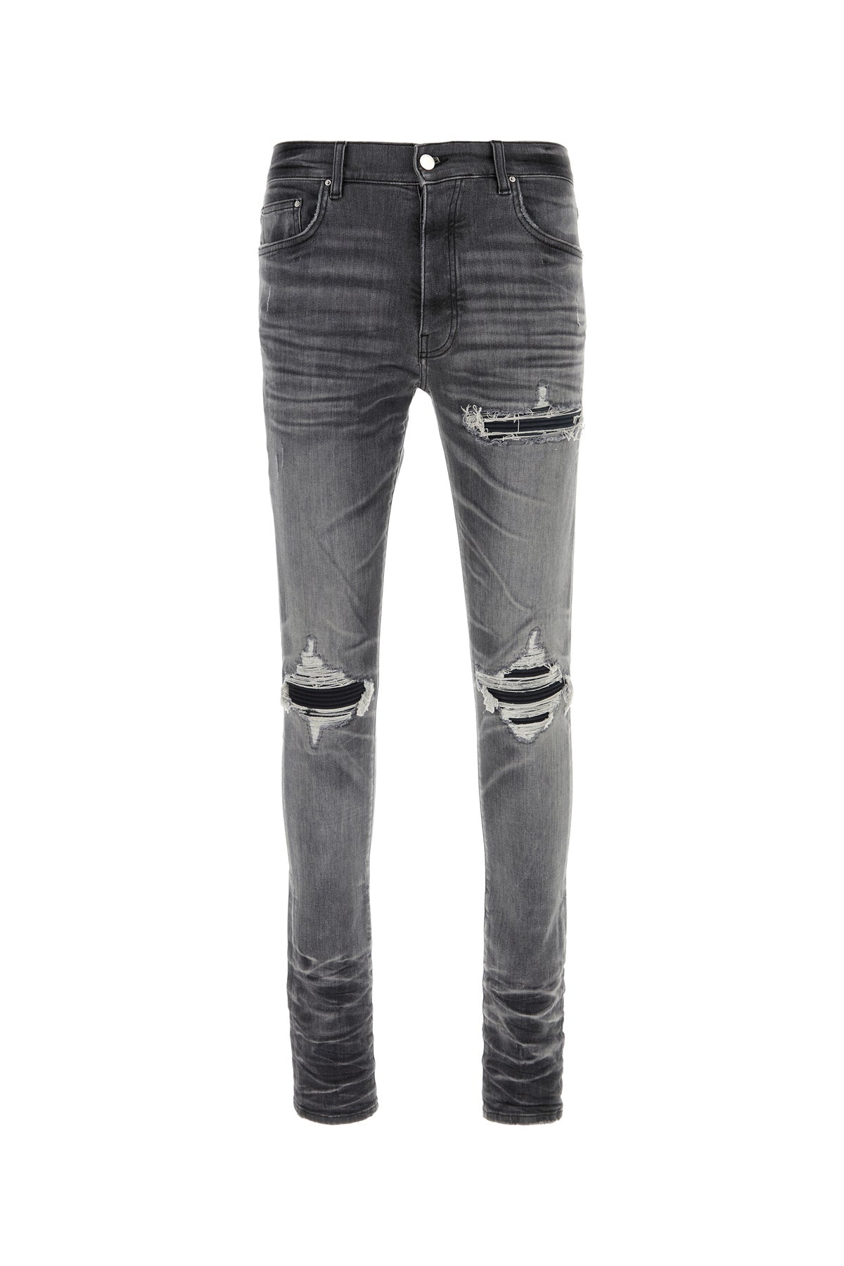 Jeans realize din stonewashed and distressed stretch cotton denim characterized by repaired rips.