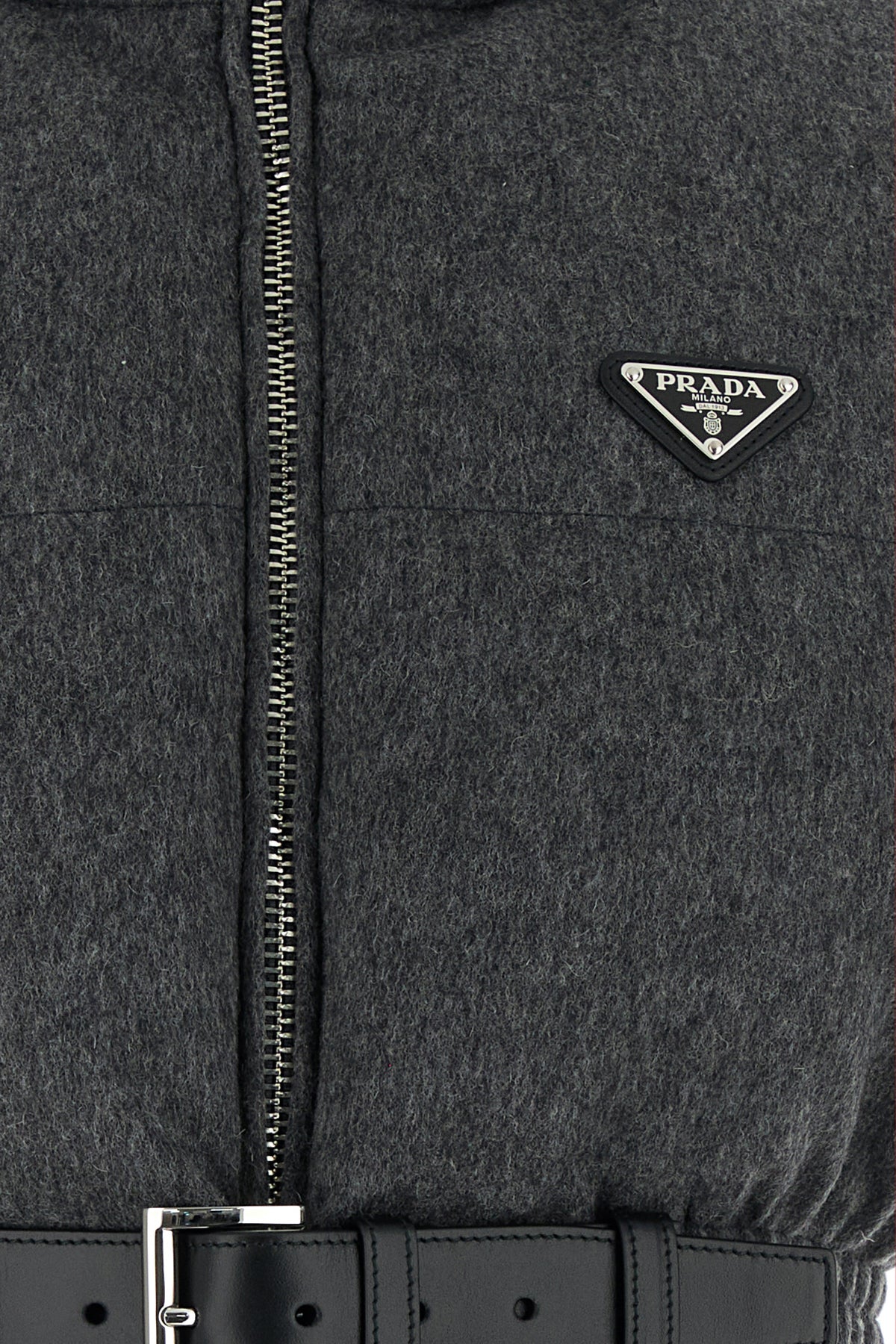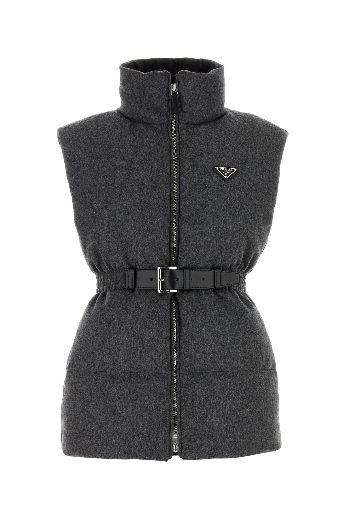 Sleeveless down jacket realized in pure virgin wool enriched by metal iconic logoed triangle on the chest.