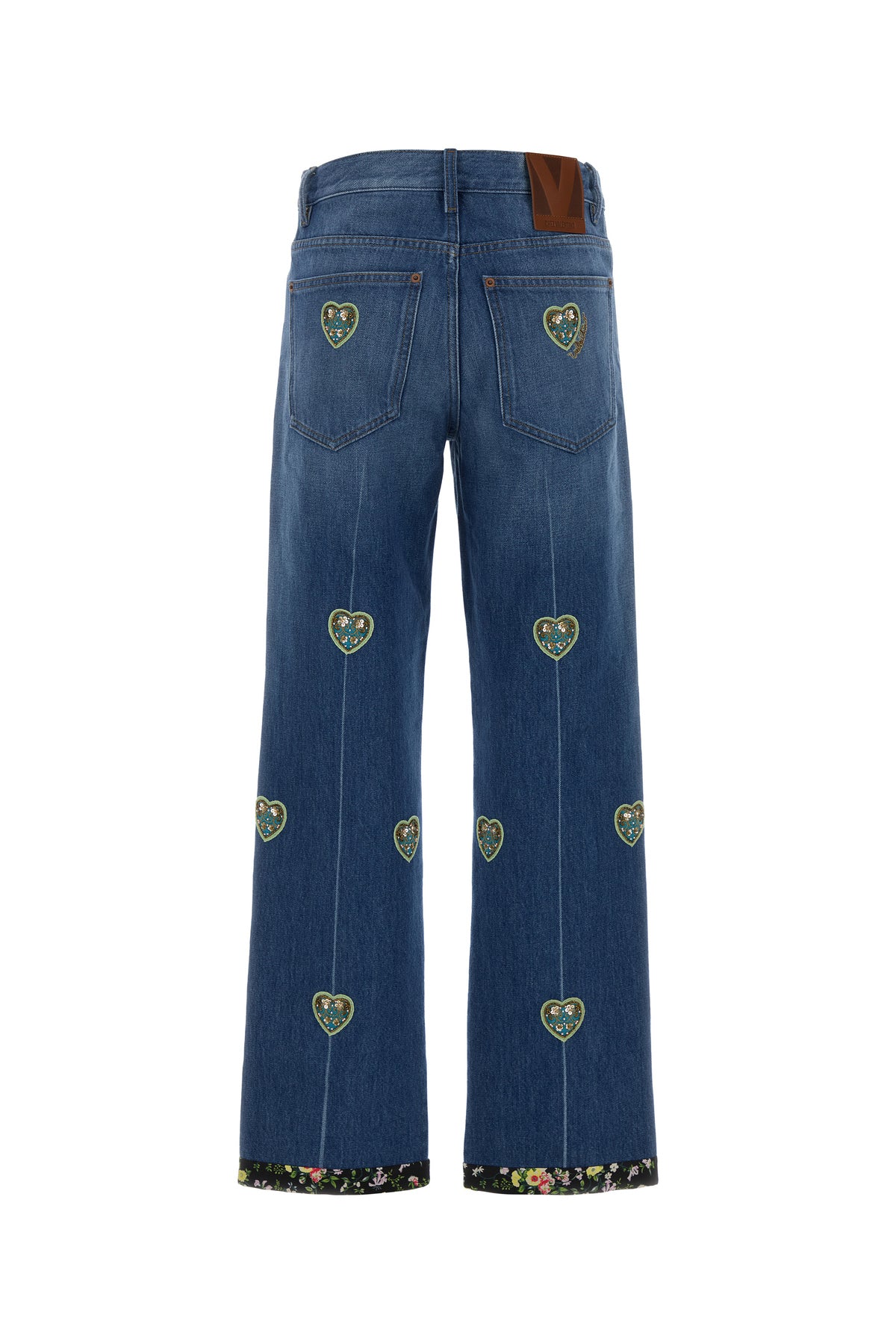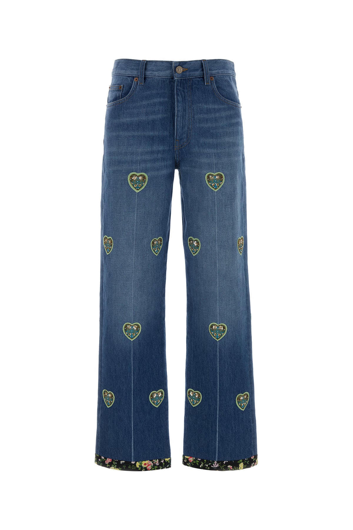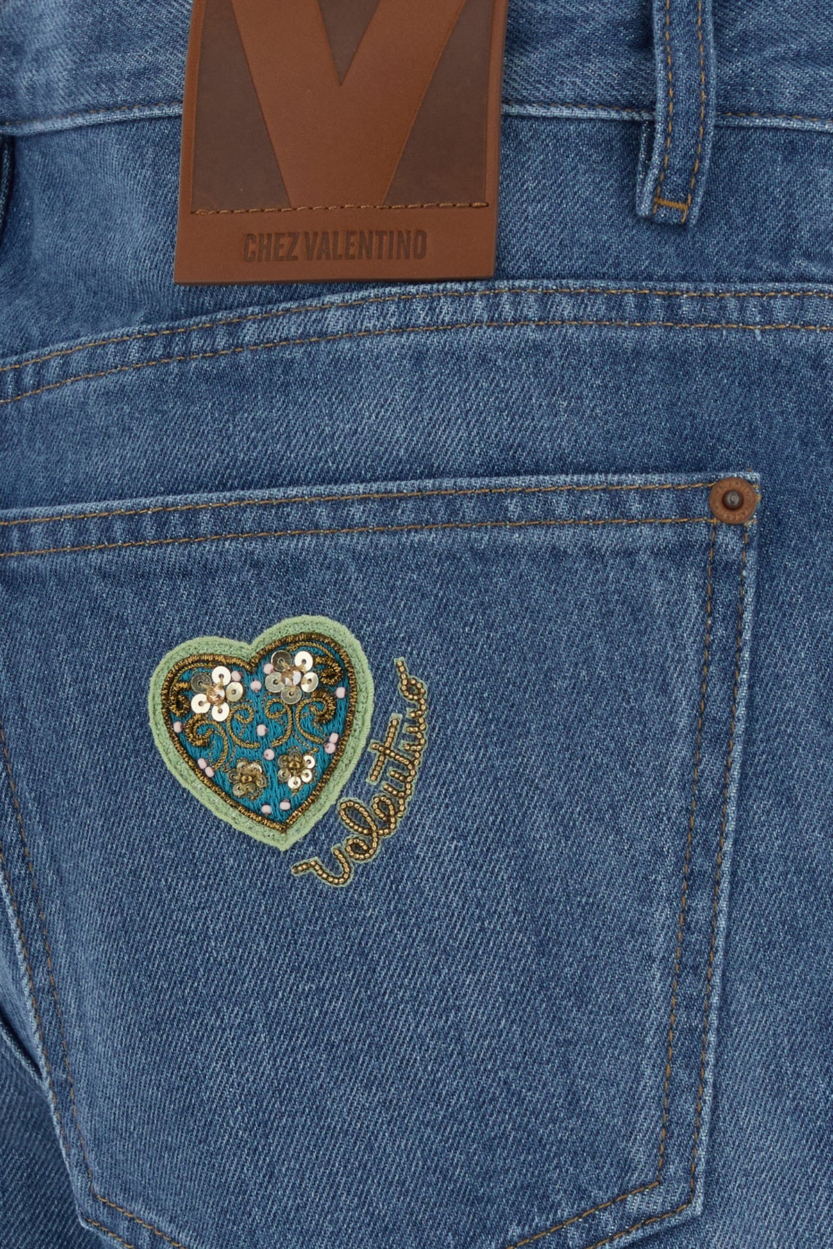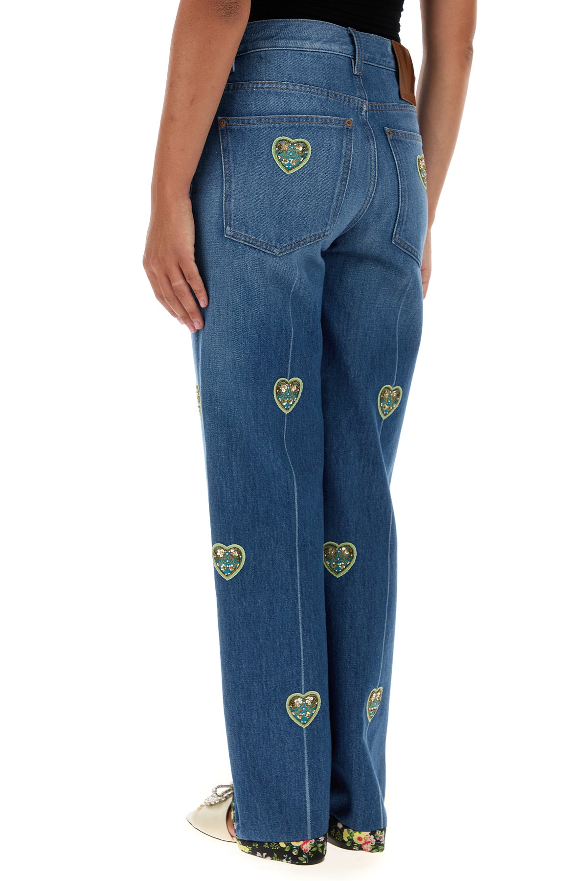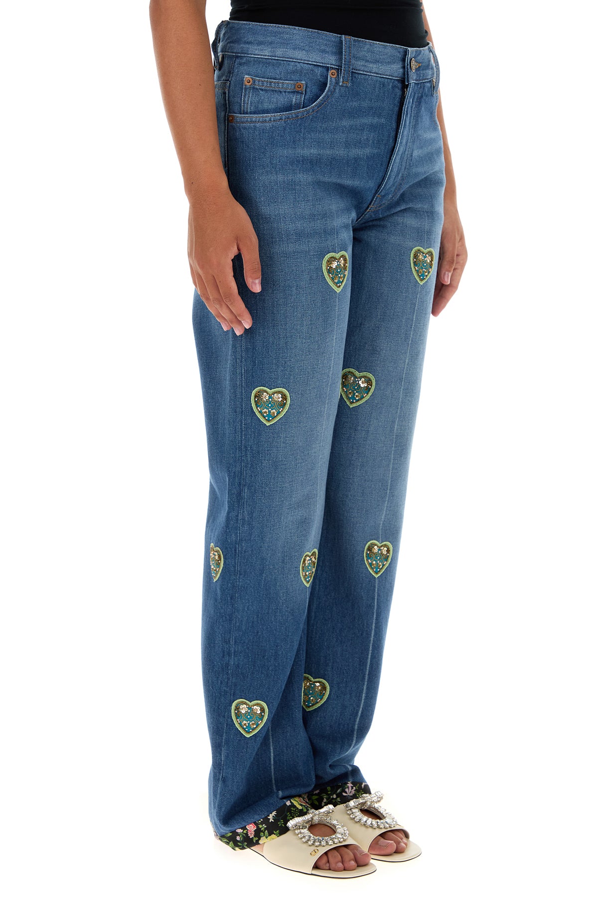 Jeans realized in pure cotton denim enriched by Hearts patches on the entire surface and floral fabric insert on the hemline.