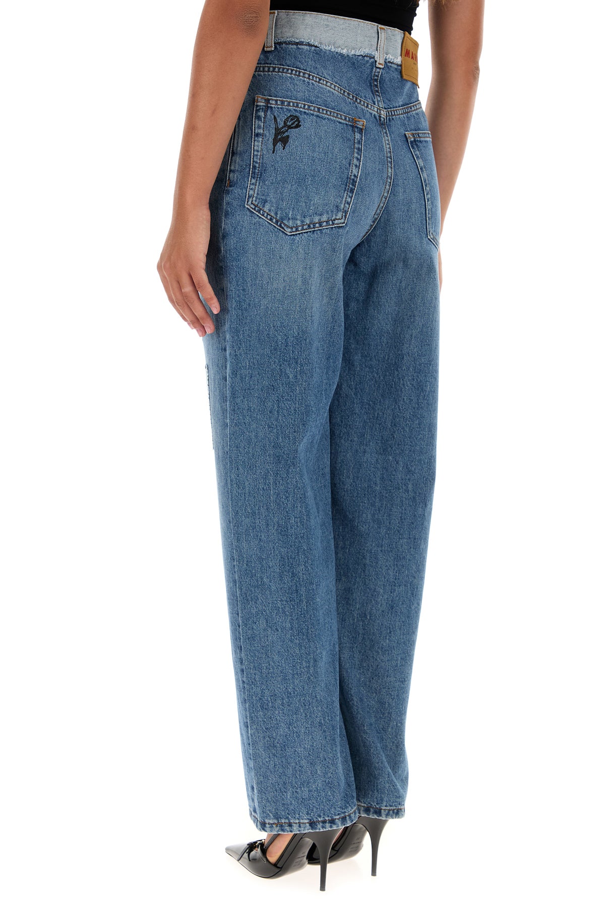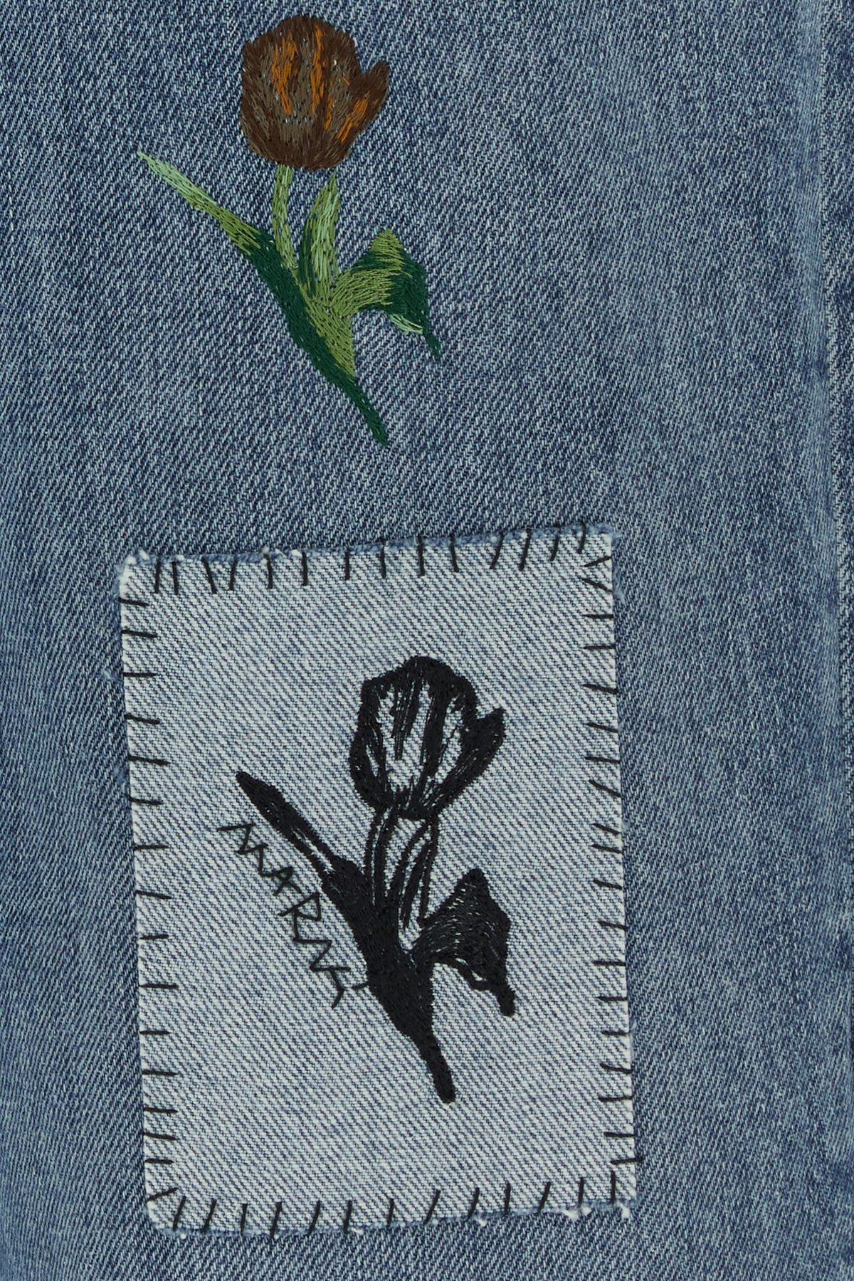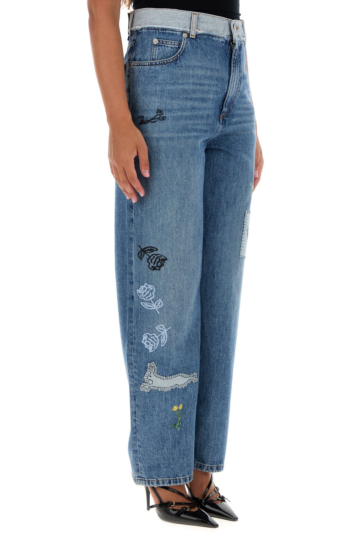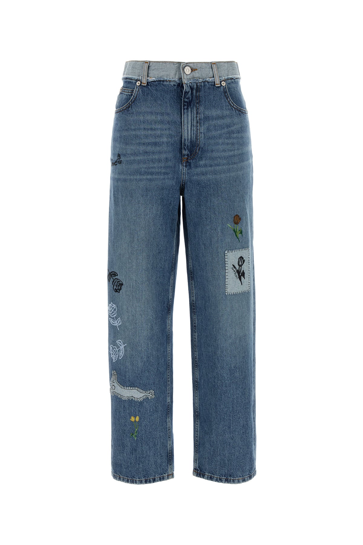 Jeans realized in stonewashed pure cotton denim characterized by floral embroidery on the entire surface.