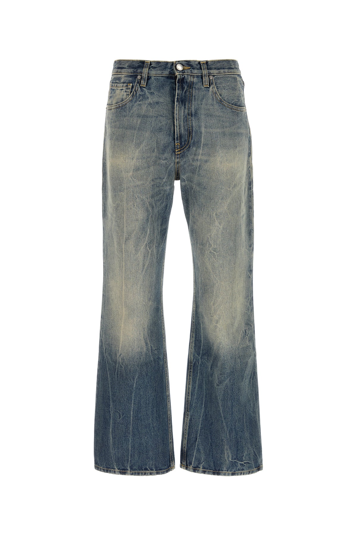 Jeans realized in vintage-effect stonewashed pure cotton denim enriched by logoed label at the back.