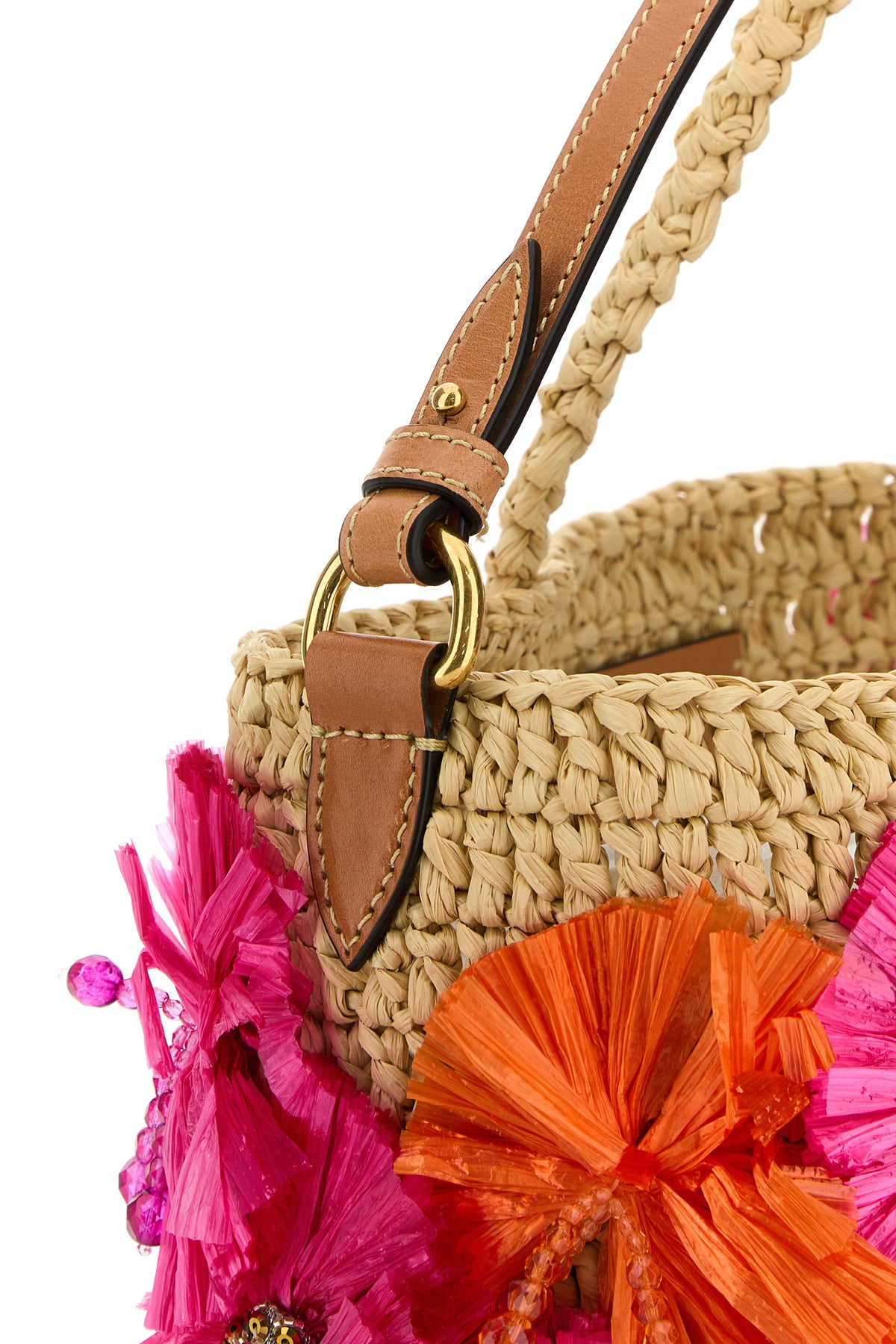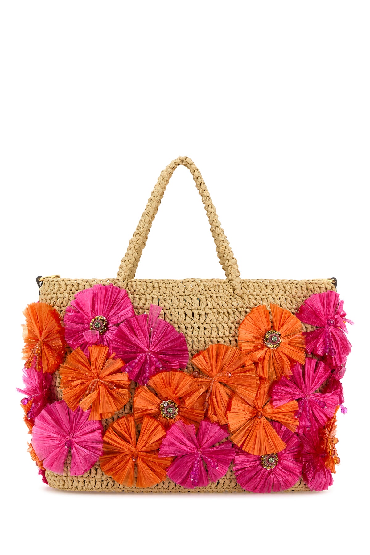 Shopping bag realized in rafia enriched by floral patch on the entire surface and VLogo Signature metal detail t the front.