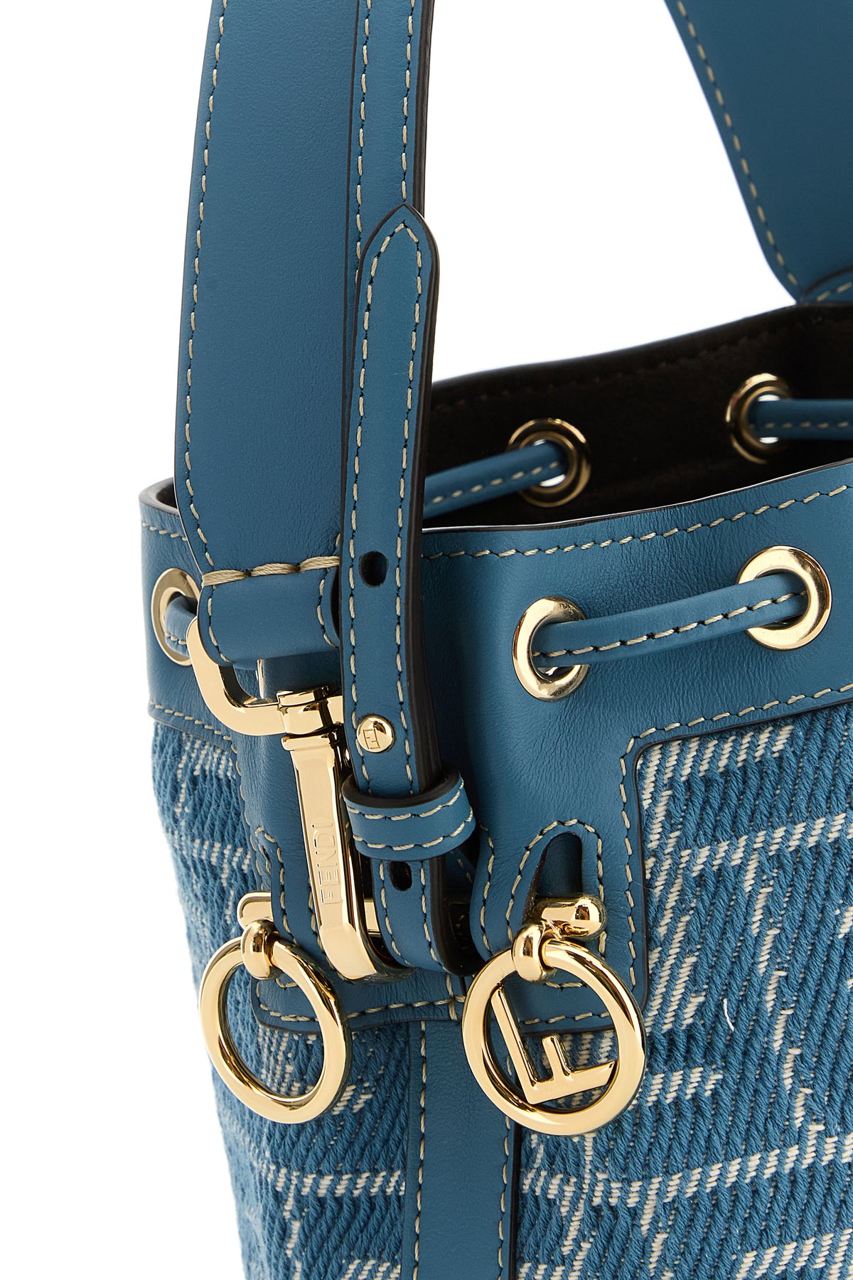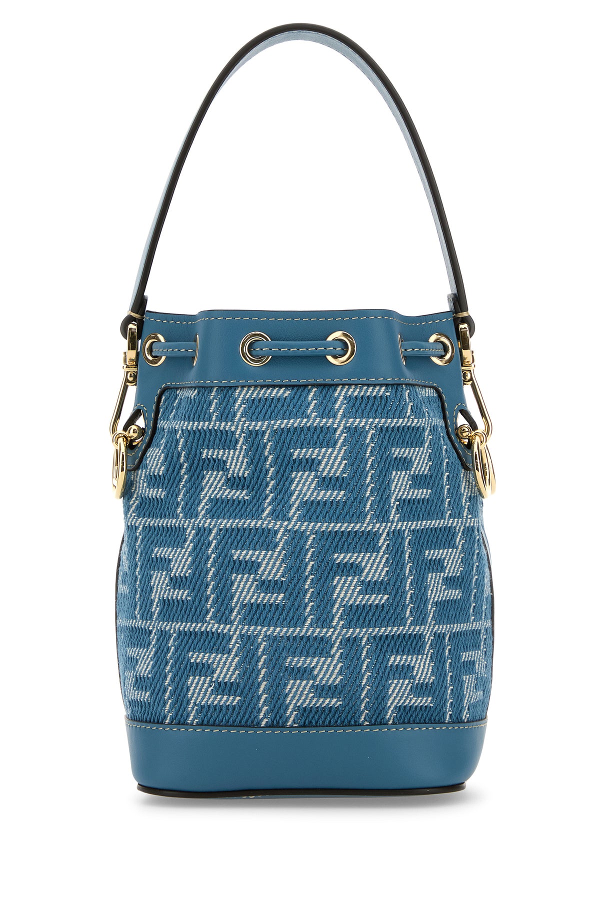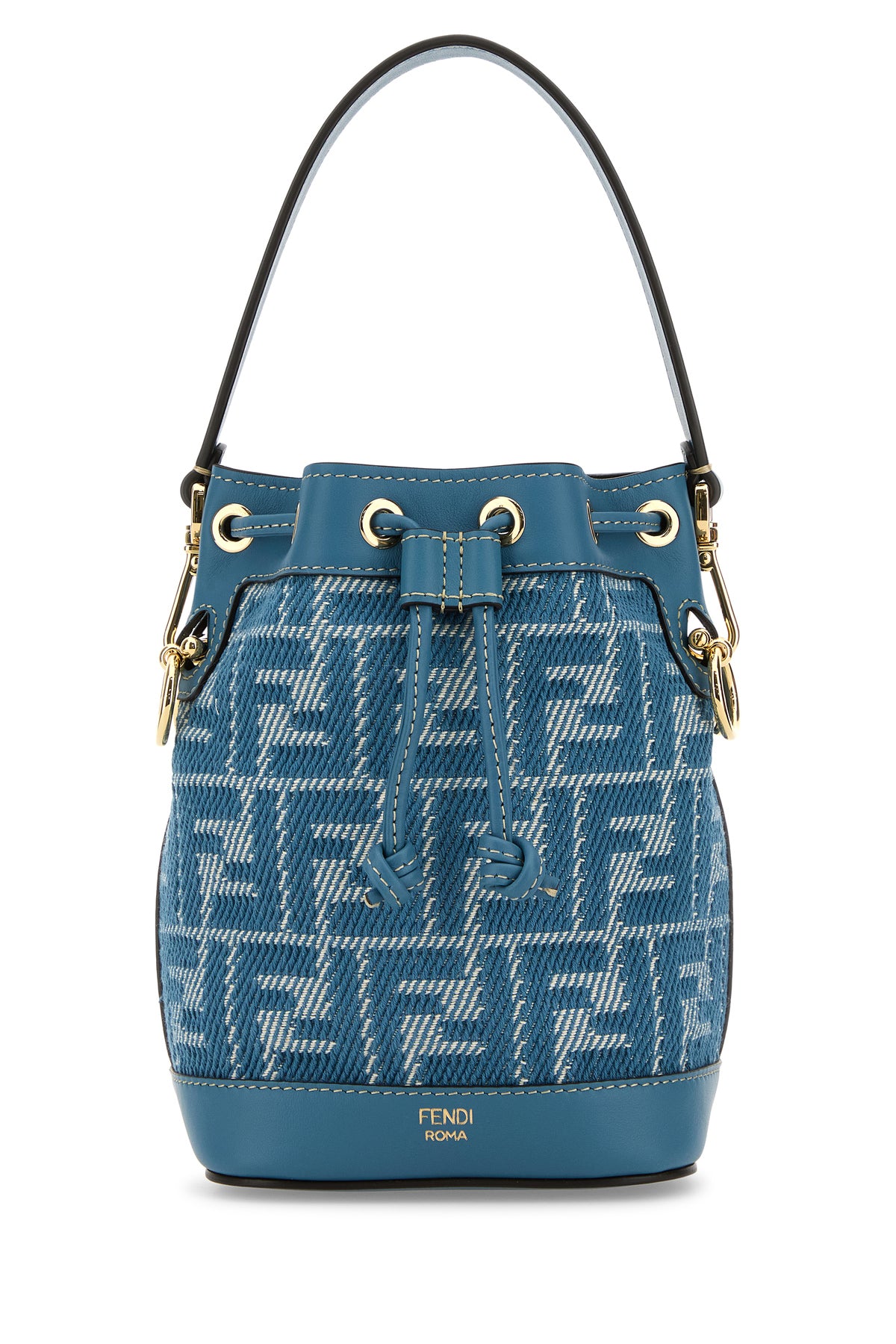 Bucket bag realized in canvas with smooth leather trimmings characterized by FF motif embroidery on the entire surface and laminated printed logo at the front enriched by logoed metal details.