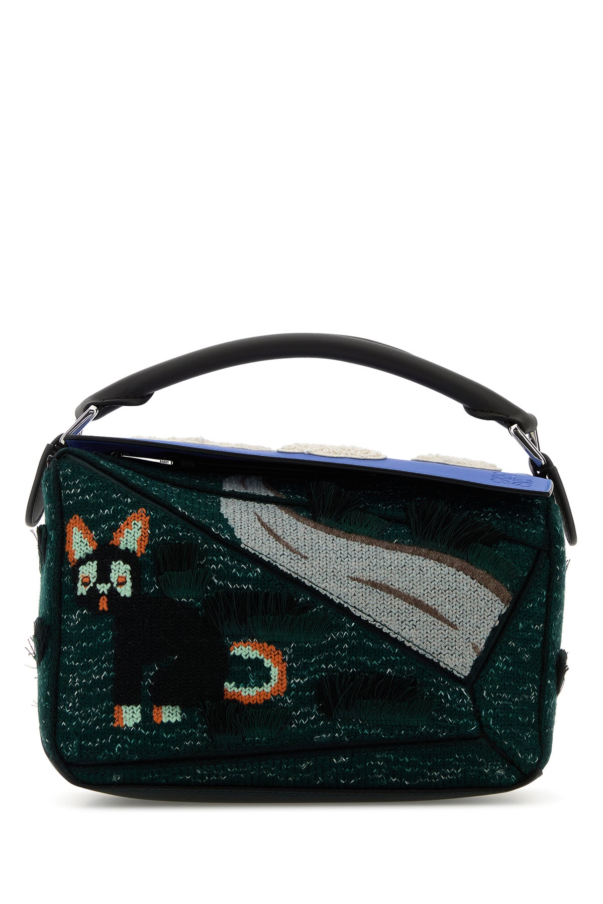 Handbag realized in fabric characterized by Futurist Cat embroidery on the entire surface, iconic geometric motif on the entire surface and embossed Anagram motif on the flap.