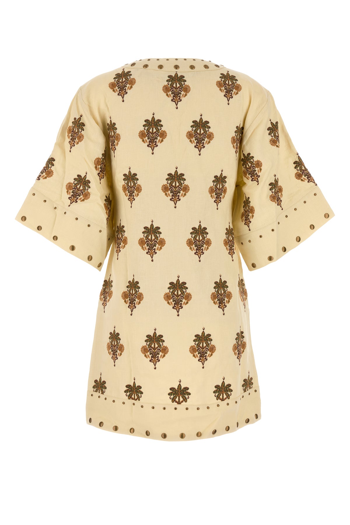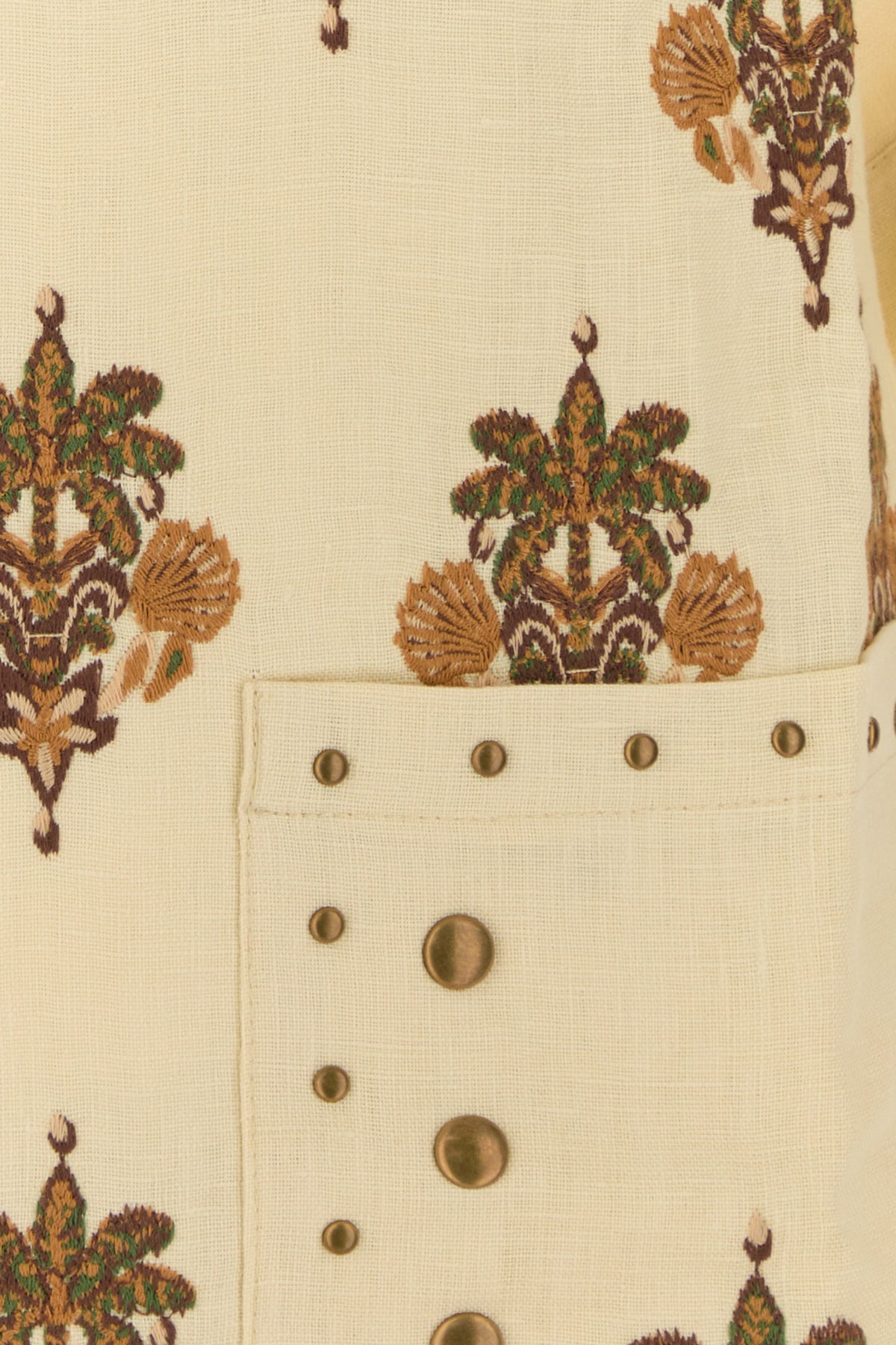 Tunic dress realized in pure linen characterized by Coconut Tree Tapestry embroidery on the entire surface enriched by metal studs.