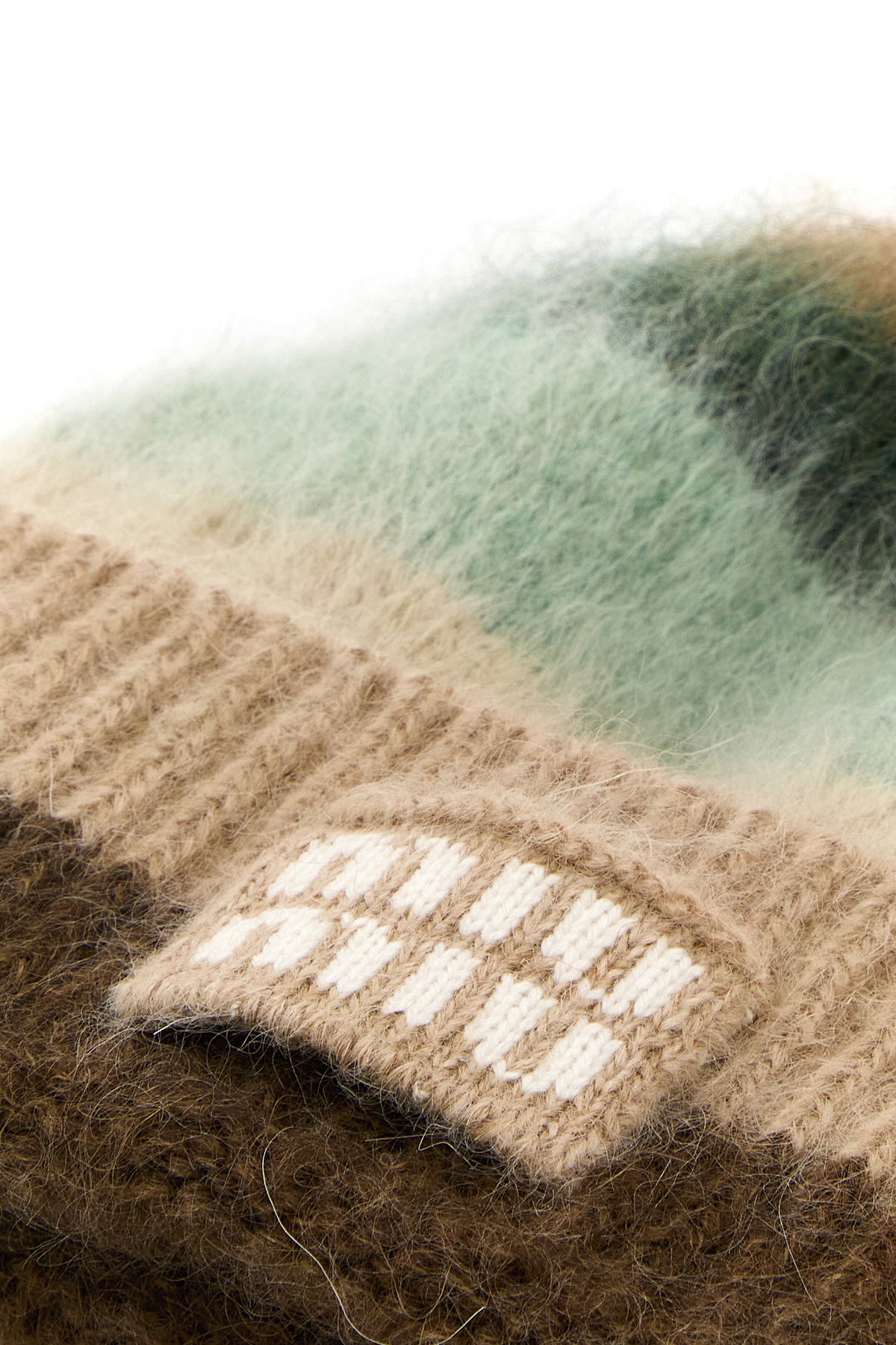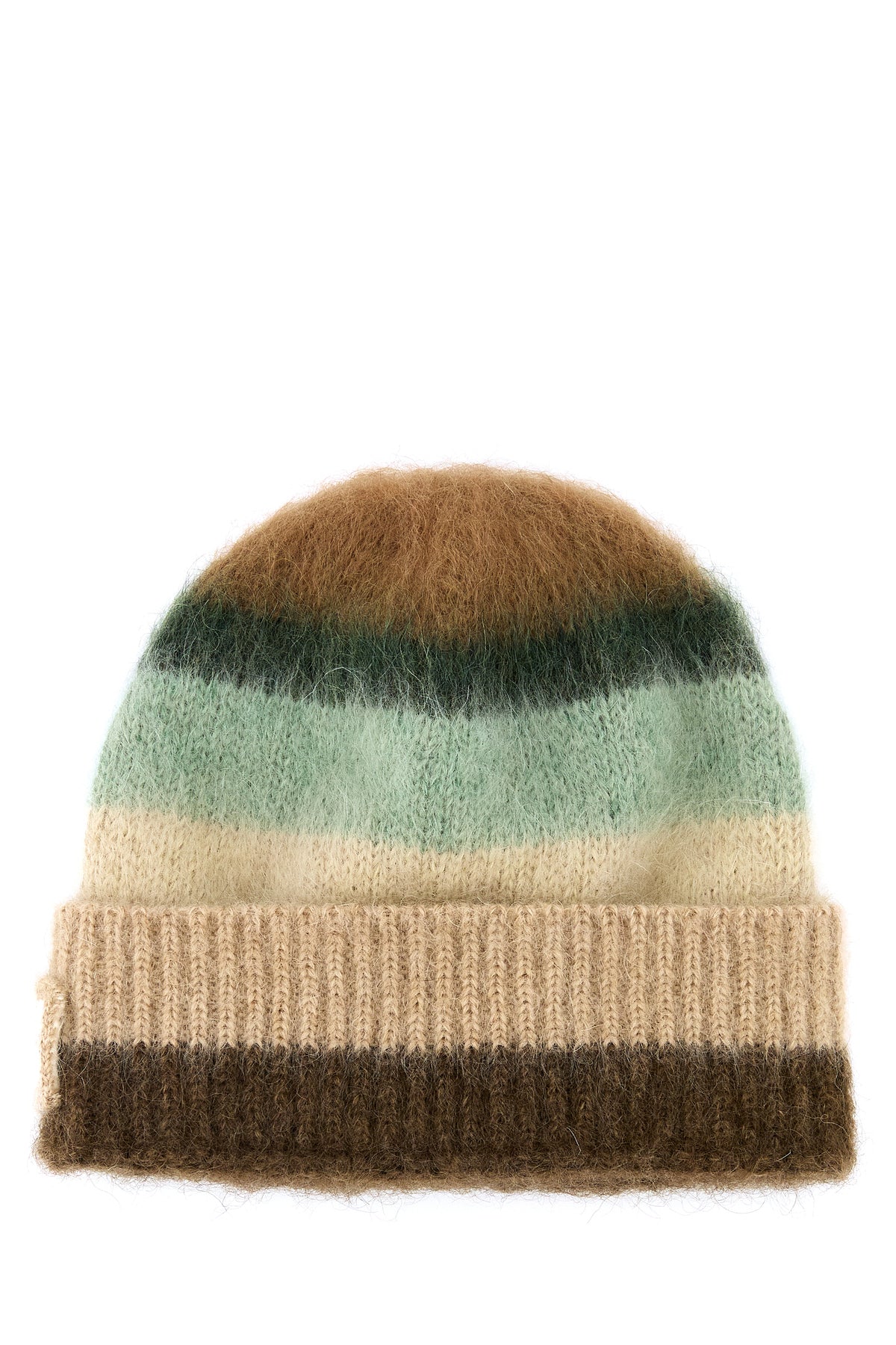 Beanie hat realized in mohair blend characterized by striped embroidery on the entire surface enriched by logoed label on the side.